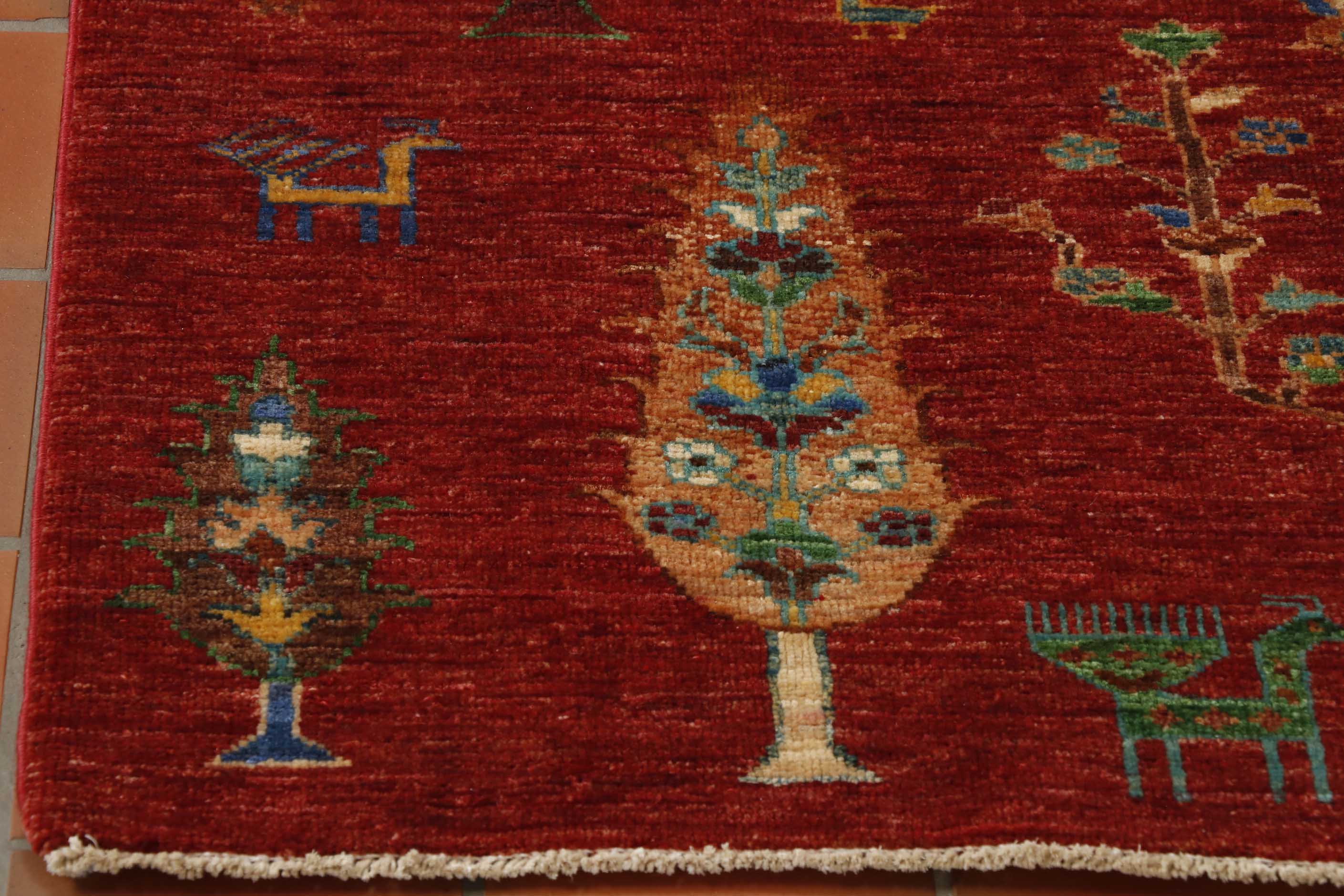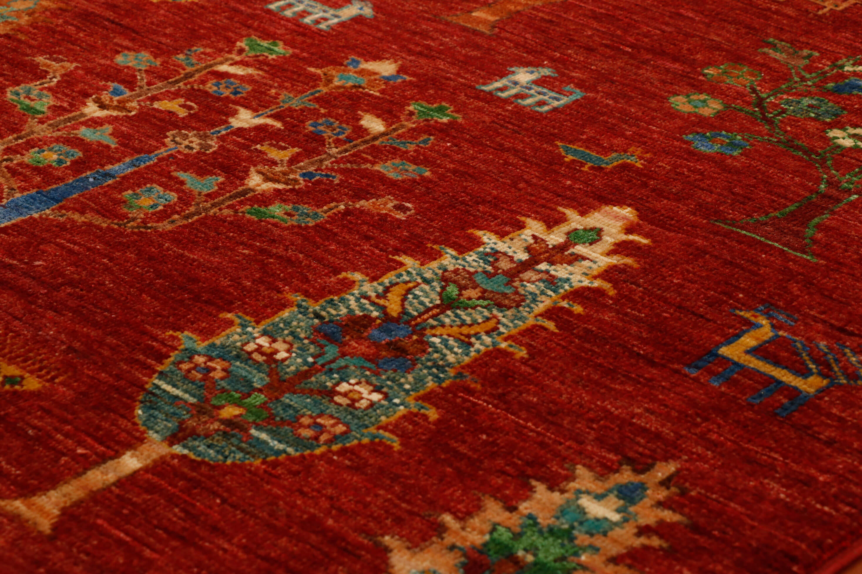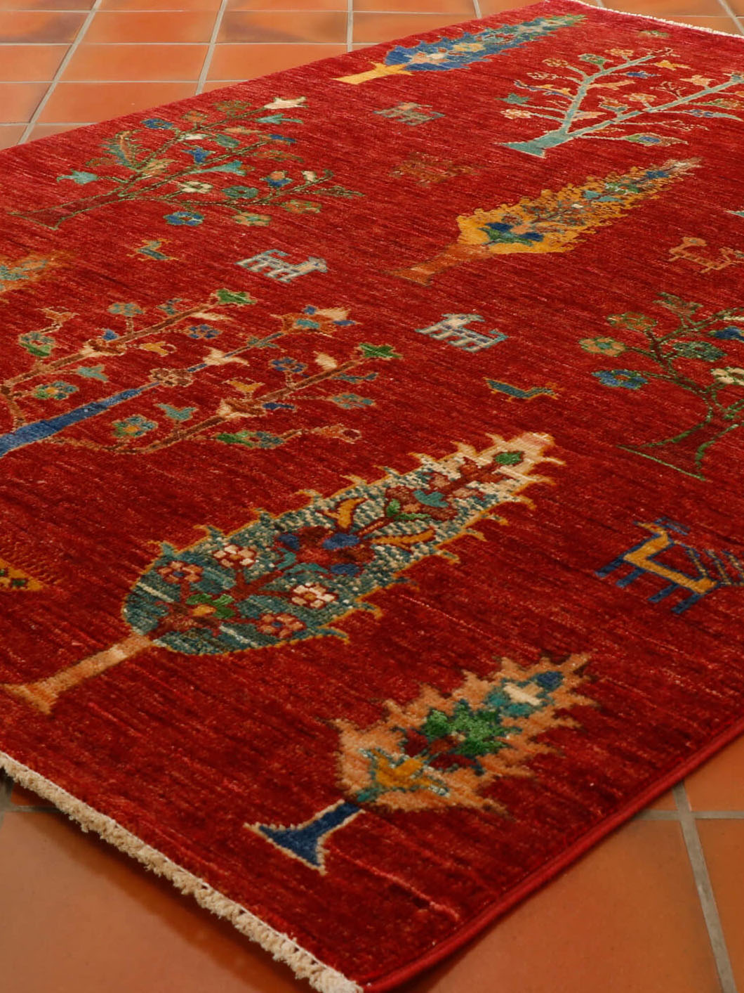 Striking Afghan Shahi rug with a rich red background and different trees, stylised birds and animals. The weaver has used an exciting mix of colours for the design, including royal blue, tangerine, teal, dark green and cream. Random stylised birds and animals have been added to give extra character. It is made from Afghan vegetable-dyed hand-spun wool woven onto a cotton foundation.