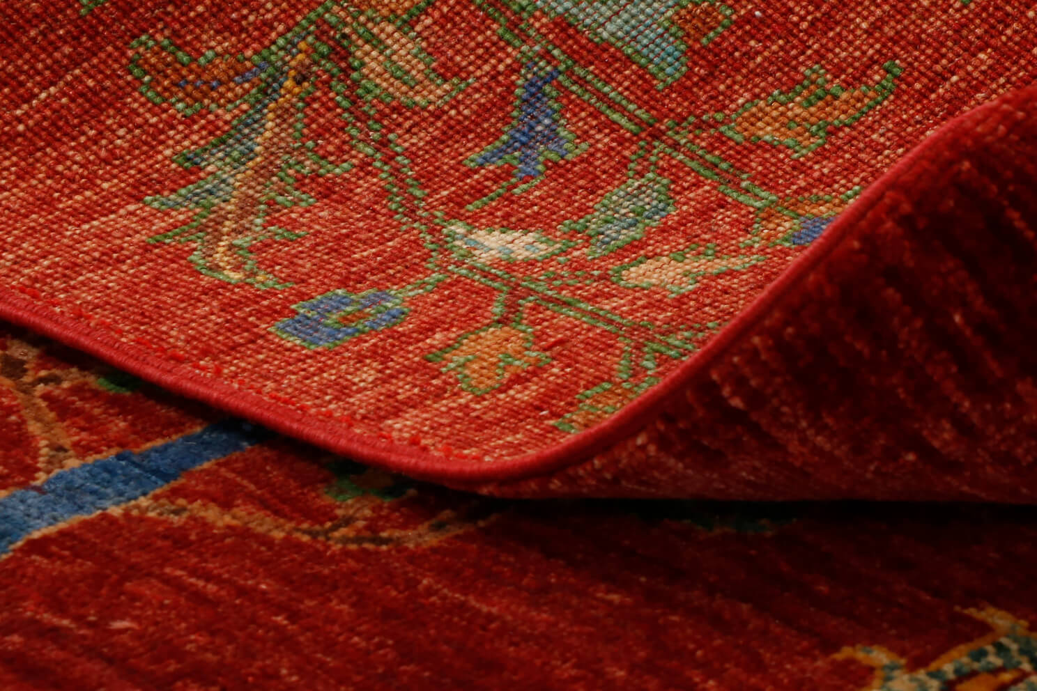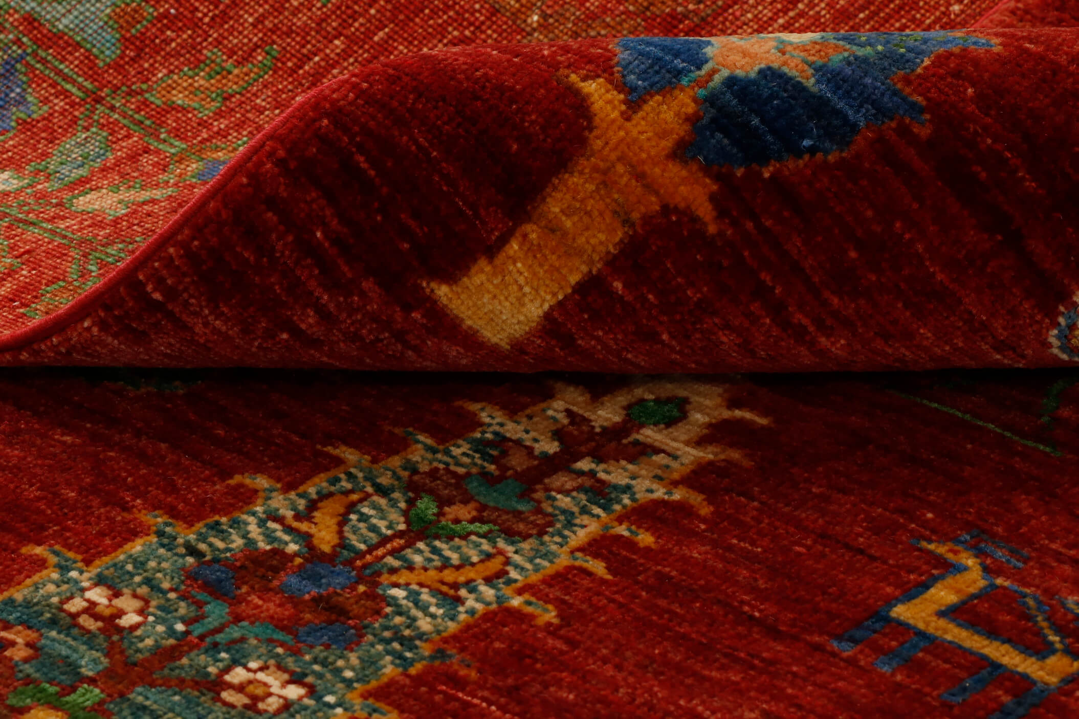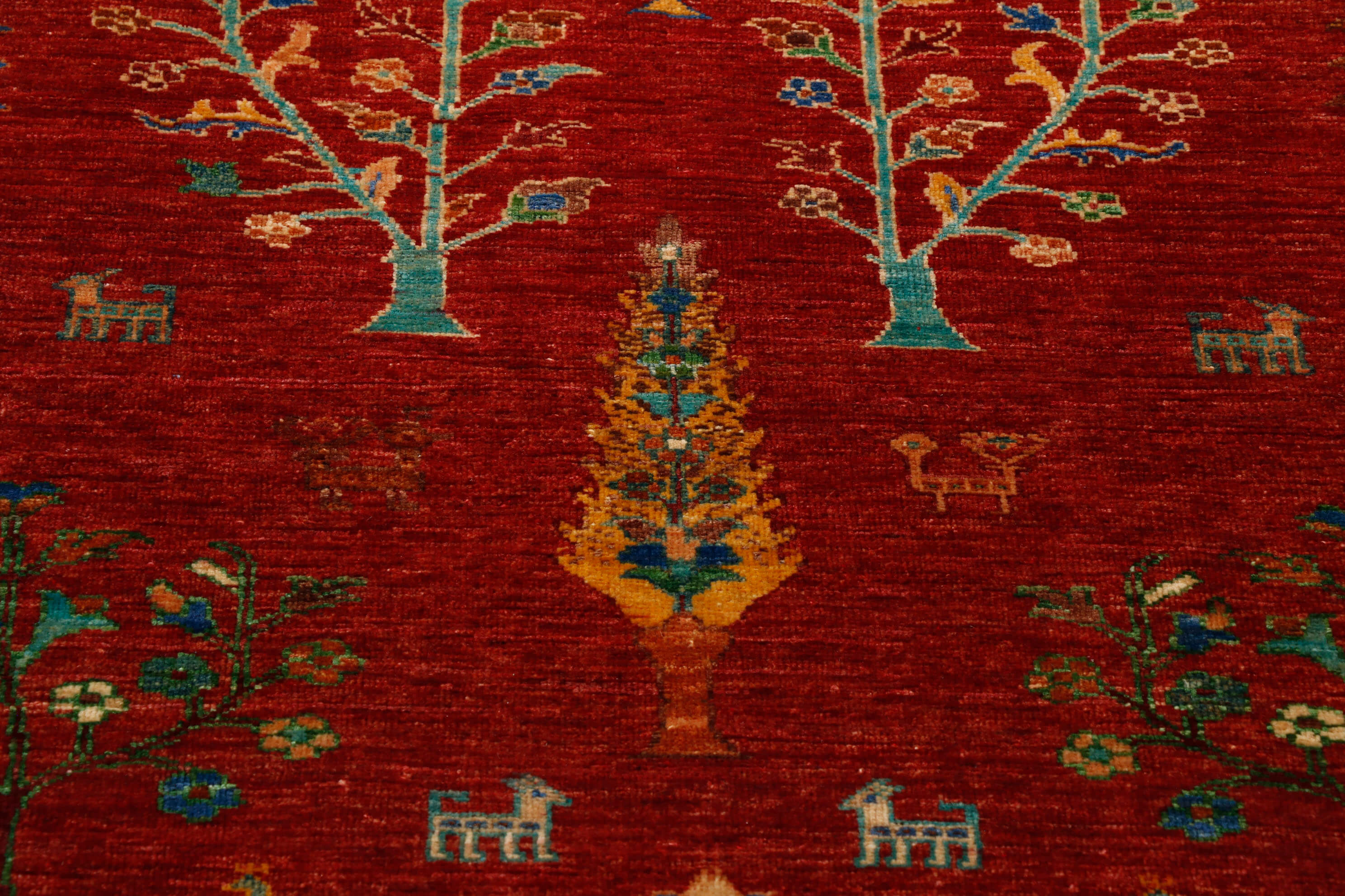 Striking Afghan Shahi rug with a rich red background and different trees, stylised birds and animals. The weaver has used an exciting mix of colours for the design, including royal blue, tangerine, teal, dark green and cream. Random stylised birds and animals have been added to give extra character. It is made from Afghan vegetable-dyed hand-spun wool woven onto a cotton foundation.