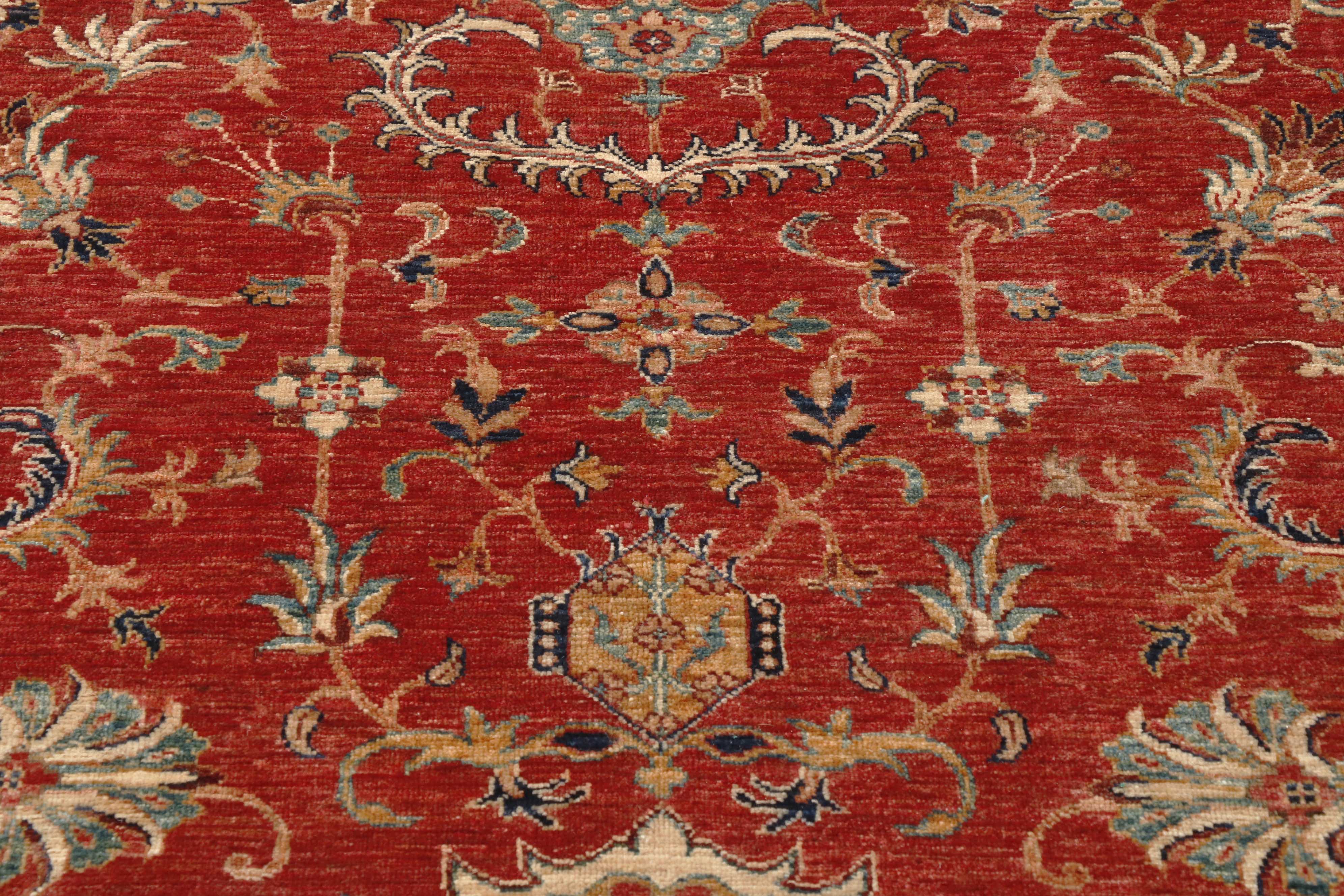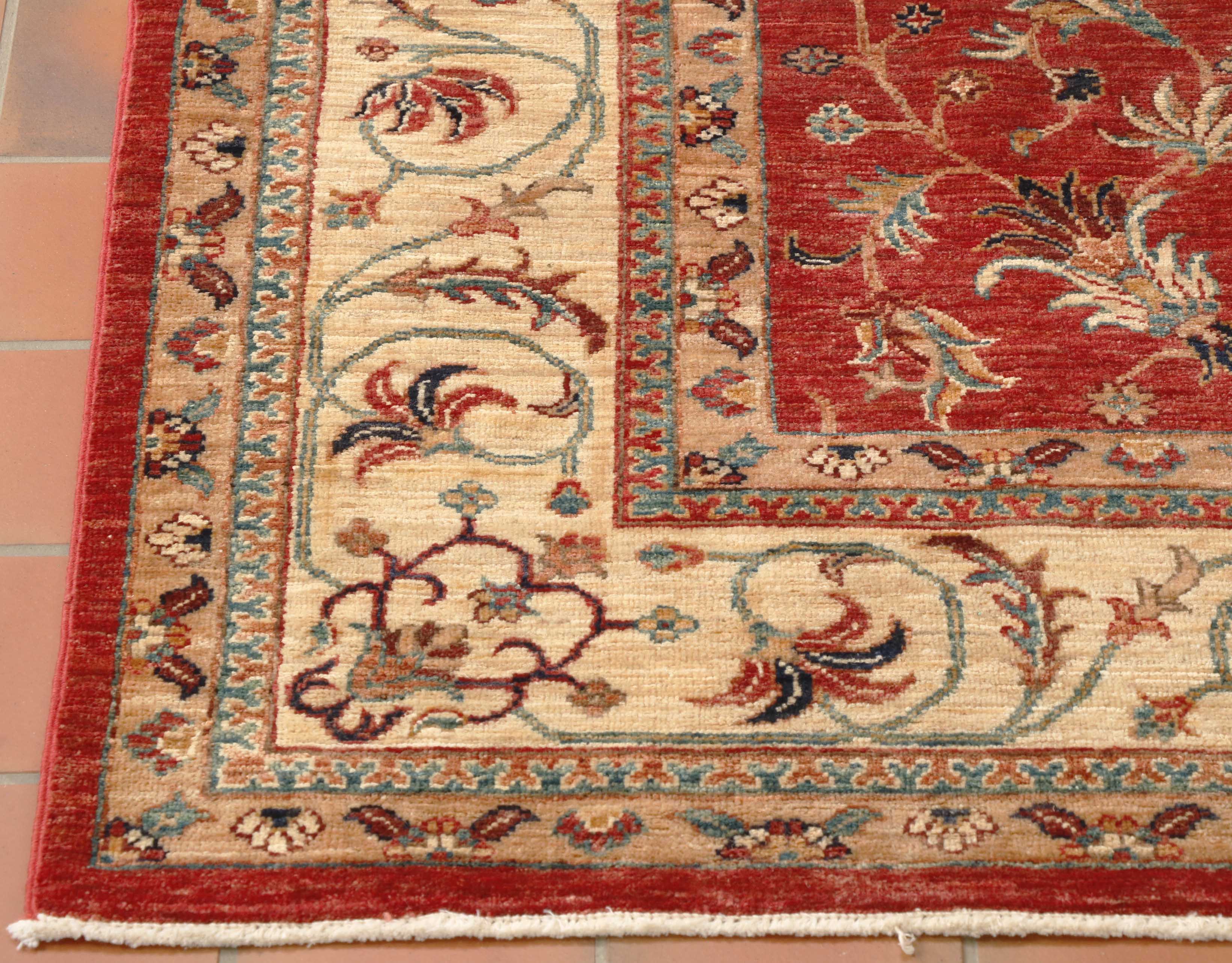 The tomato-red background and cream border make this a light-coloured rug overall, but the red imparts a rich warmth. The classic pattern is pleasing to the eye, featuring a simple curvilinear border. This rug is of superb quality and practical for any room in the home.