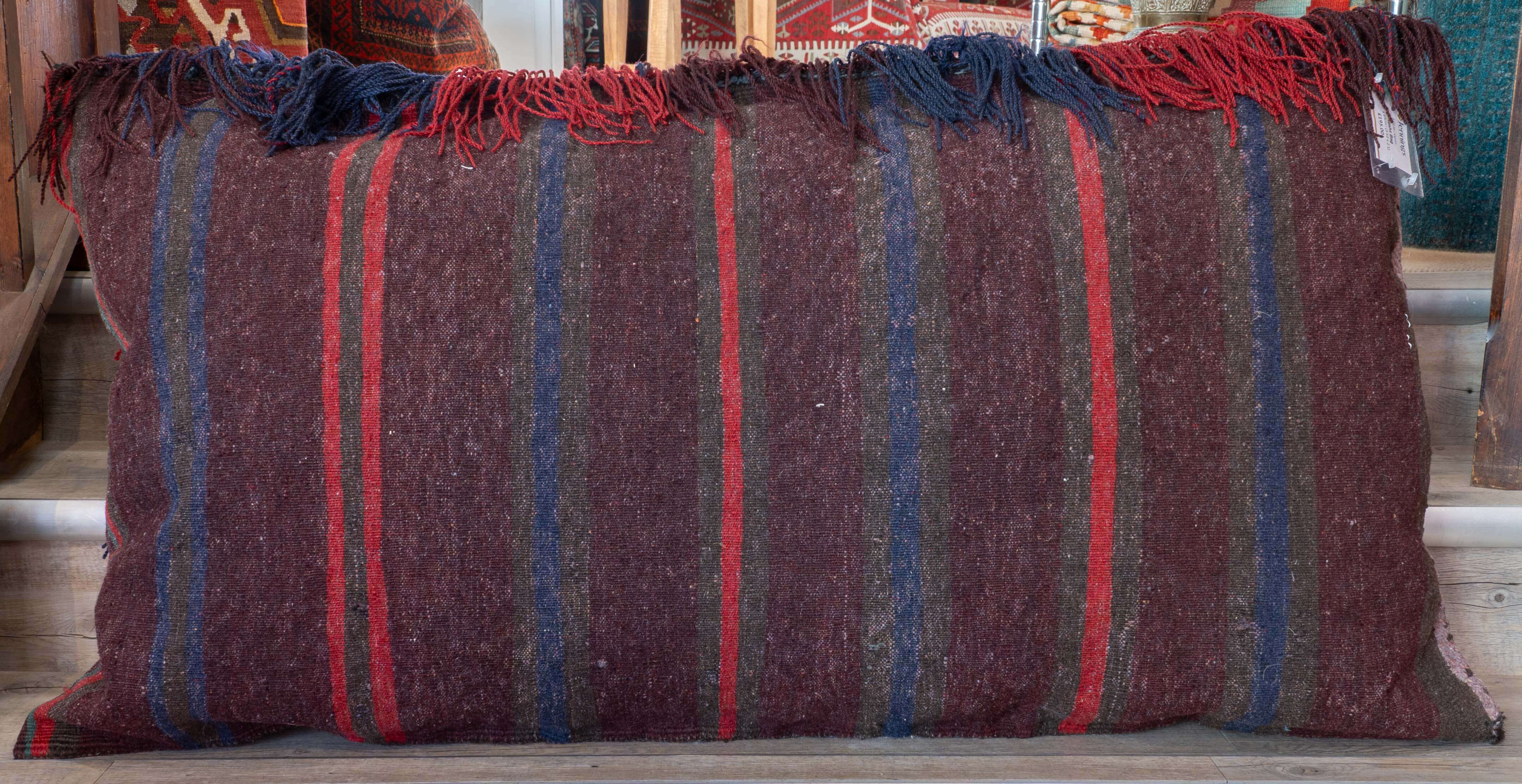 A bolesht bag is a long, narrow bag, usually with a carpet pile on one side and flatweave (kelim) on the reverse. Often, these will be decorated with tassels, beads, buttons and sometimes even shells. Tribal or nomadic people use the bags and normally store their bedding during the day, which also acts as a floor cushion. They are handmade from vegetable-dyed wool and often have loops threaded together and a stick fed through them so the bag does not lose its contents. They are generally in the red and brown colour spectrum, with a traditional design used by that particular tribe.