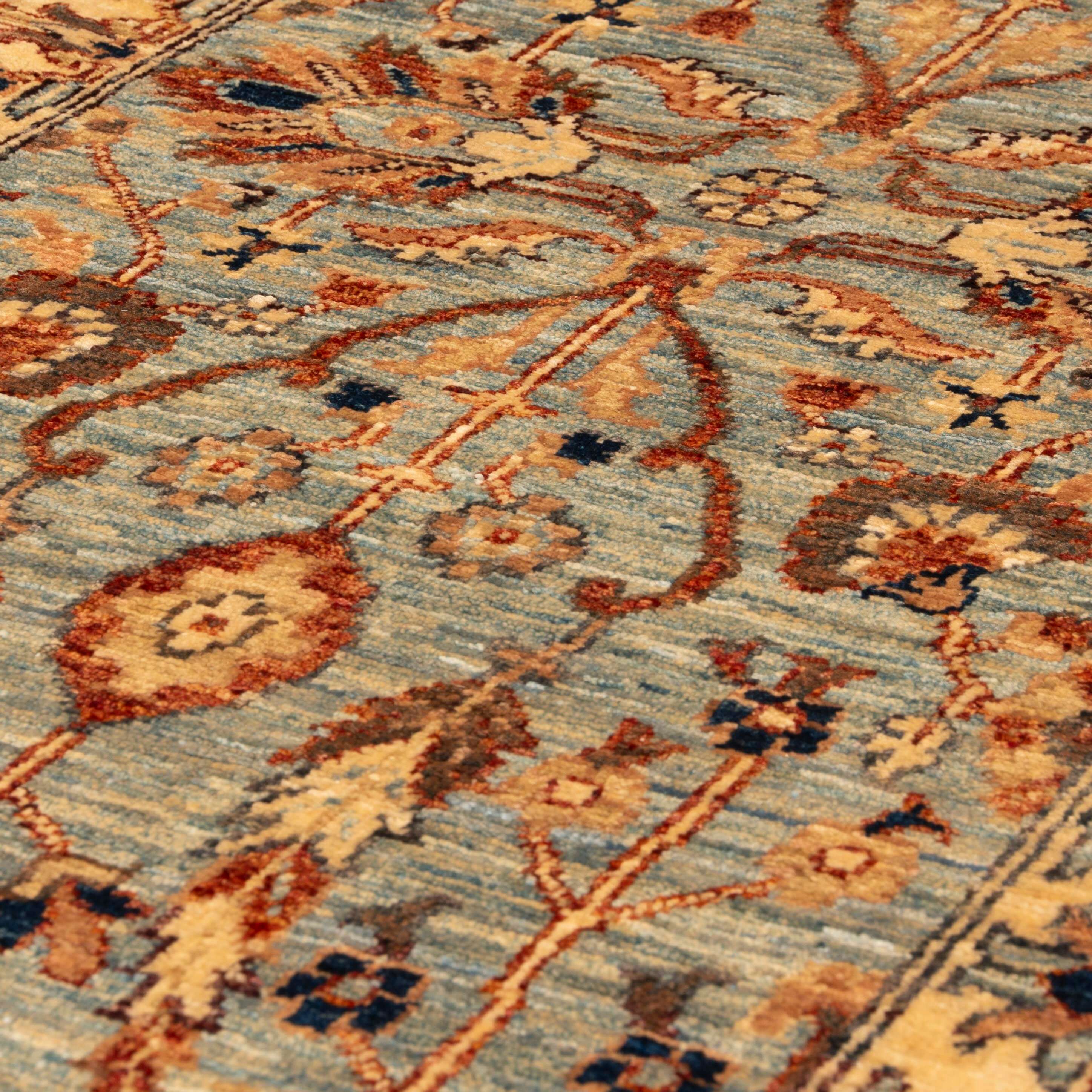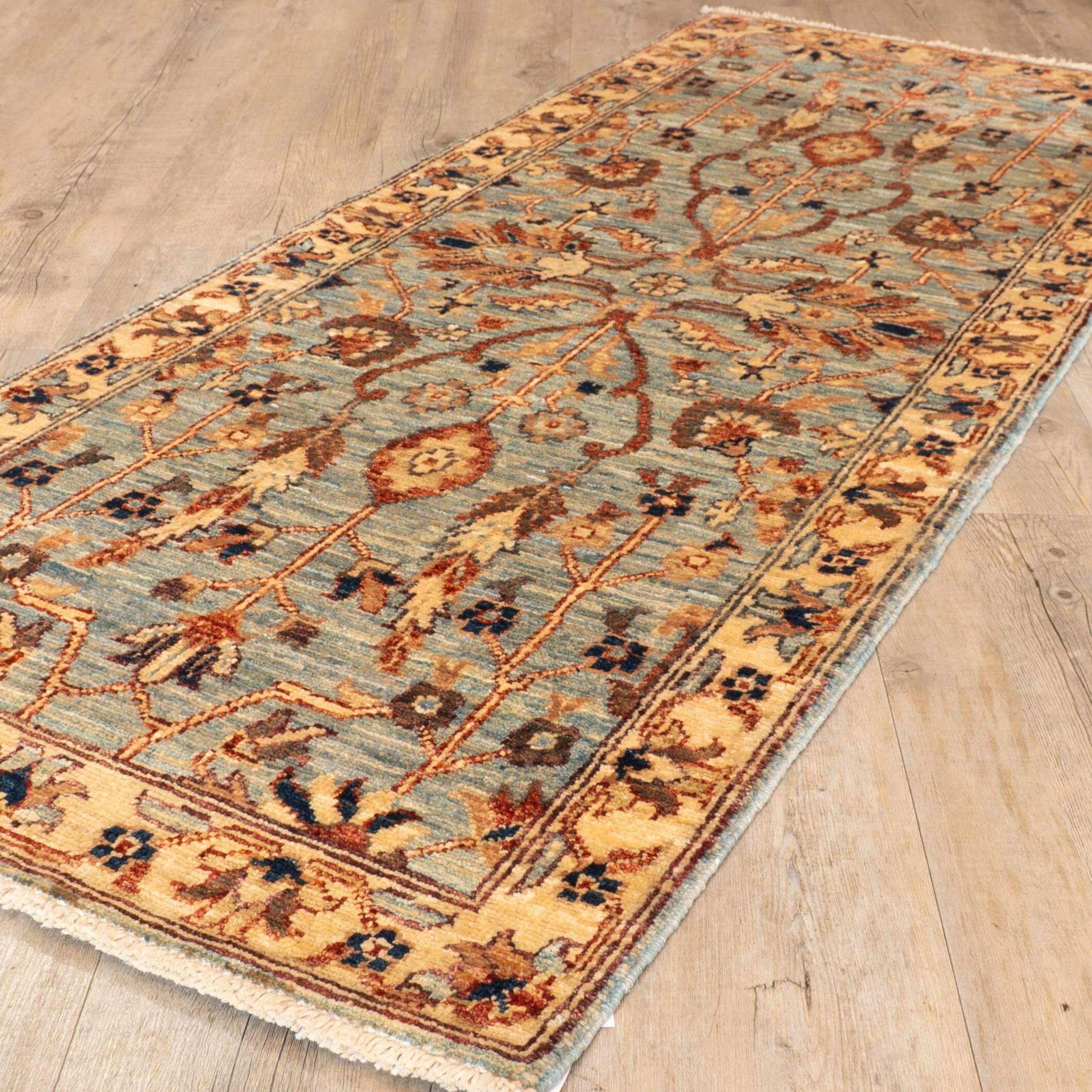 Enhance your living space with this handmade Afghan Choeb Rang short runner, with a soft duck egg blue background and floral design—the blue offers subtlety, while the durable wool construction ensures lasting quality. Elevate your décor with a piece that combines artistic uniqueness and enduring craftsmanship, moving beyond the ordinary to bring a sophisticated touch to your home.   Please click the hyperlinks in gold if you are interested in additional information.This unique and varied collection is produced in northwest Afghanistan and features construction similar to that of Ziegler rugs. The wool is hand-sheared from the indigenous Karukal sheep. It is then hand-spun and...