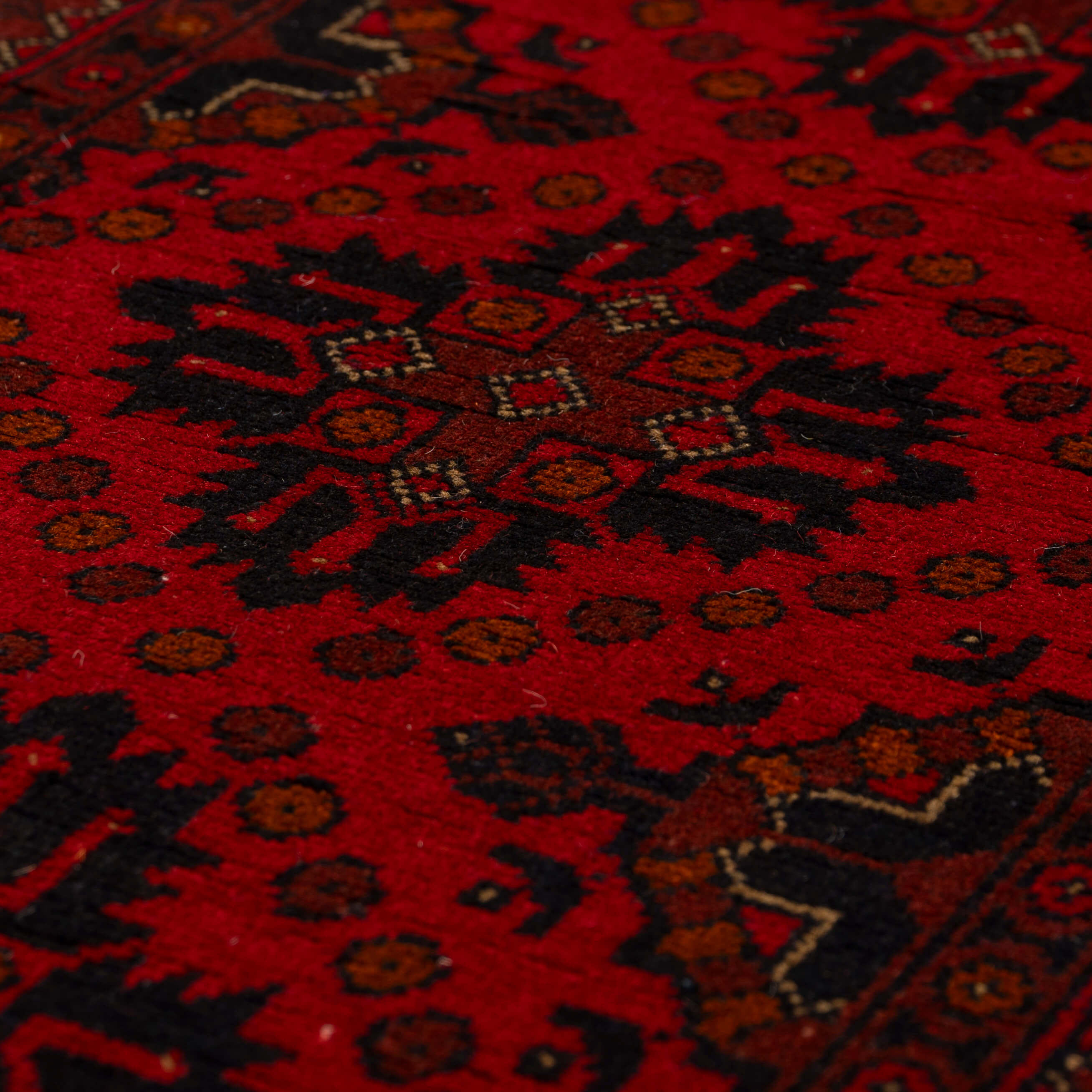 The rich red of these rugs is created from boiling the madder plant's root, which grows wild in that part of the world. They are finely knotted using wool from the Karakul sheep, which graze the mountainous terrain. The colour and design make them very practical. Some recurring motifs include guls (an elephant's foot pattern) and octagonal, often curvilinear flowers in dark blue, ochre, and beige. We offer an extensive collection of handmade Afghan Khal Mohammadi rugs and carpets for sale in various sizes, available both online and in-store. Why not visit Tewkesbury and discover a beautiful carpet that suits your needs?