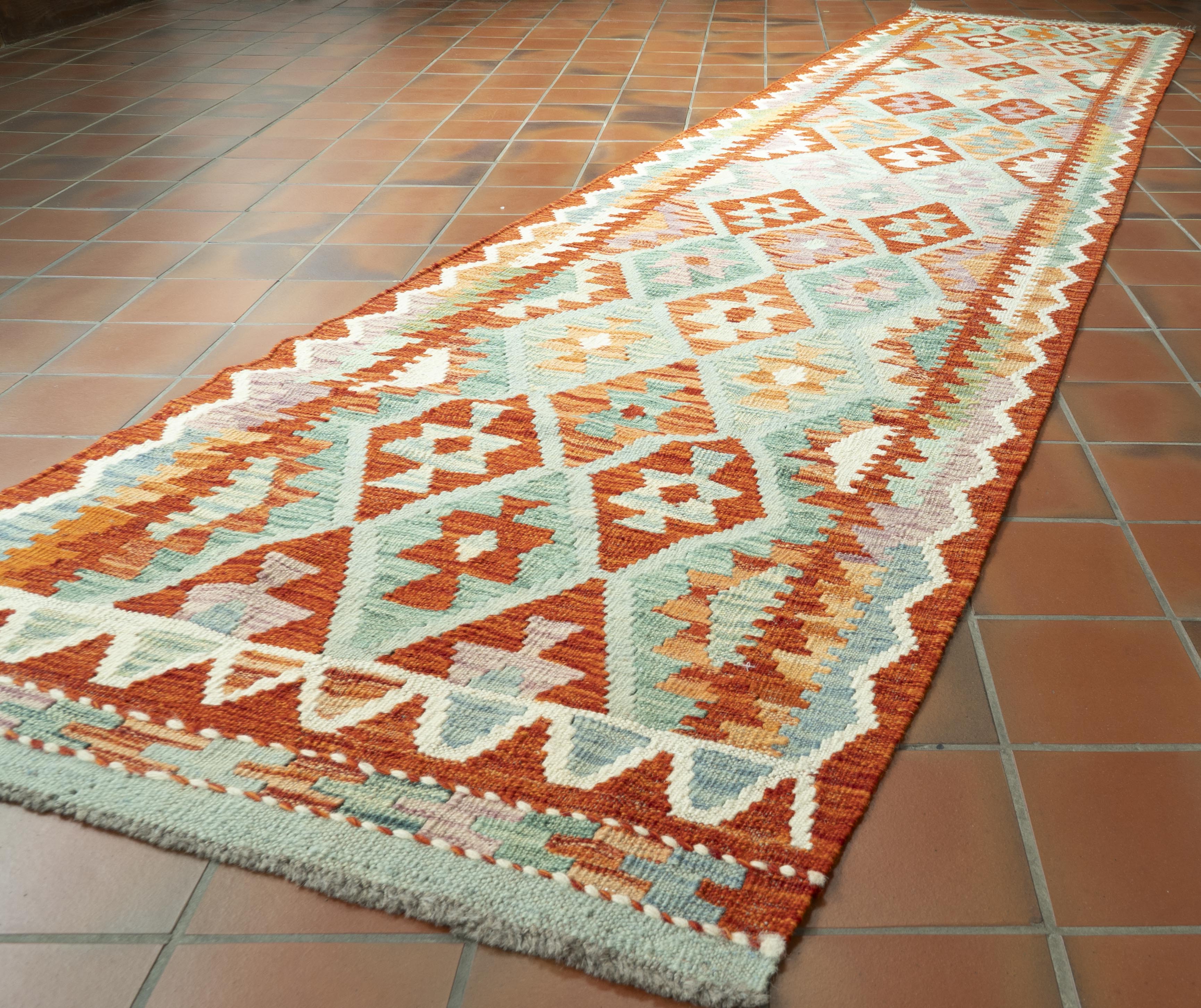 Experience the quality and tradition of Afghan craftsmanship with our handmade long Kilim runner. This flat-weave kilim is woven from traditional, vegetable-dyed wool, making it durable and ideal for use with underfloor heating. Its colourful and striking design is reversible, allowing it to be used as a floor covering, wall hanging, or throw. Upgrade your space with this beautiful and inexpensive piece—positive colourings in terracotta and green.