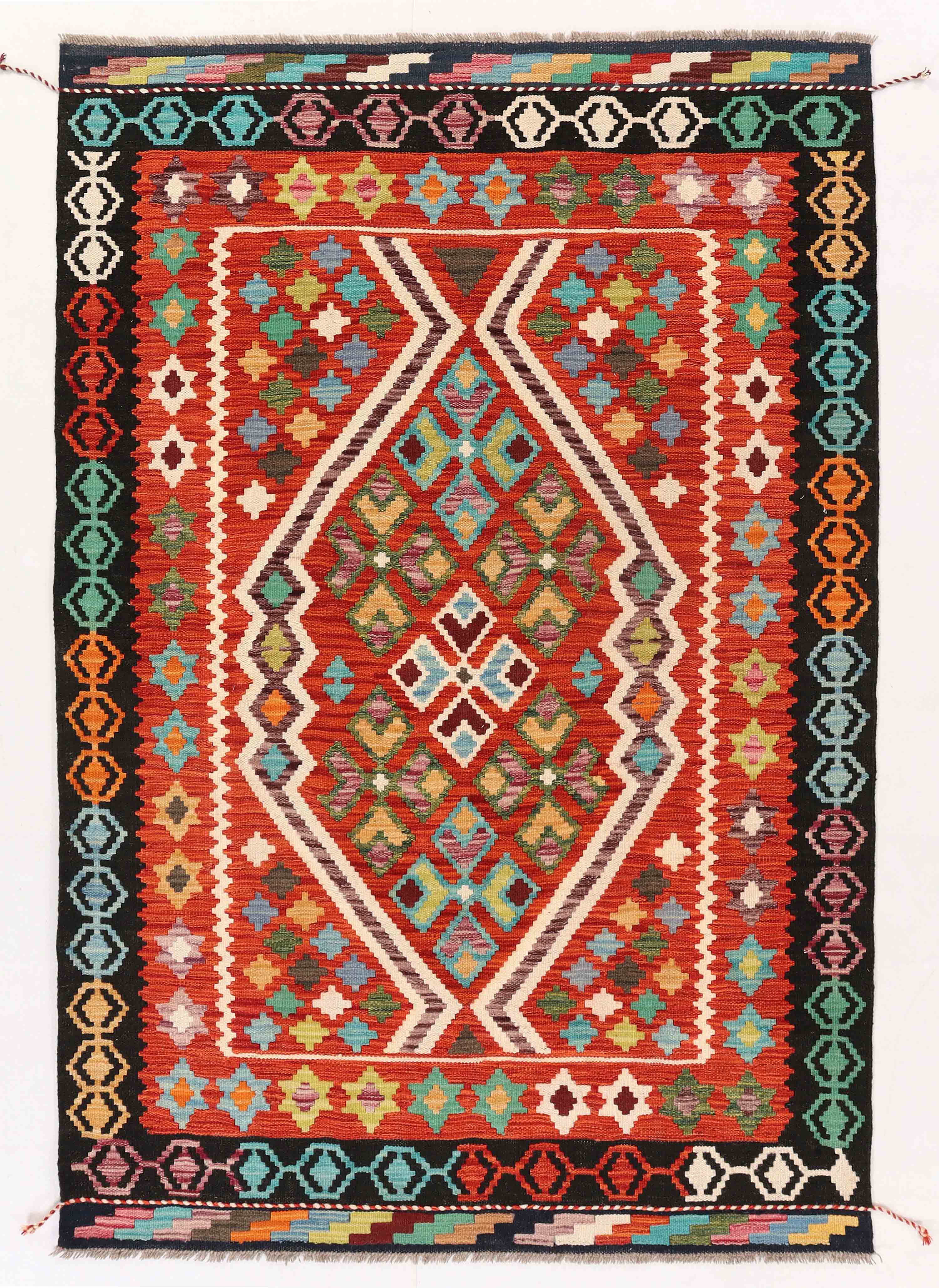 Experience the quality and tradition of Afghan craftsmanship with our handmade Kilim. This flat weave kilim is woven with traditional vegetable-dyed wool, making it durable and perfect for use with underfloor heating. Its colourful and striking design is reversible, allowing it to be used as a floor covering, wall hanging, or throw. Upgrade your space with this beautiful and inexpensive piece.
