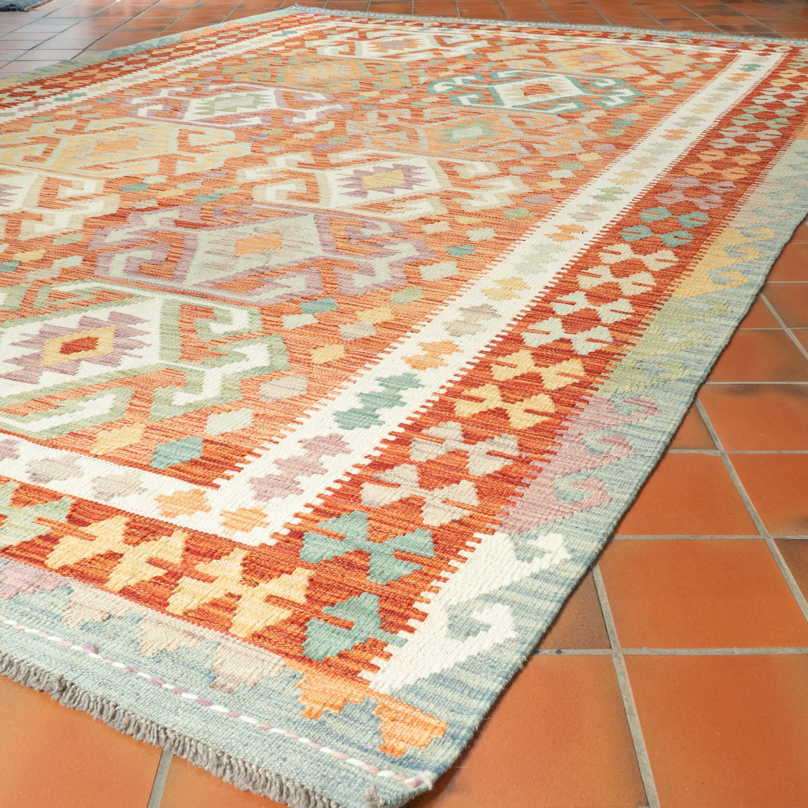 Experience the quality and tradition of Afghan craftsmanship with our handmade terracotta kilim. This flat-weave kilim is woven from traditional, vegetable-dyed wool, making it durable and ideal for use with underfloor heating. Its colourful and striking design is reversible, allowing it to be used as a floor covering, wall hanging, or throw. Elevate your space with this stunning and affordable piece.       Please click the hyperlinks in gold if you are interested in additional information. Kilim rugs are serviceable and practical, offering the advantage of being made from one of the most beautiful natural yarns, "wool", and are often...