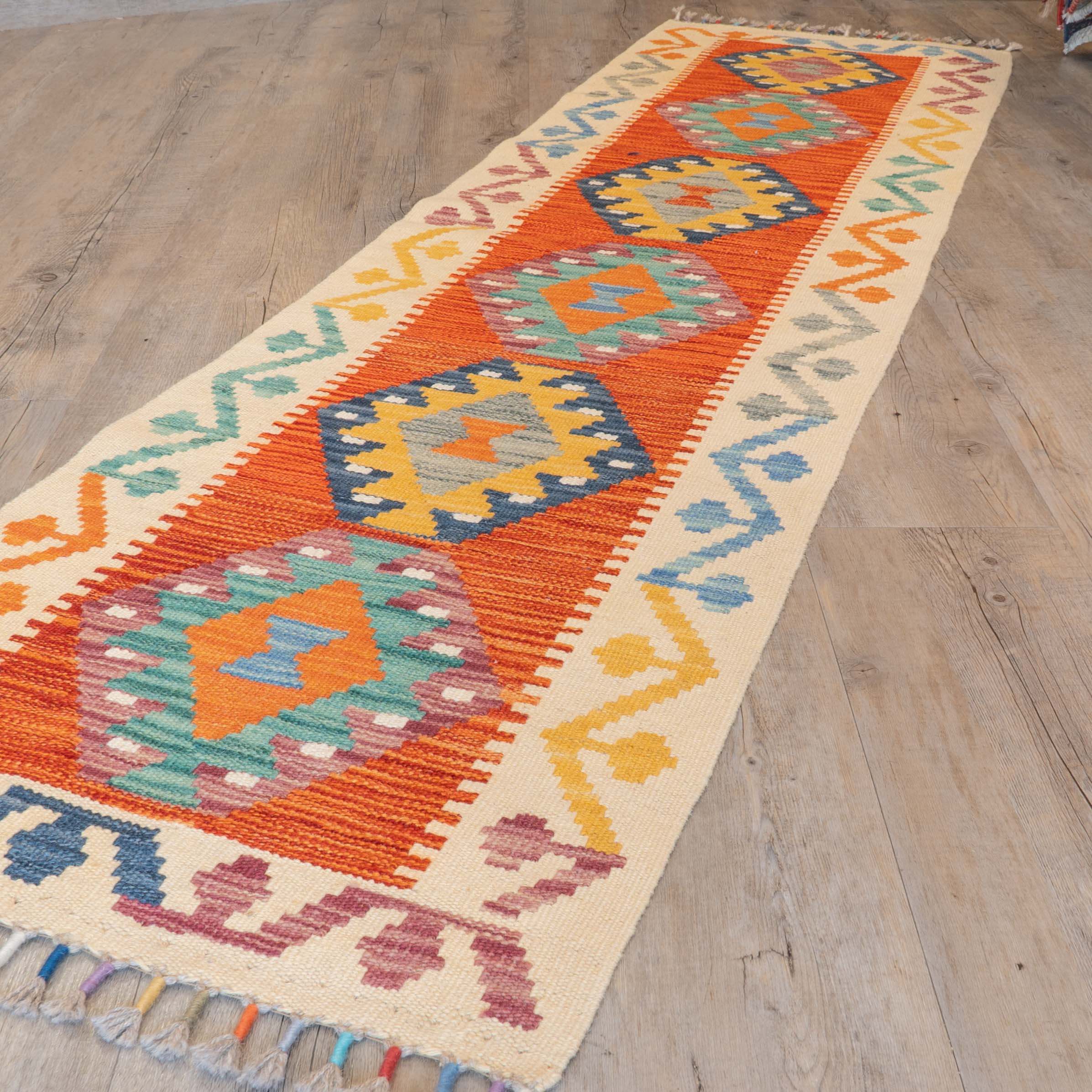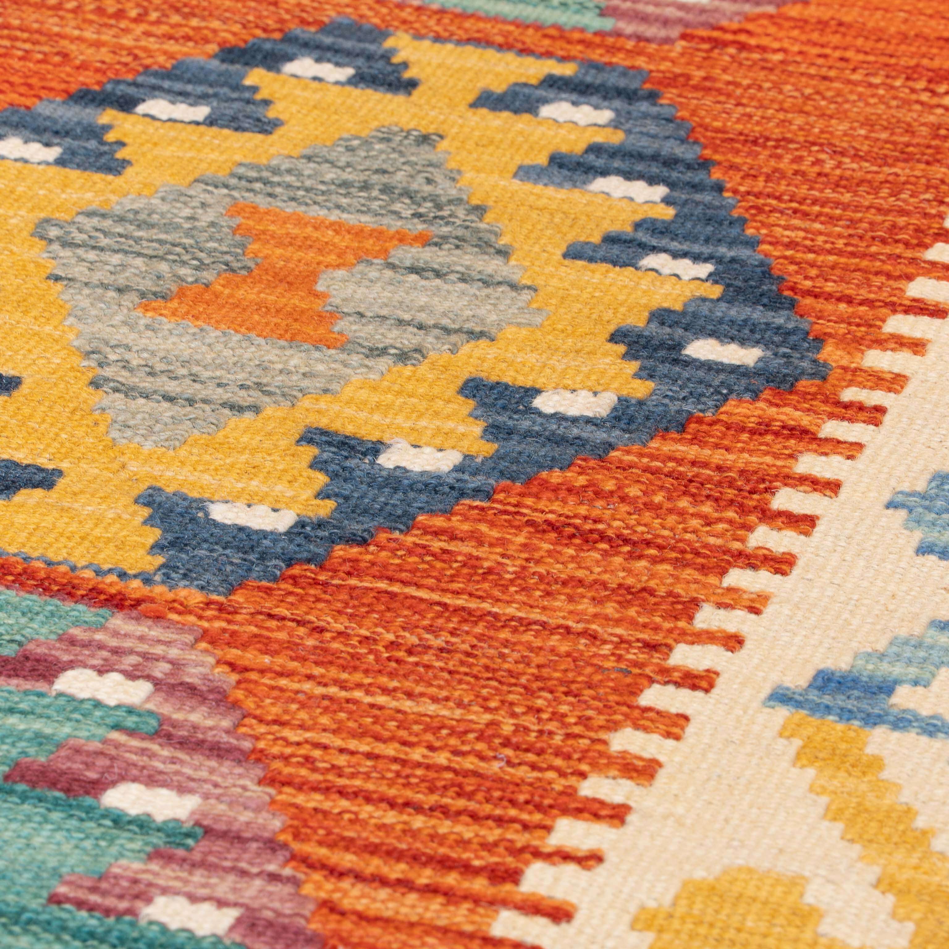 Experience the quality and tradition of Afghan craftsmanship with our brightly coloured, bold handmade Kilim. This flat-weave kilim is woven from traditional, vegetable-dyed wool, making it durable and ideal for use with underfloor heating. Its colourful and striking design is reversible, allowing it to be used as a floor covering, wall hanging, or throw. Upgrade your space with this beautiful and inexpensive piece.