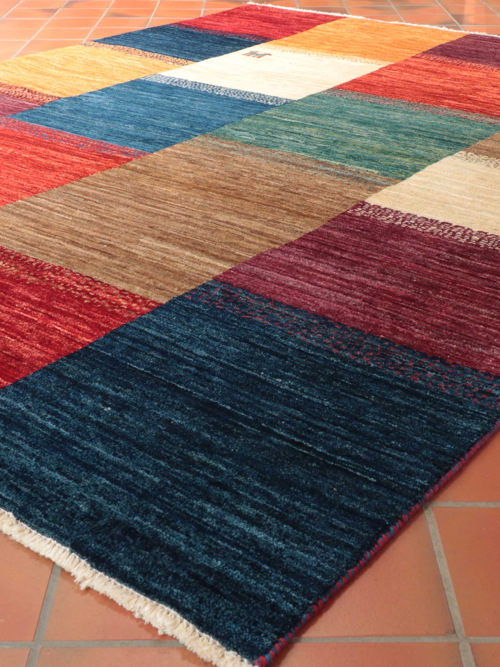 The carpets are still hand-knottedand the wool is coloured with vegetable dye. The Loribaft rug designs can be reminiscent of Gabbeh designs, although the Loribaft pieces are more refined and tightly knotted. The colours of the Loribaft rugs and carpets are similar to those used in our Samarkand collections and possibly more vibrant. The main distinction is that the patterns are playful, using a defined colour palette and simple design, with stylised animals, plants, trees or characters with block colour often mimicking an ombre effect. Some Loribaft pieces do not have fringes, so they are finished with a plain kilim end or binding and secured to prevent fraying. Like the Samarkand carpets, other rugs are produced with an unusual bobbin wind on the warps.