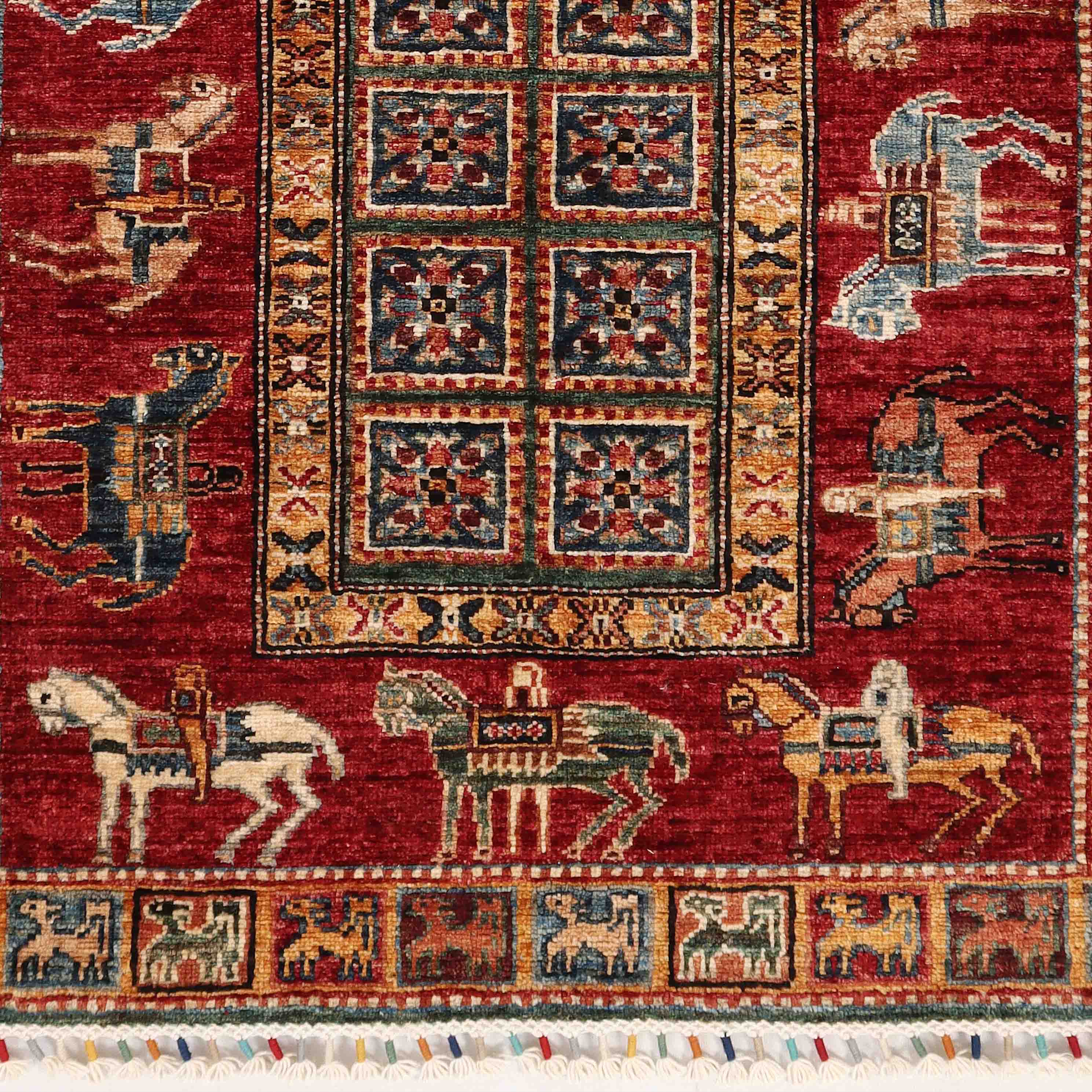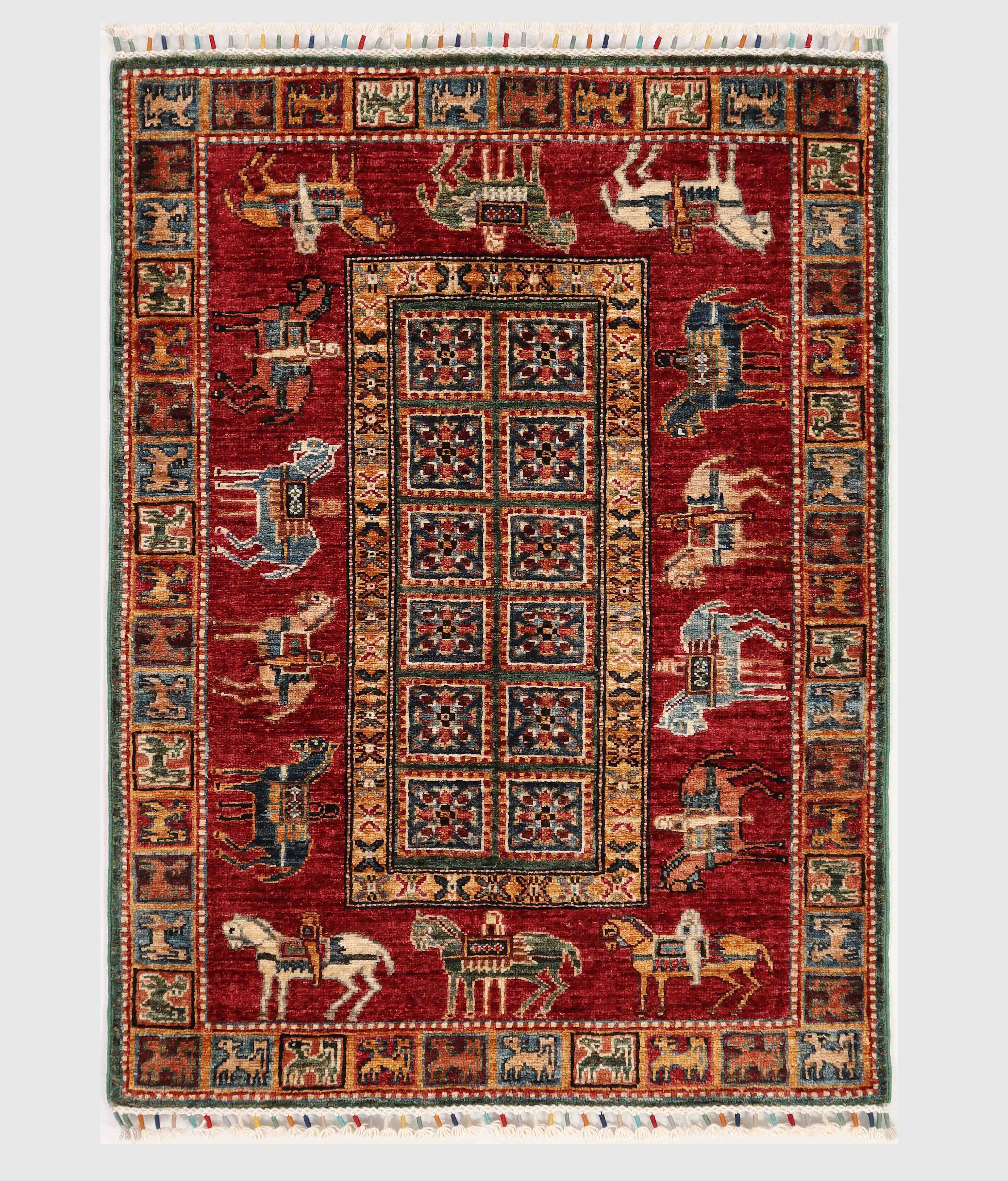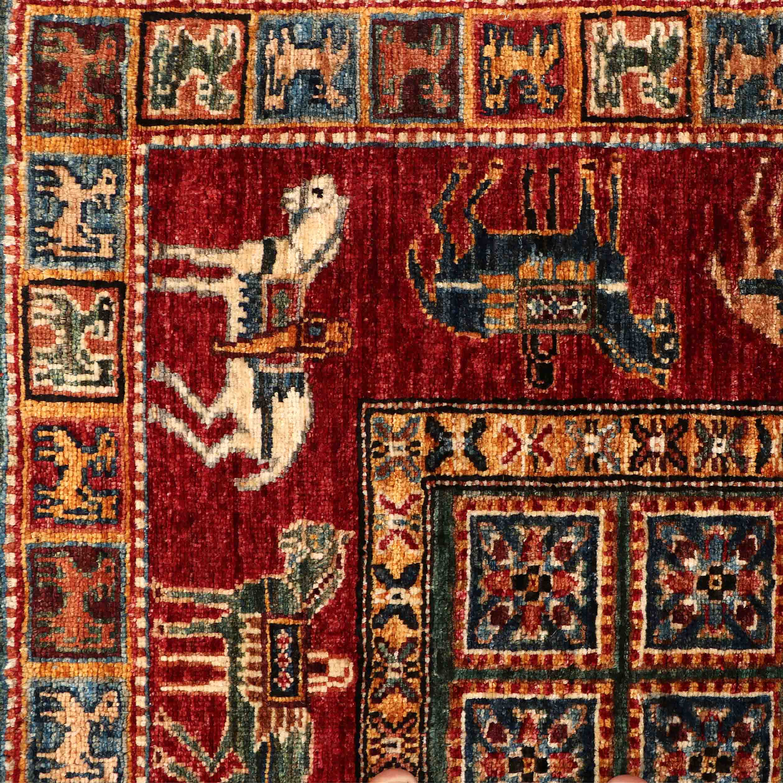 This handmade Afghan Pazyryk design rug is a beautiful replica of the ancient Pazyryk carpet featuring horses and bison in the borders. Skilled artisan weavers from the cottage industry in Northwest Afghanistan used vegetable-dyed hand-spun wool to create this hardwearing yet aesthetic traditional craft. Practical and durable, this rug is perfect for any room. The real Pazyryk rug hangs in the Hermitage Museum in St Petersberg.