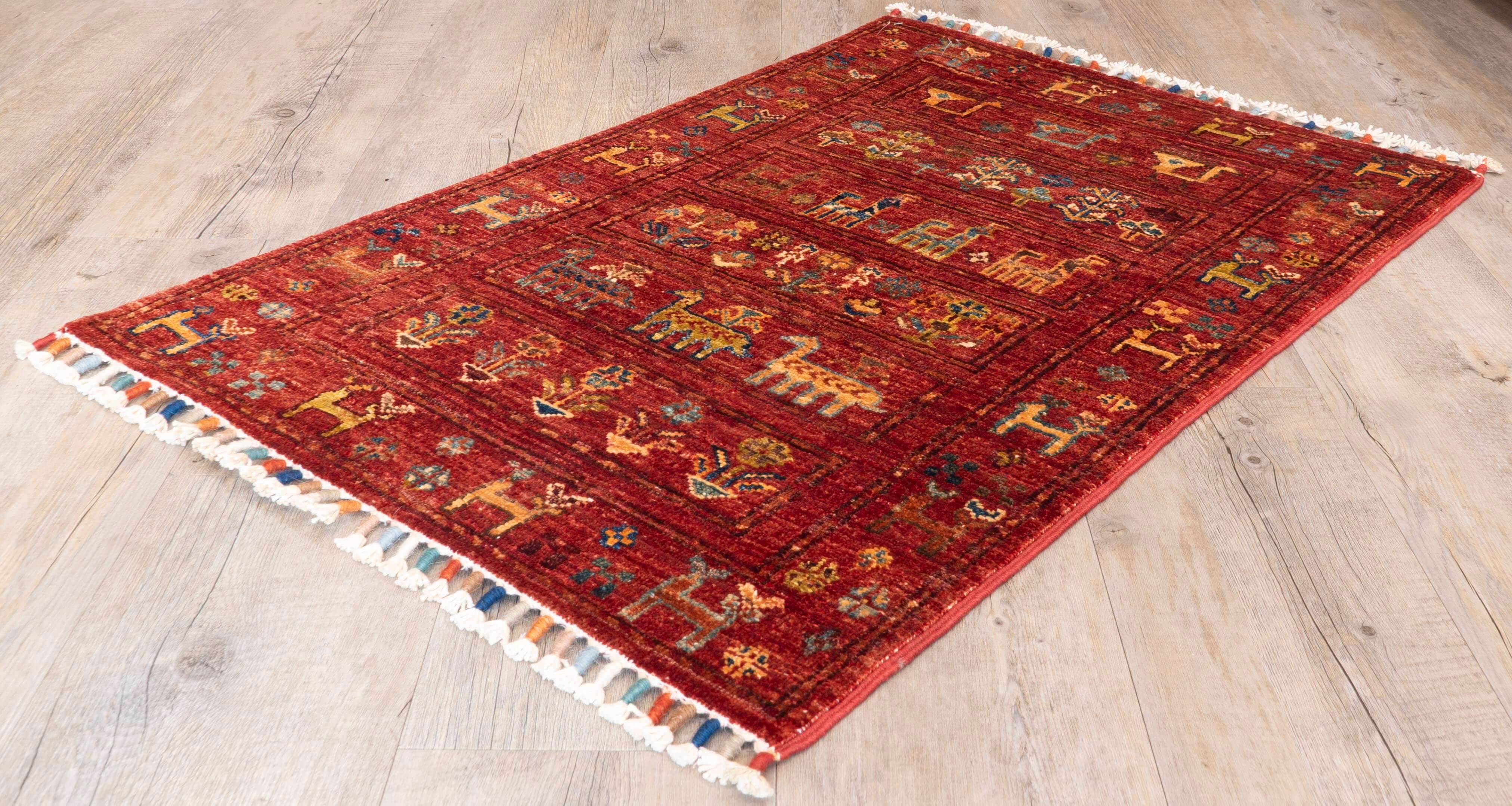 This handmade Afghan Samarkand rug is expertly crafted by skilful artisans from the cottage industry in Northwest Afghanistan. Fine quality, vegetable-dyed, hand-spun wool is used to create a modern design with a traditional craft featuring an animal pattern and rich red colour. Full of character, this rug is practical and functional art.