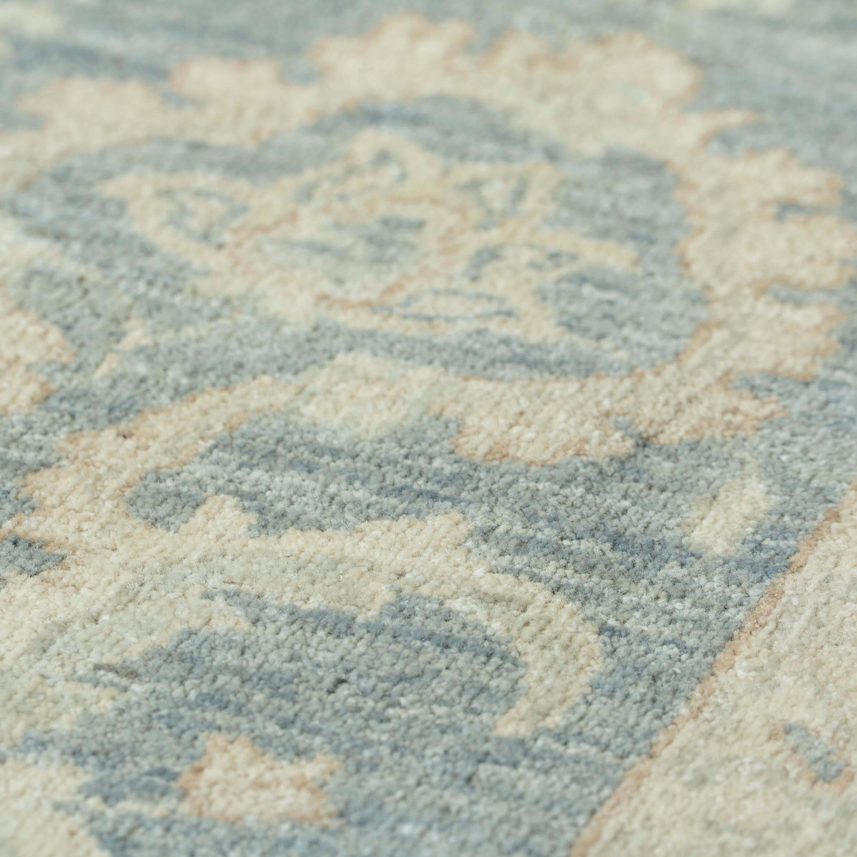 Indulge in luxury with our Handmade Afghan silver wash Ziegler carpet. Skilled artisan weavers in northwest Afghanistan have created this masterpiece using traditional techniques passed down through generations: vegetable-dyed handspun wool. The result is an elegant ivory background with a soft pale blue border and muted colours, perfect for adding sophistication to any space.