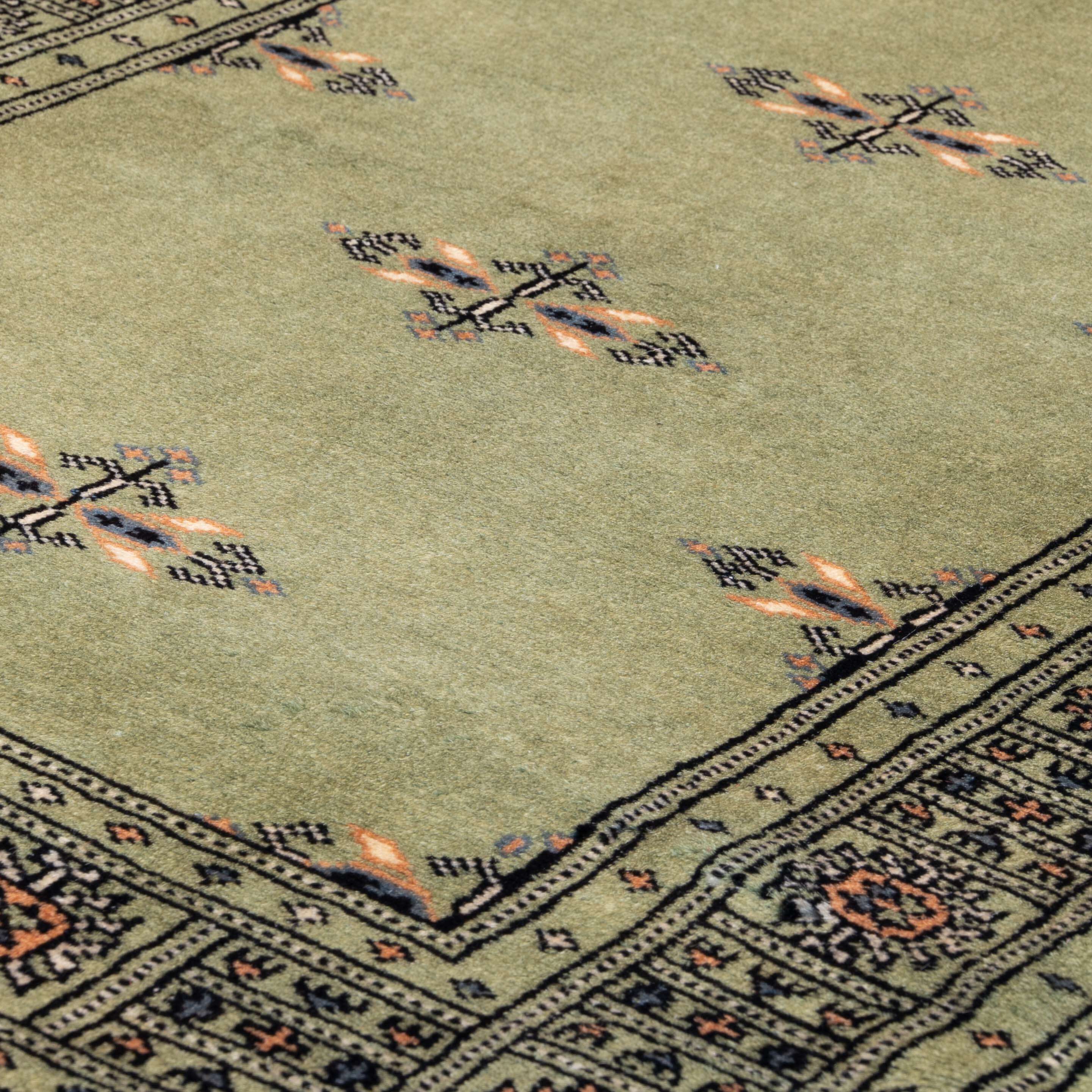 This Pakistan Bokhara rug is finely knotted in a traditional design using lovely, soft, silky wool. The Bokhara rugs are always made with a wool pile, but unfortunately, some people try to pass them off as silk. Handmade Bokhara rugs are incredibly good value.