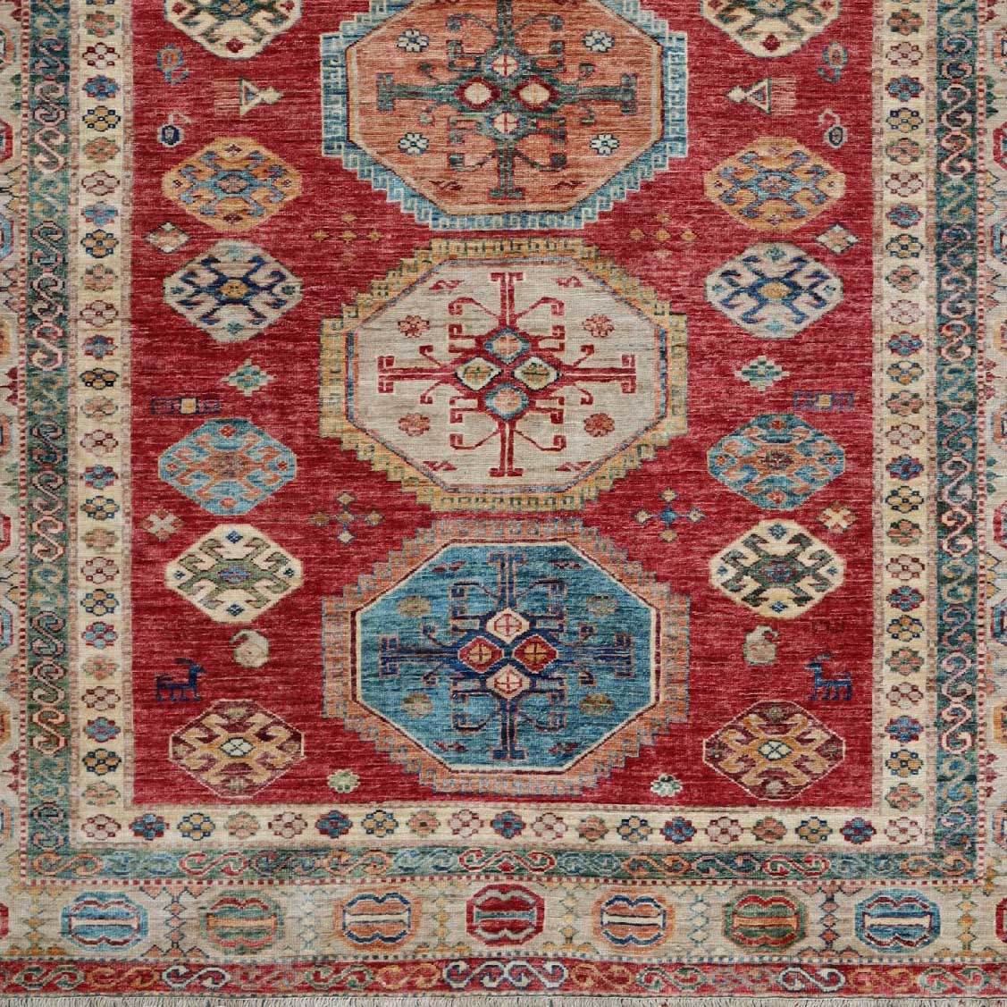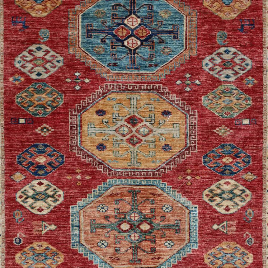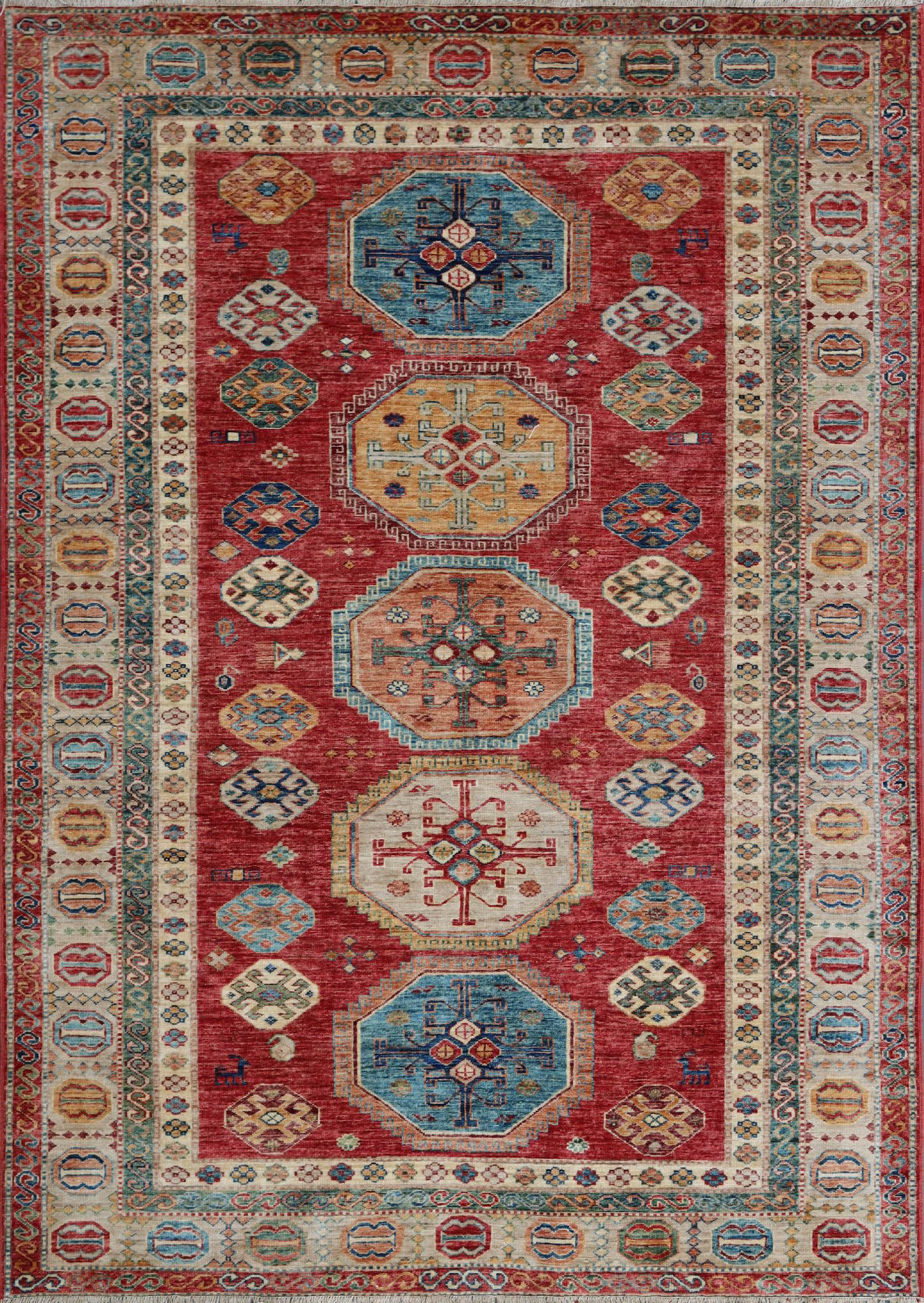 Although Kazaks are hand-knotted in Afghanistan, the design originates from the Caucasus. The short pile emphasises the sharpness of the pattern. Each piece is made using excellent Afghan wool, usually spun in Ghazni. The Afghan wool is generally slightly coarser and more curly than other wools and is perfect for carpet weaving. Afghan Kazak carpets are traditionally made with bold geometric designs in intense, vibrant colours such as rich reds, warm terracottas, and shades of blues with soft golds and creams.