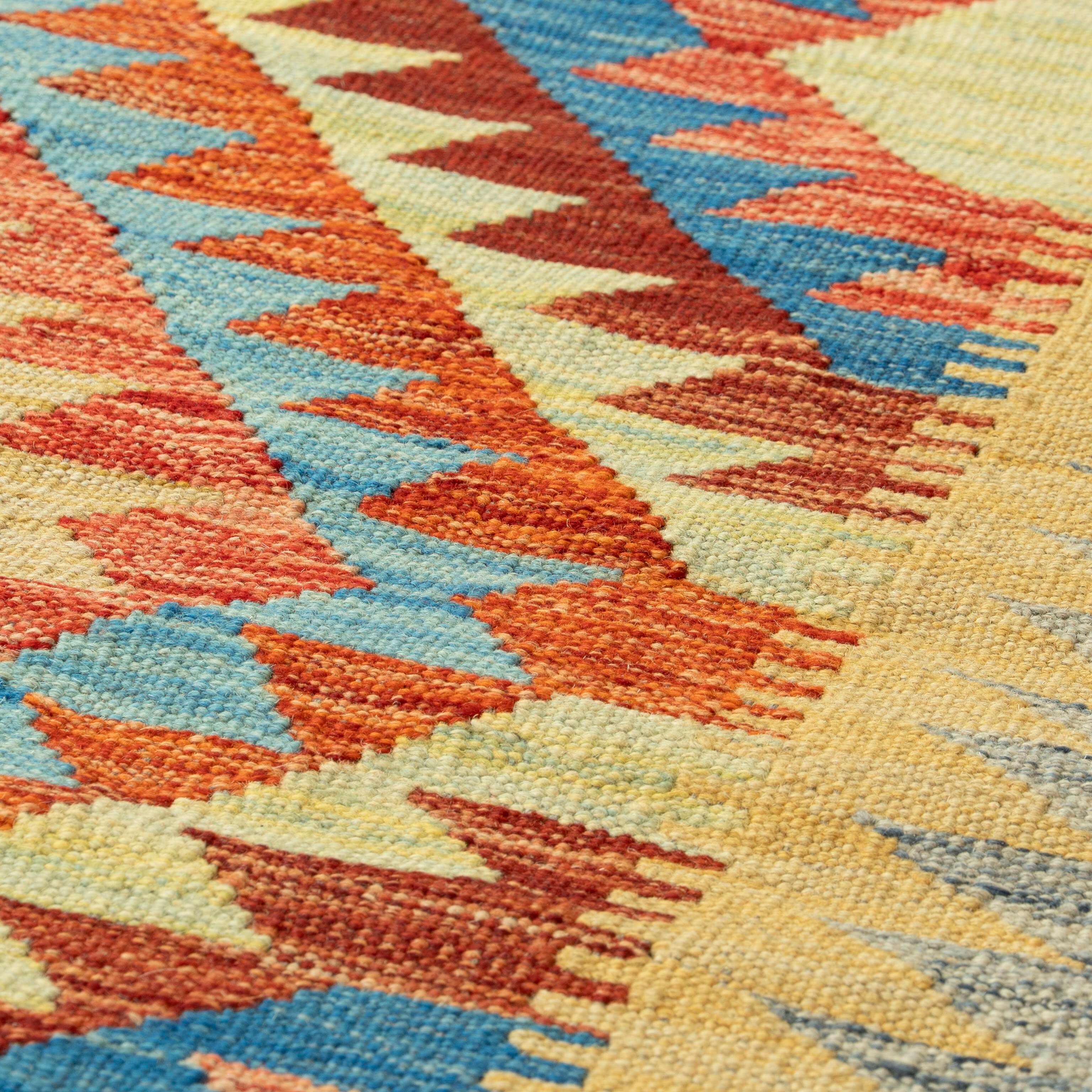Experience the quality and tradition of Afghan craftsmanship with our handmade Kilim. This flat weave kilim is woven with traditional vegetable-dyed wool, making it durable and perfect for use with underfloor heating. Its colourful and striking design in gold, blue and terracotta with a soft grey border is reversible, allowing it to be used as a floor covering, wall hanging, or throw. Upgrade your space with this beautiful and inexpensive piece.