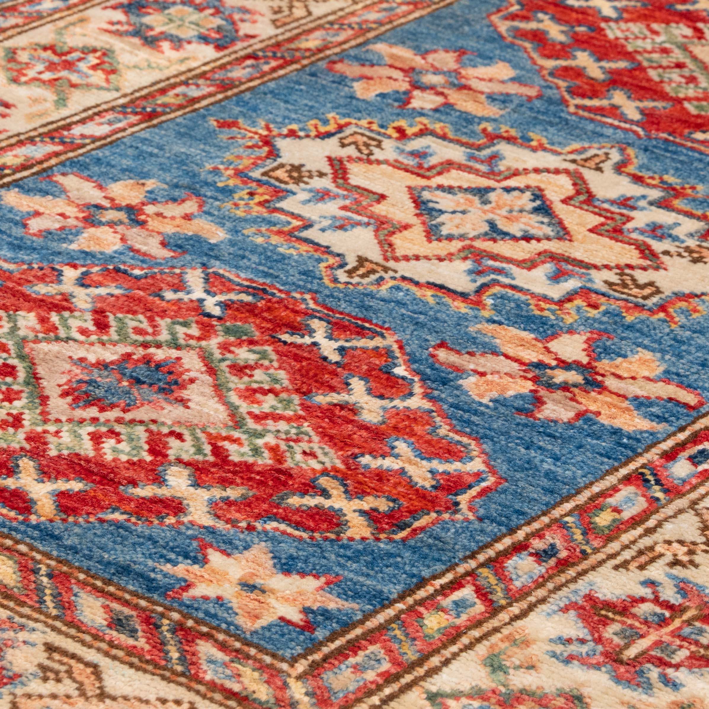 This fine-quality Afghan Kazak rug, handmade by skilled artisan weavers, features a classic Caucasian design. Crafted from vegetable-dyed, hand-spun wool, this piece is durable, practical, and ideal for both decorative and functional use. With a mid-blue background and a cream border accented with red, it will make an eye-catching addition to any home.