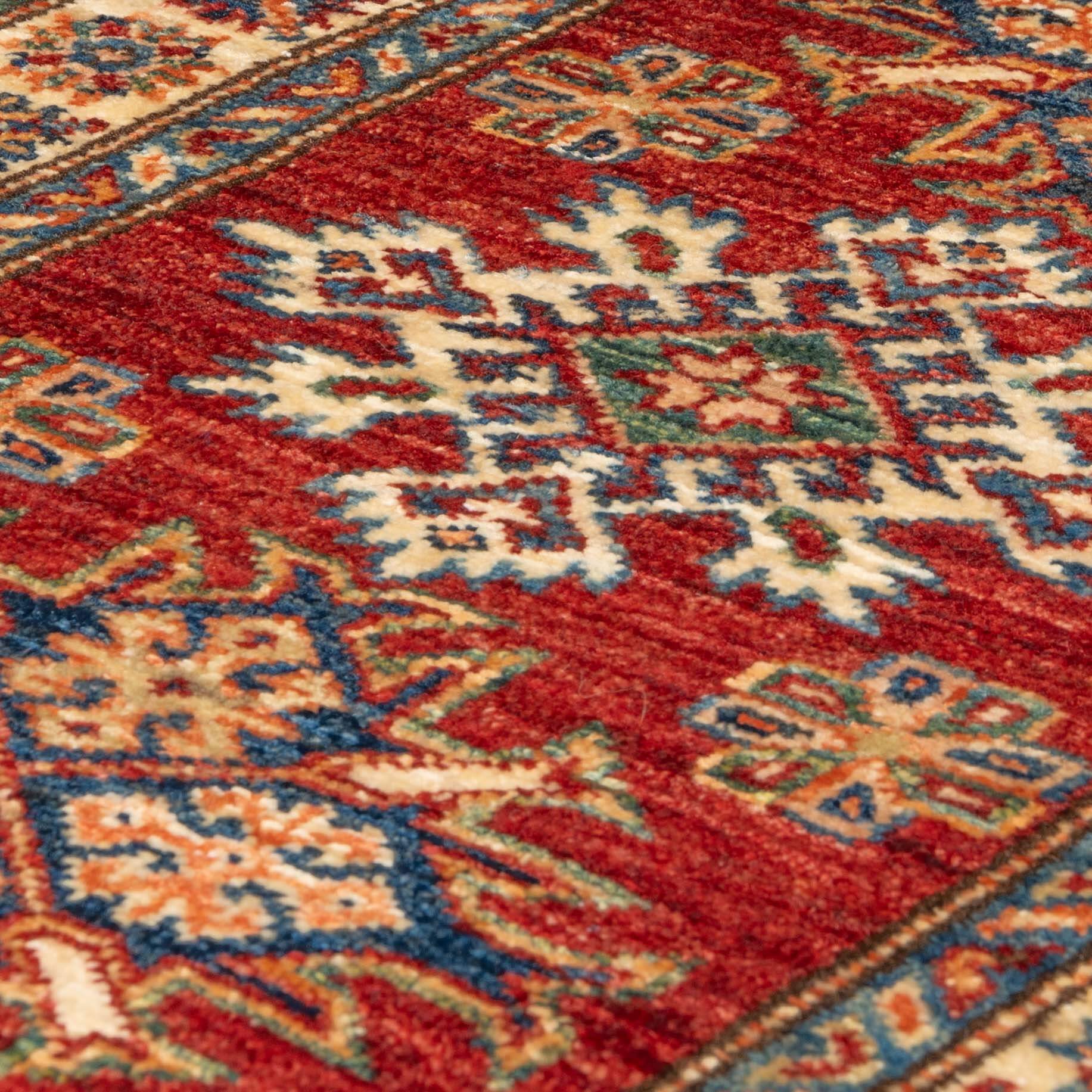 Although Kazaks are hand-knotted in Afghanistan, the design originates from the Caucasus. The short pile emphasises the sharpness of the pattern. Each piece is crafted from exceptional Afghan wool, typically spun in the Ghazni region. Afghan wool is generally slightly coarser and curlier than other wools, making it perfect for carpet weaving. Afghan Kazak carpets are traditionally made with bold geometric designs in intense, vibrant colours such as rich reds, warm terracottas, and shades of blues with soft golds and creams.