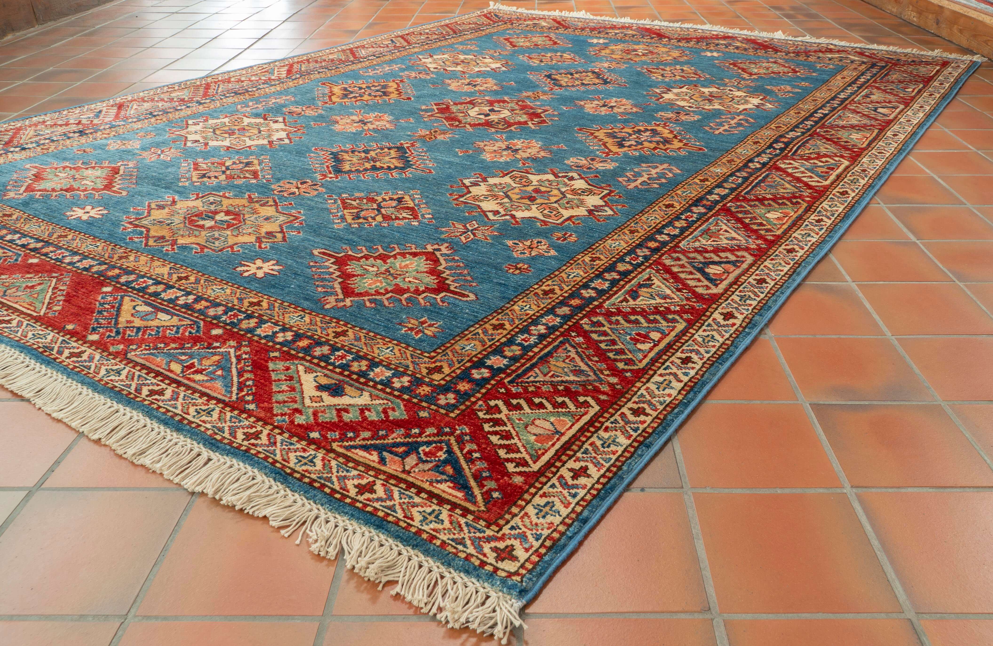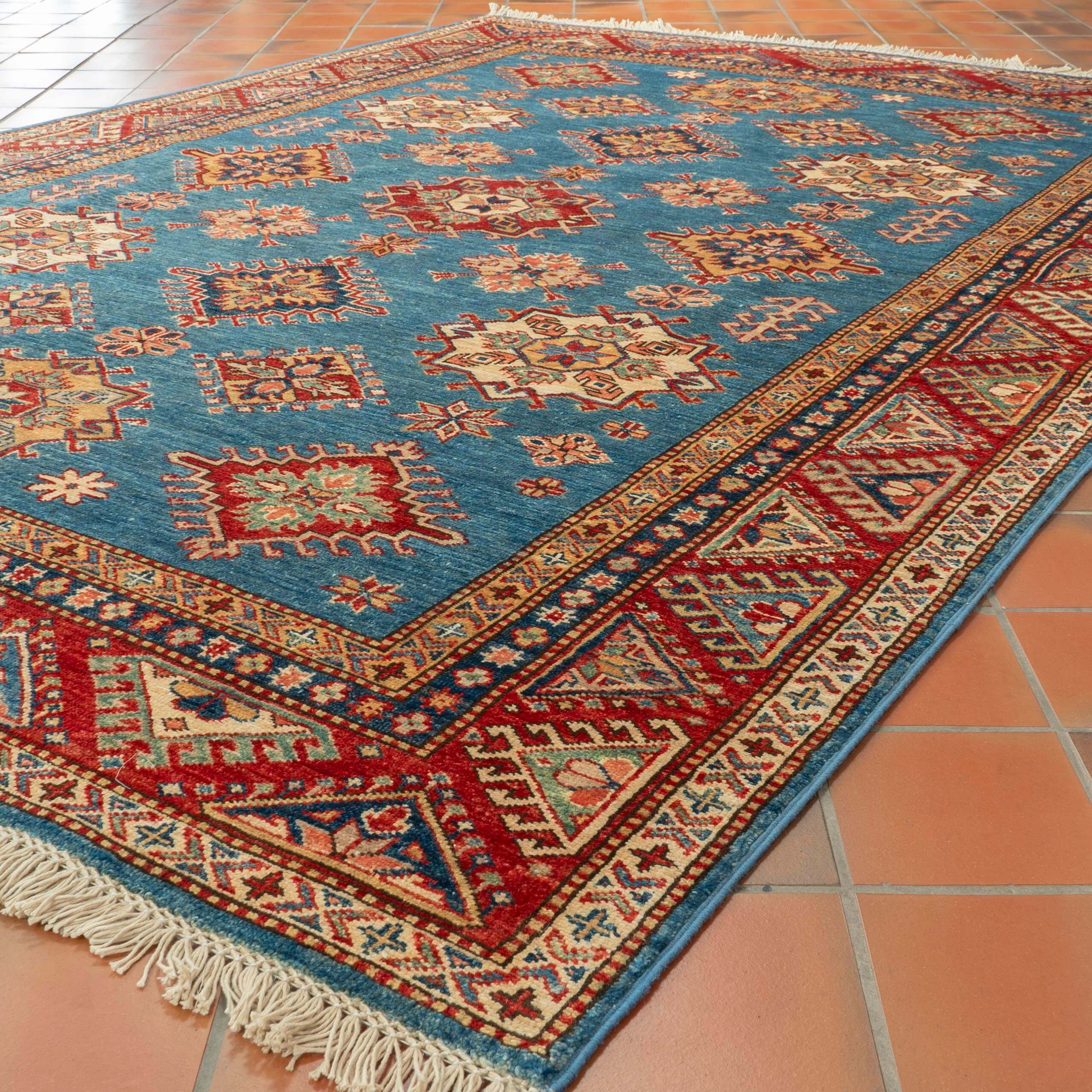 Although Kazaks are hand-knotted in Afghanistan, the design originates from the Caucasus. The short pile emphasises the sharpness of the pattern. Each piece is crafted from exceptional Afghan wool, typically spun in Ghazni. Afghan wool is generally slightly coarser and curlier than other wools, making it perfect for carpet weaving. Afghan Kazak carpets are traditionally made with bold geometric designs in intense, vibrant colours such as rich reds, warm terracottas, and shades of blues with soft golds and creams.