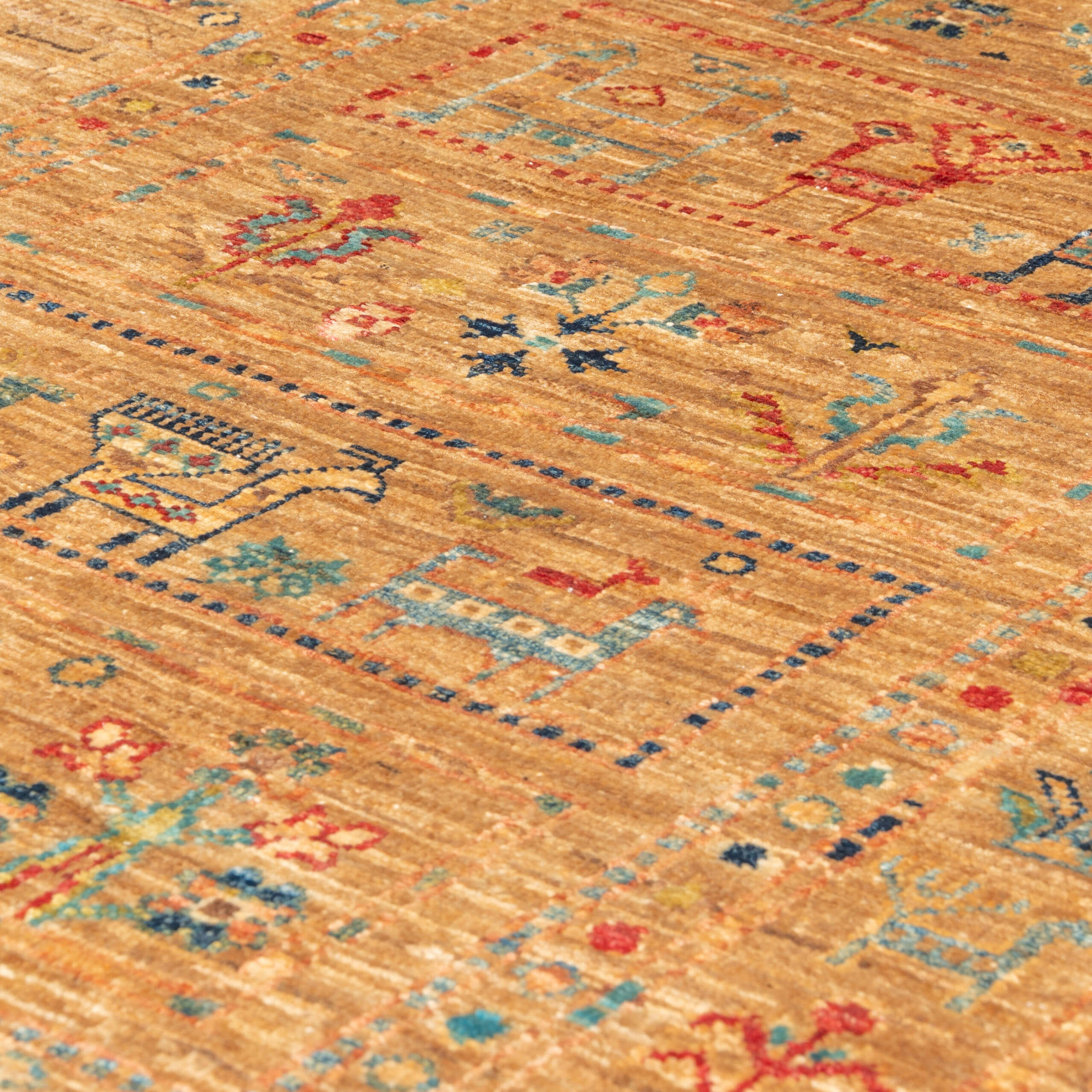 These beautiful pieces are new, appearing on the market around 2017. These wool rugs and carpets have a certain Caucasian design, similar to Kazak pieces. However, that is where the similarity ends. The rugs mostly have bobbin-wound fringes, which are brightly coloured, and they do not have any borders. Instead, the old Caucasian design is mixed into bands or stripes of bright colours. Our Afghan Samarkand rugs are handmade using naturally dyed wool on a cotton foundation. The wool used is taken from the native Karakul sheep. It is very tough and has a high natural oil content.