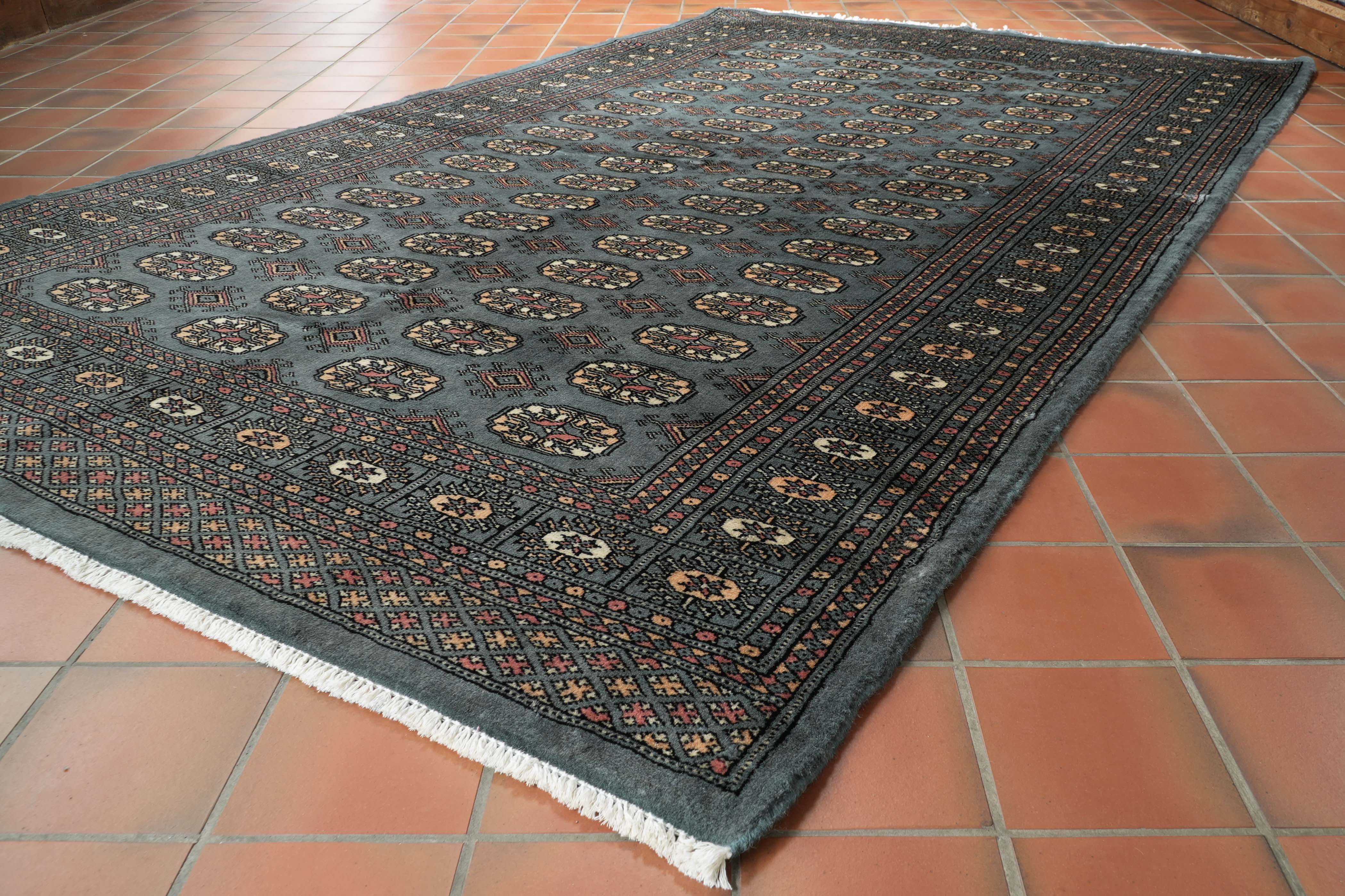 This Pakistan Bokhara rug is finely knotted in a traditional design using lovely, soft, silky wool. The Bokhara rugs are always made with a wool pile, but unfortunately, some people try to pass them off as silk. Handmade Bokhara rugs are incredibly good value.