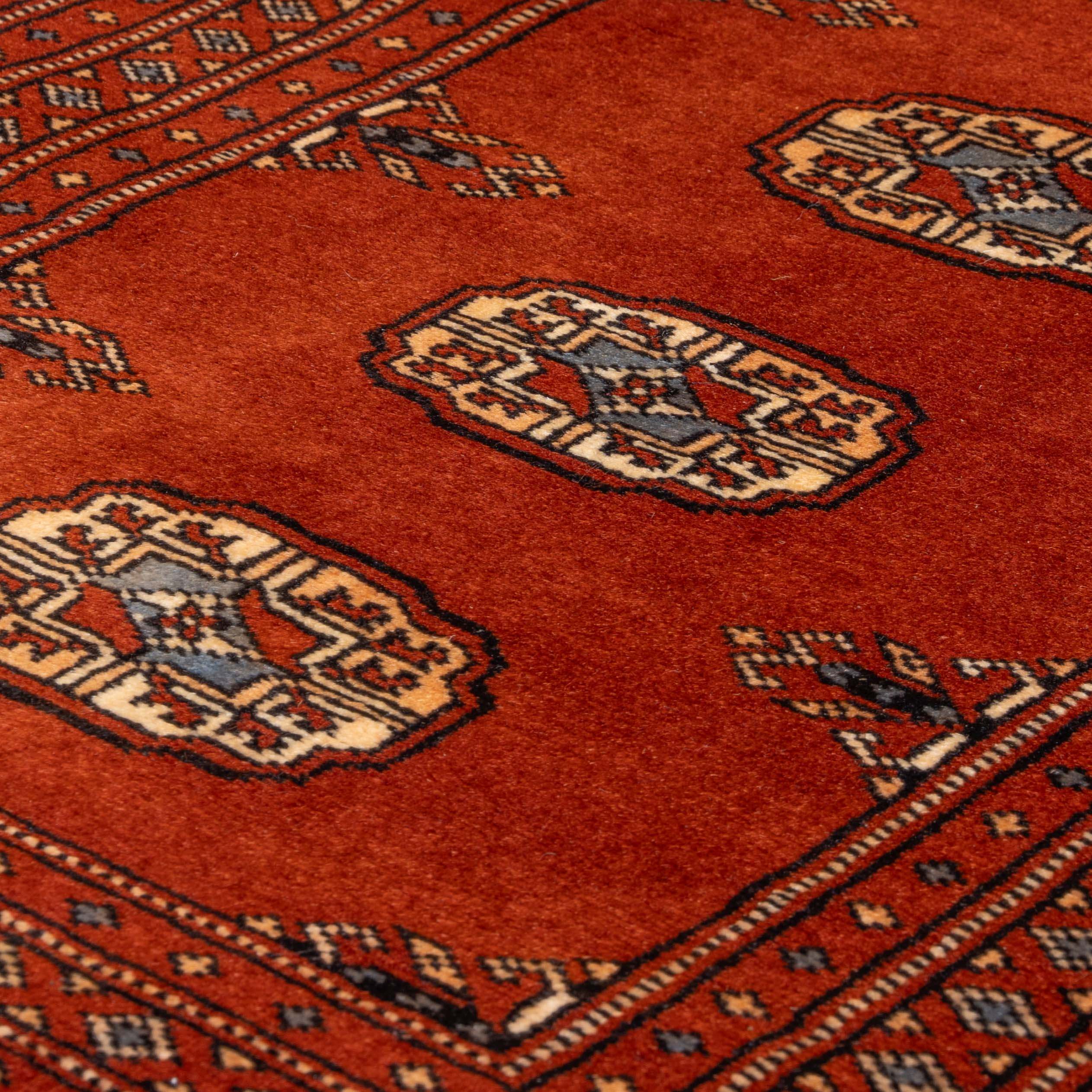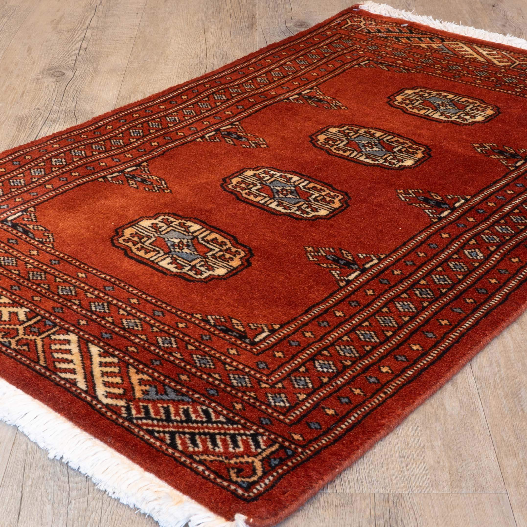 The well-known Bokhara design originates from Uzbekistan, where the nomadic Turkoman tribespeople first took their rugs to be sold. The repetitive octagonal motif, known as a "gul" (Persian for "rose"), is a characteristic feature of Bokhara rugs. Today, Pakistani people weave this design in a wide range of colours and sizes.