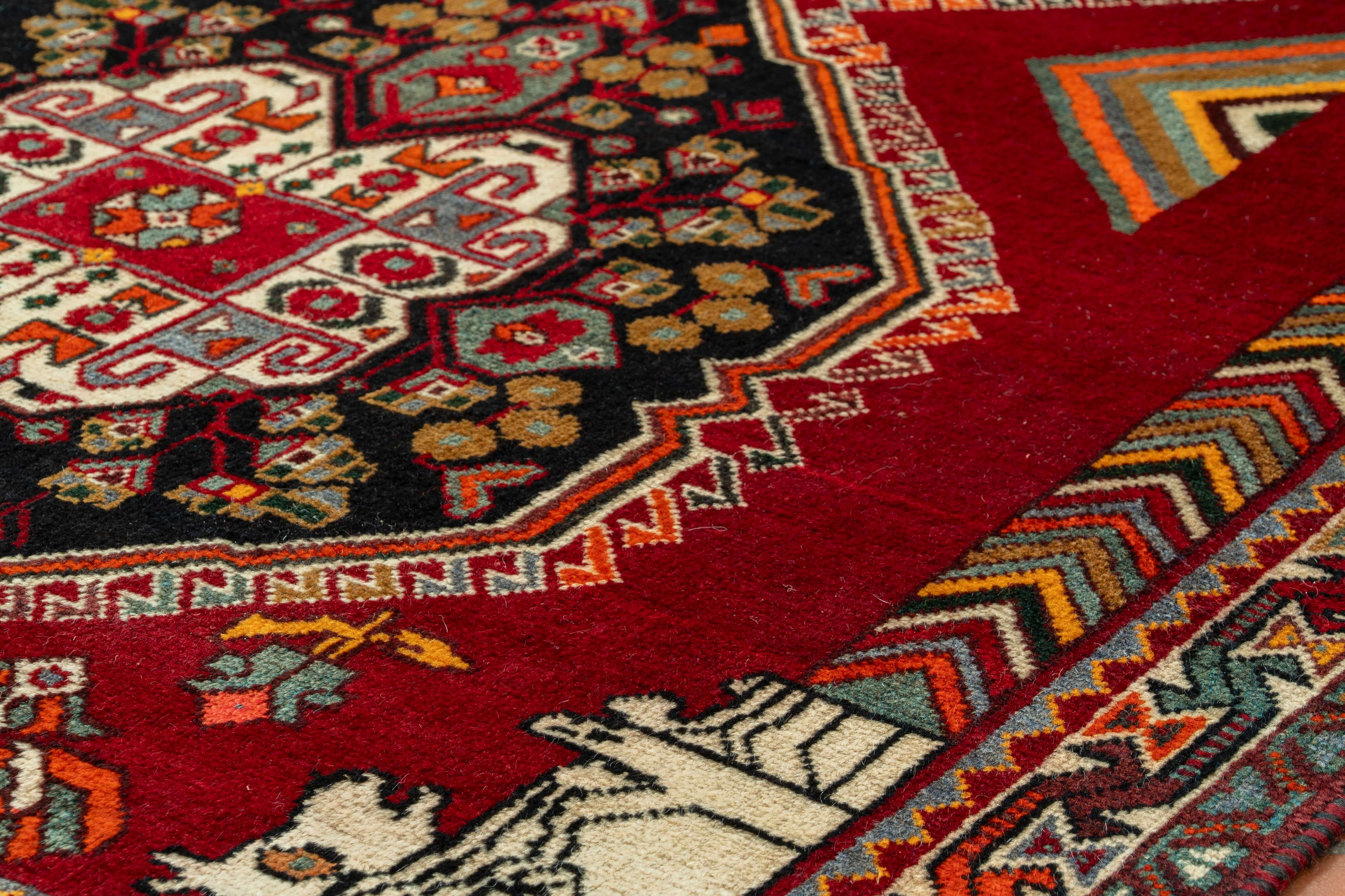 The Qashqai designs are not written or drawn but passed on to daughters who watch their mothers from an early age and gradually develop their skills in a family environment. The women will make these pieces with two or even three generations involved. The piece is knotted by the weavers sitting cross-legged on the floor and on the carpet while they craft their art. Meanwhile, the men and boys will defend and protect the animals. In addition to the traditional lozenge-shaped ground with medallions in the centre repeated in the corners, they will often include many birds, animals, flowers, and trees that they see around them. Occasionally, if you were very fortunate, you would come across one with the horse head of Persepolis. As you would expect, these carpets are hand-knotted with wool that has largely been vegetable-dyed. The Kashgai pieces often have an interesting selvedge with bi or tricolour windings like a barber pole. The other distinctive characteristic is that the rug will be knotted on a wool foundation.