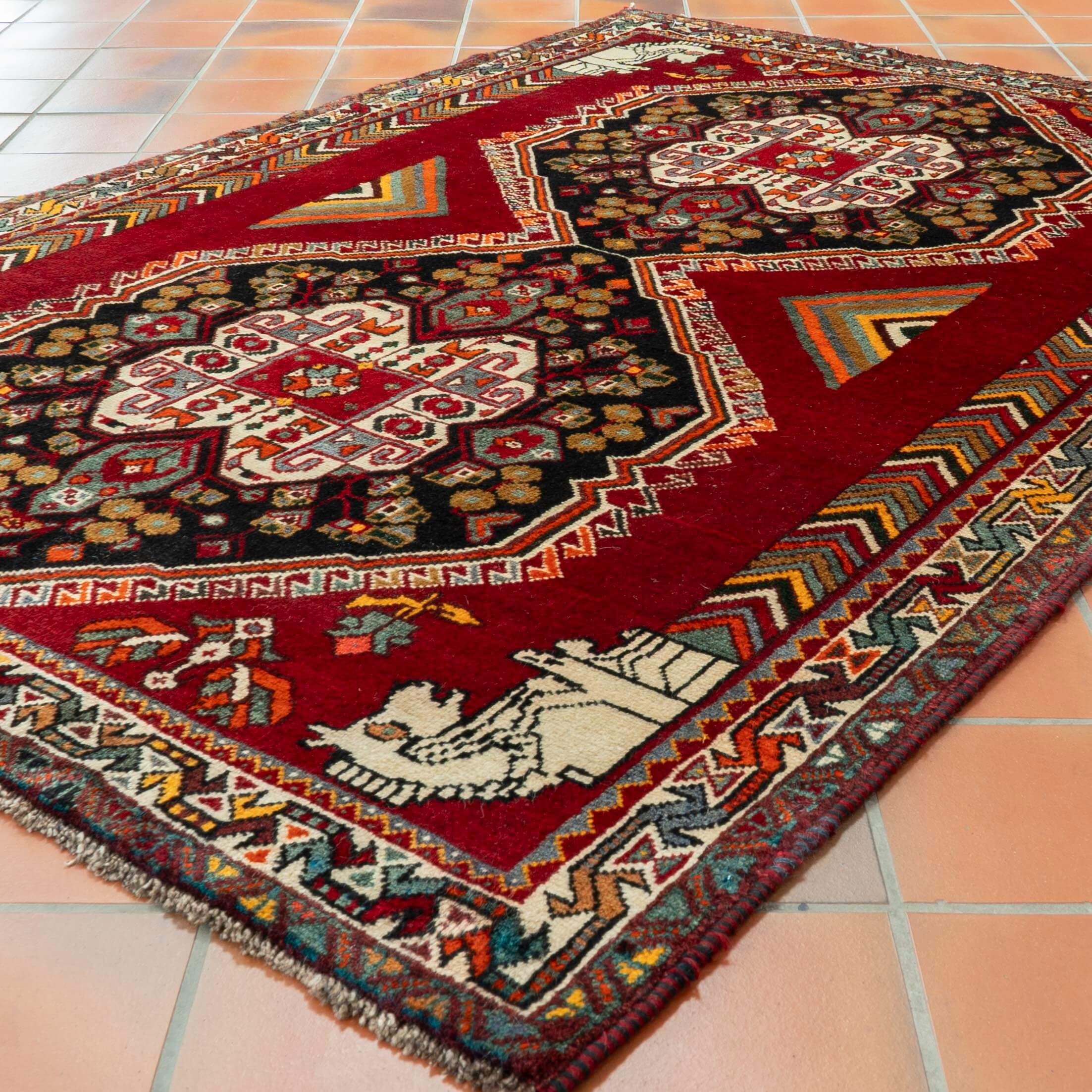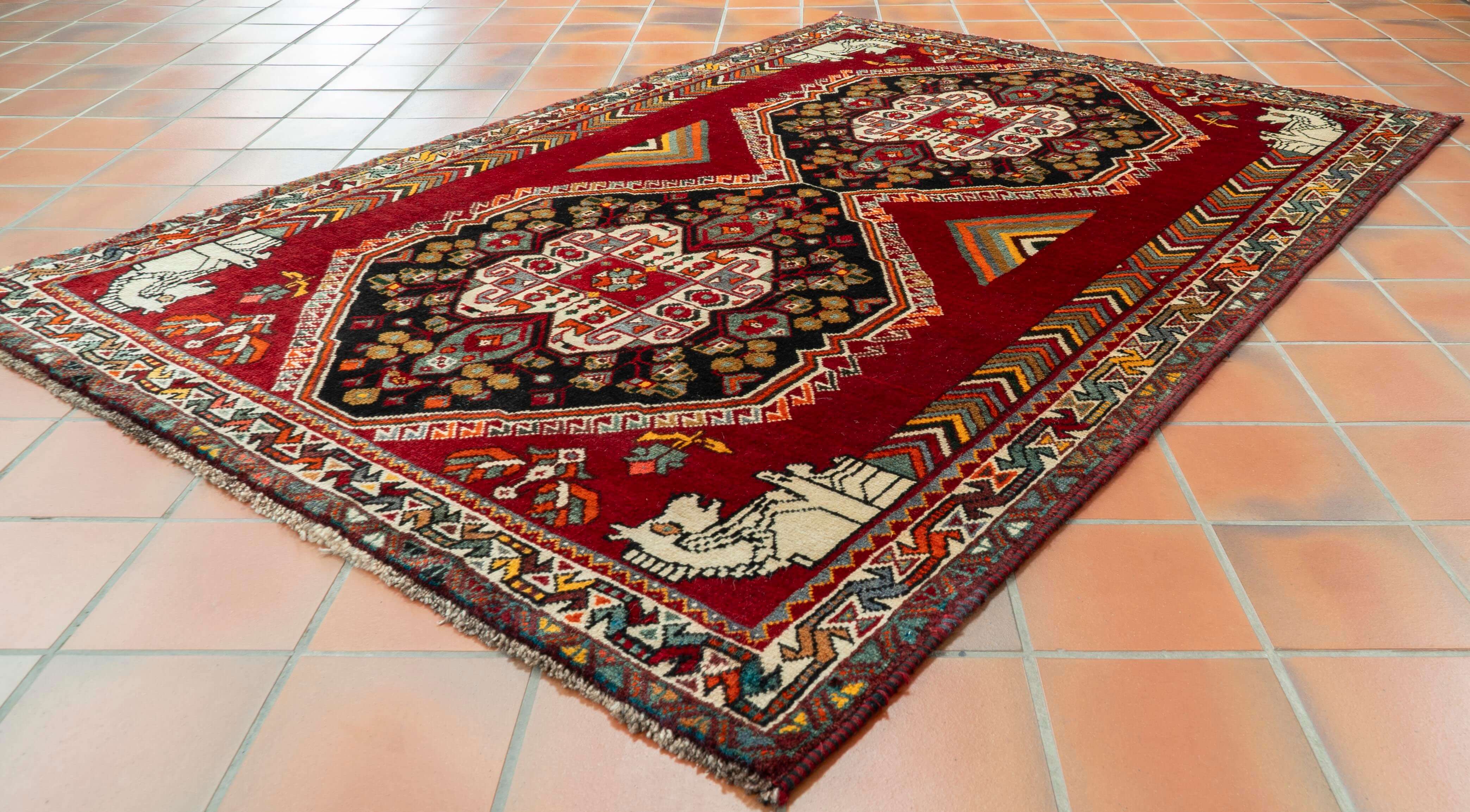 Being nomadic, these people often camp around the ancient site of Persepolis, where you will find horse heads on columns, which is why they have woven them into this rug.