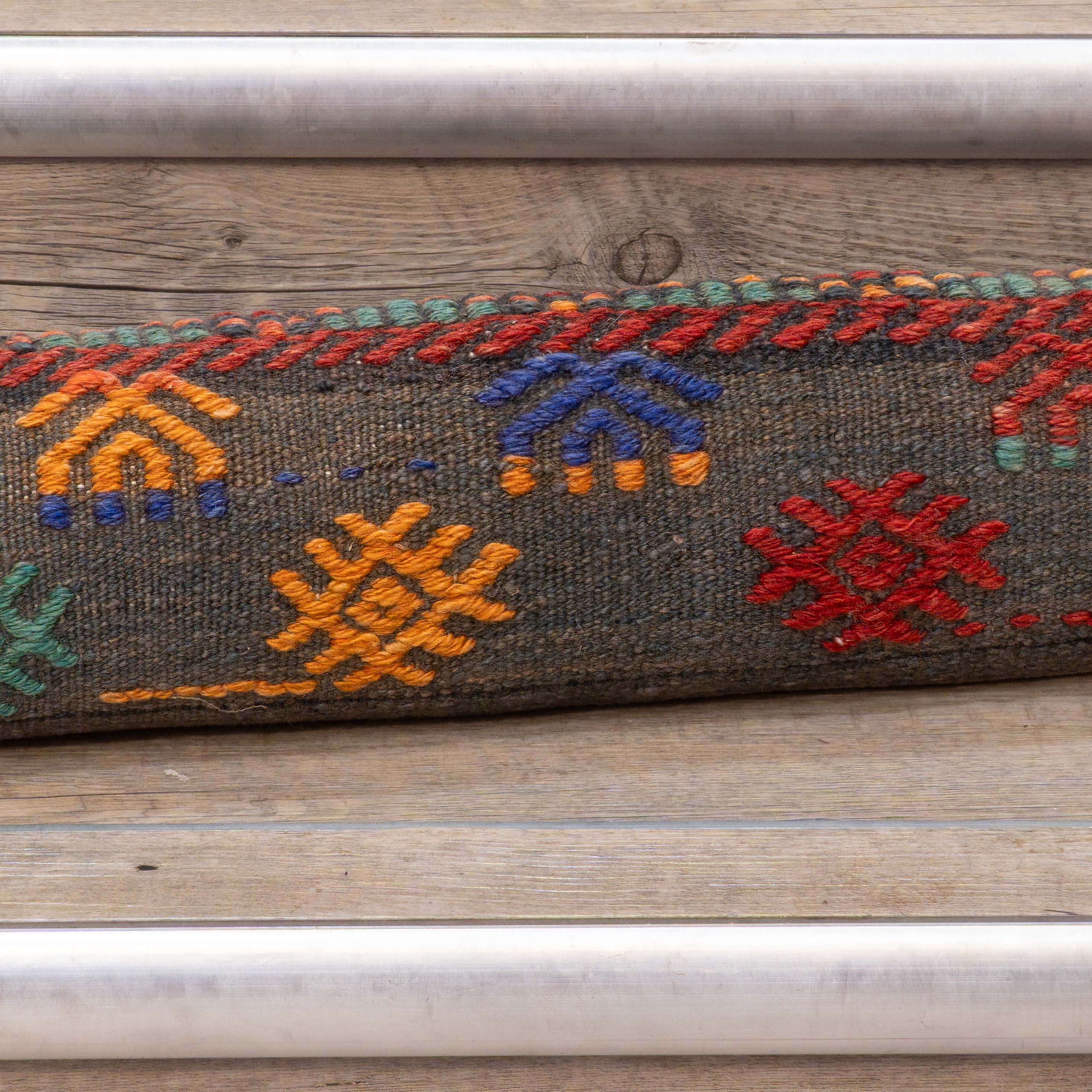 We are fortunate to have these draught excluders on the website; the old kilims are becoming harder to find and quite desirable. This lovely draught excluder is made from a salvaged piece of Turkish Kilim. It is single-faced, with a faux-suede/linen backing and fibre fill. Each draught excluder is unique and not repeatable.
