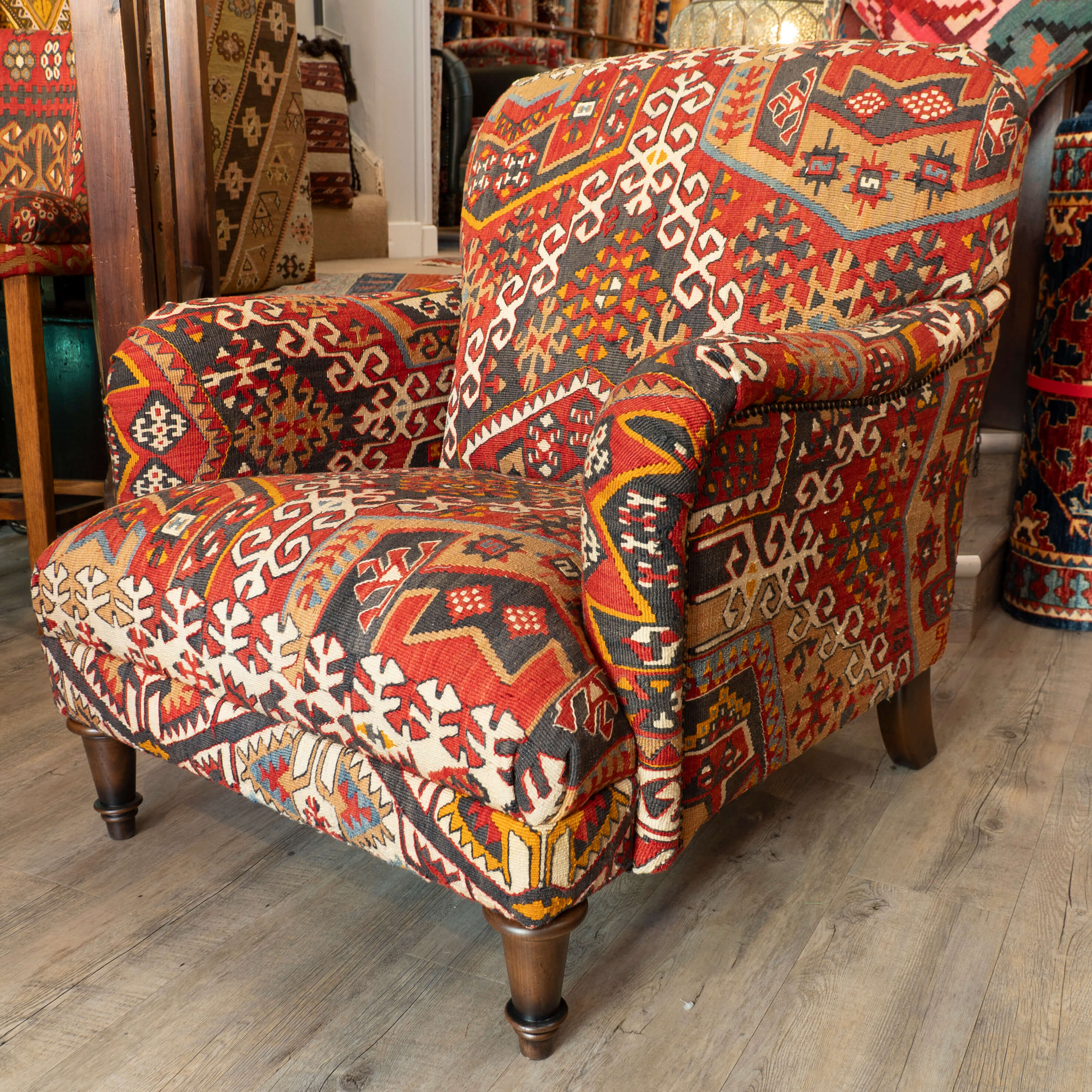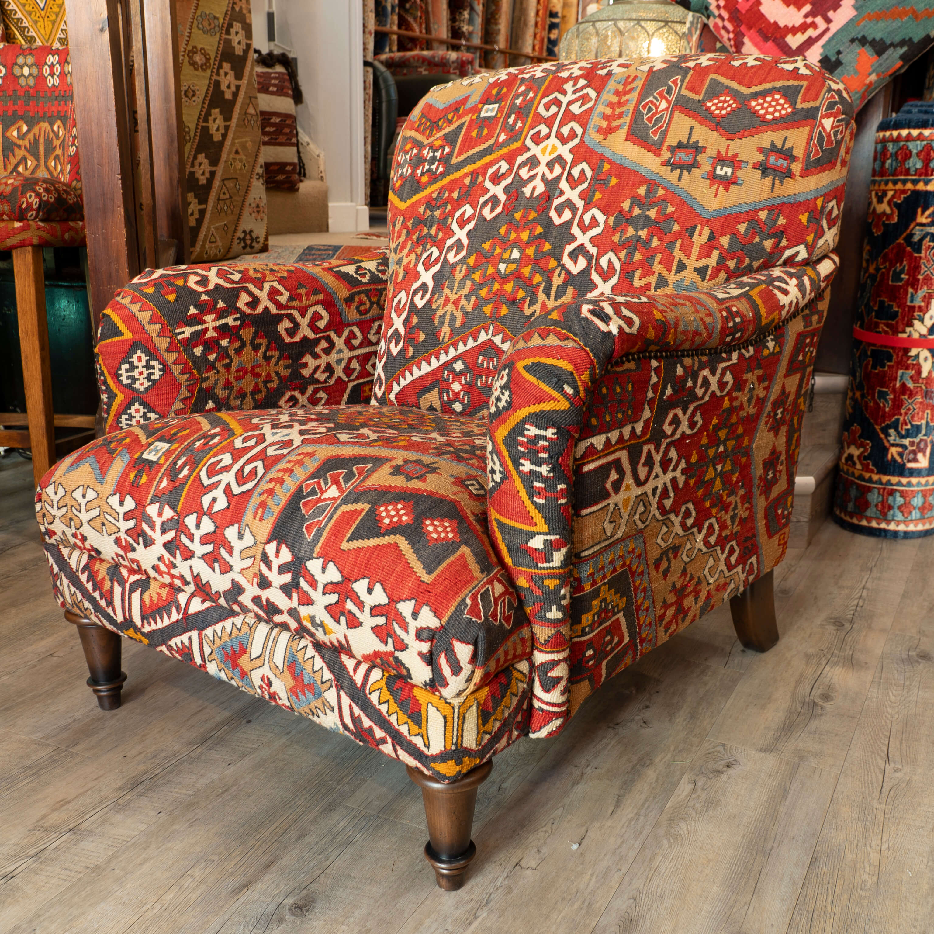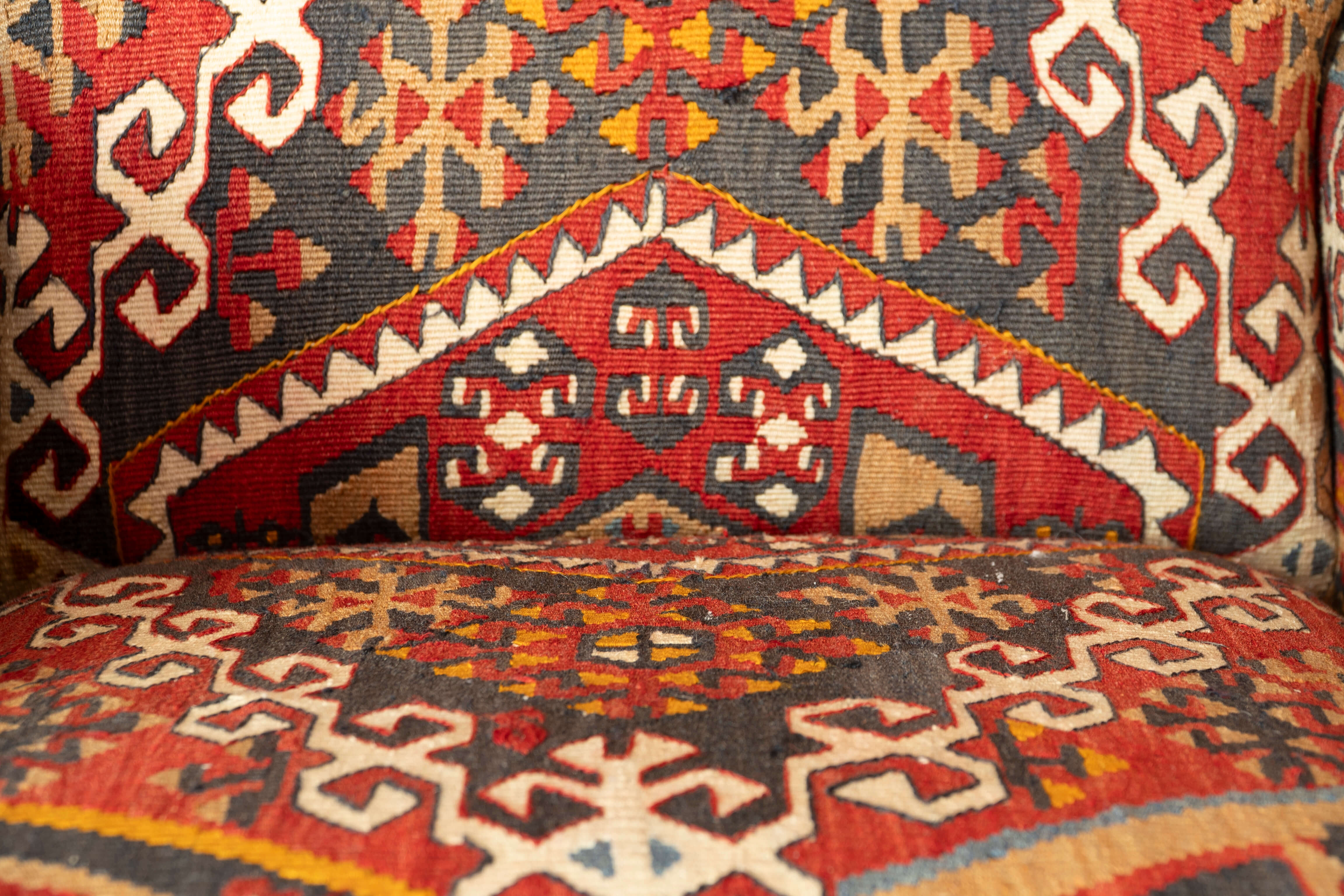 The Howard chair is a timeless, classic design for a country house. This chair has been covered in old Anatolian Kilim, which means it is colourful, comfortable and durable. Often, the colours in the old kilims have toned down, and the fabric has softened, making it more malleable for working. The Kilim is cut as sympathetically as possible, ensuring that the material is shown to the best advantage possible when planning the layout of the fabric on the chair. It's surprising how much Kilim is needed to cover a frame, and every bit is used up, with the leftovers being made into cushions and draft excluders.