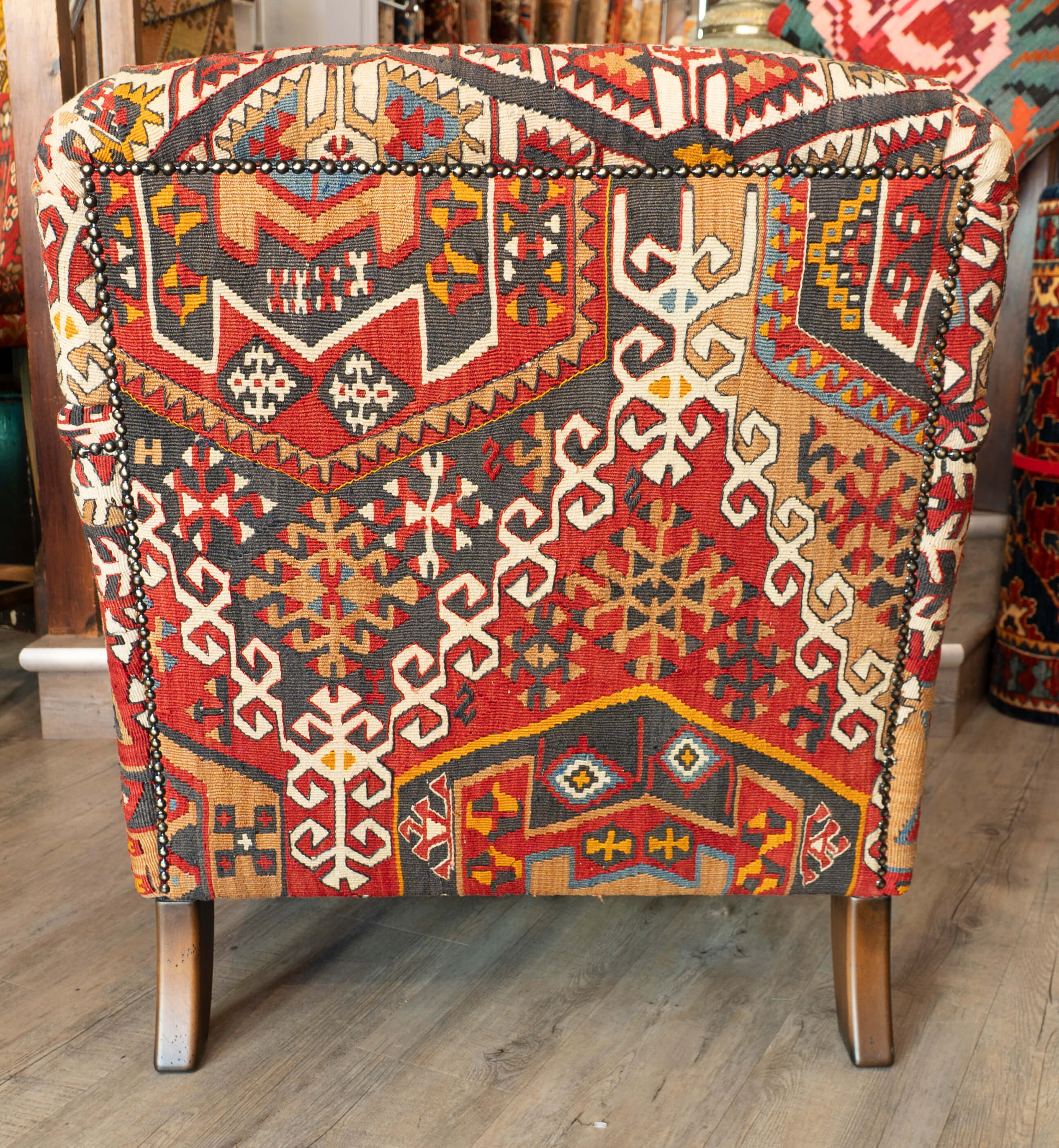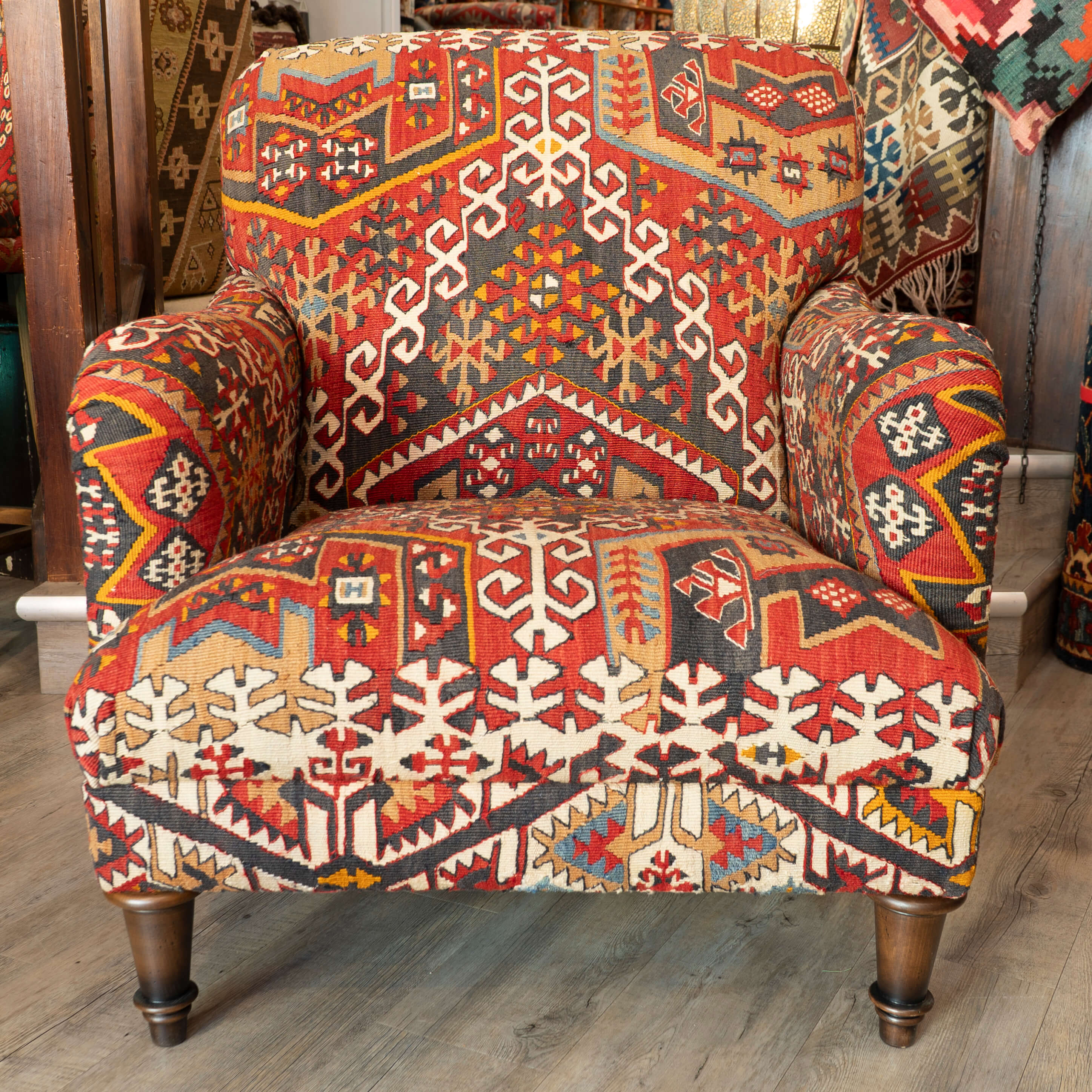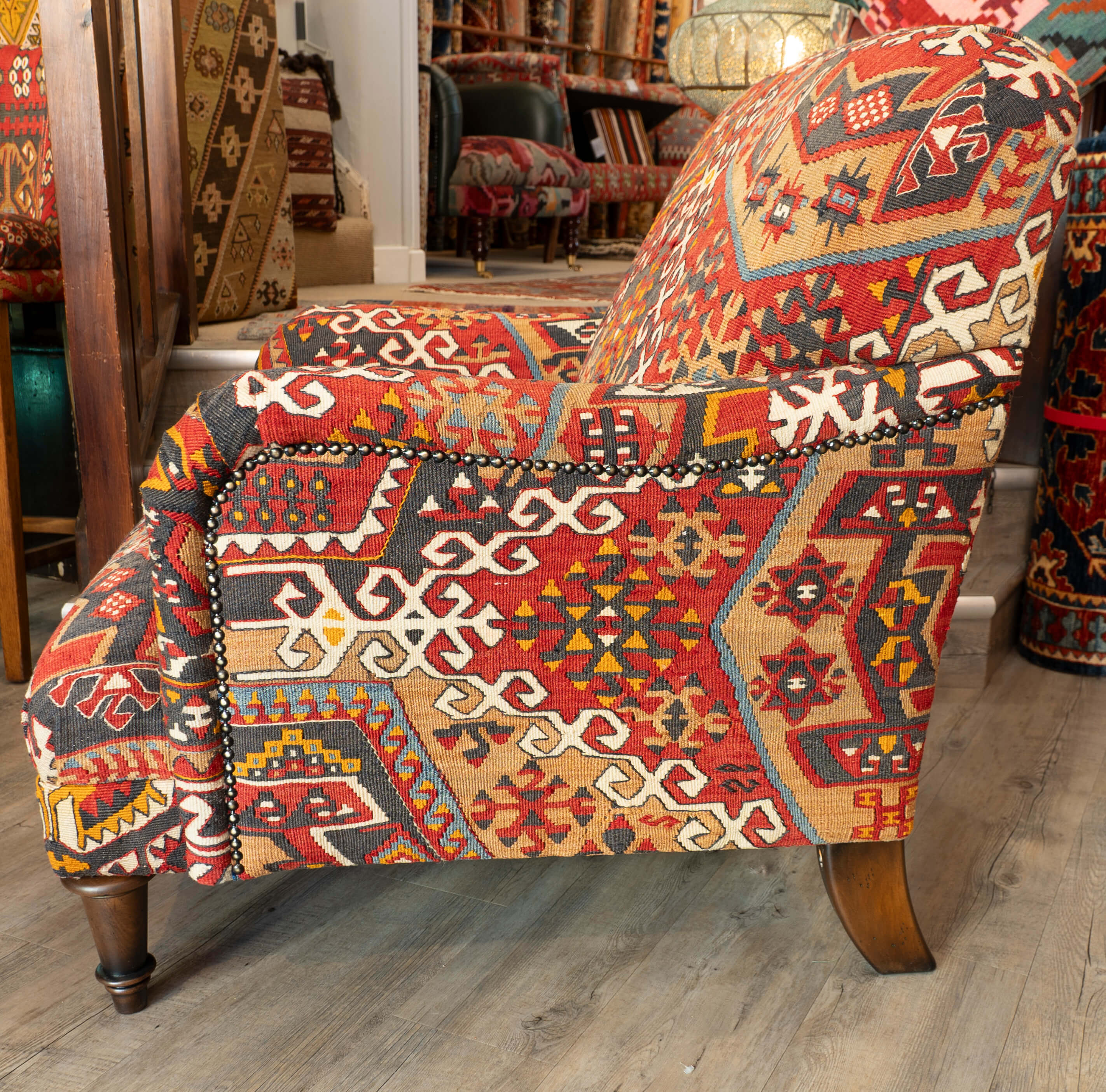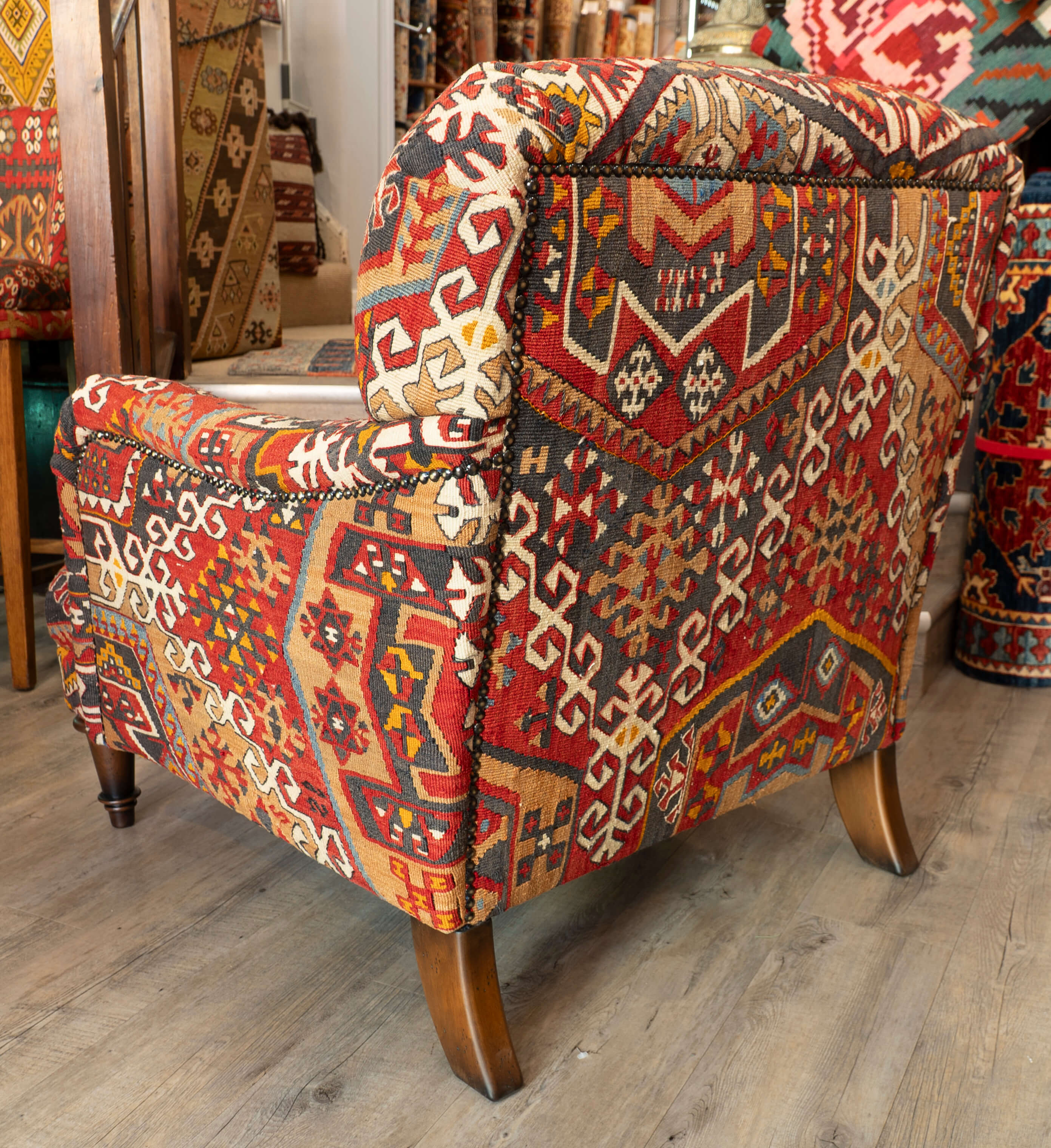 The Howard chair is a timeless, classic design for a country house. This chair has been covered in old Anatolian Kilim, which means it is colourful, comfortable and durable. Often, the colours in the old kilims have toned down, and the fabric has softened, making it more malleable for working. The Kilim is cut as sympathetically as possible, ensuring that the material is shown to the best advantage possible when planning the layout of the fabric on the chair. It's surprising how much Kilim is needed to cover a frame, and every bit is used up, with the leftovers being made into cushions and draft excluders.