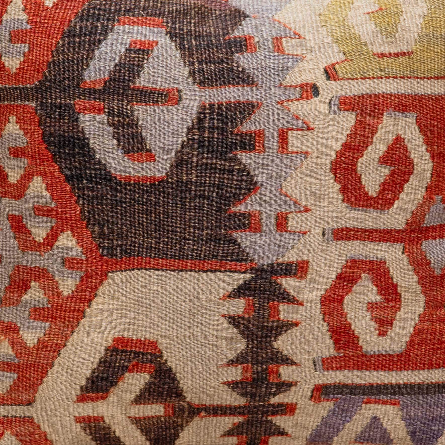 Our collection of kilim cushions offers great colours, designs, and textures. The pieces are often taken from larger old kilims, sometimes antiques, and cleaned and sorted to repurpose and salvage a treasured fabric that would otherwise be lost. The pattern may be cut in unusual and interesting ways to ensure that as much of this precious resource as possible is saved. In addition, the cushions are fibre-filled, making them suitable for individuals with feather allergies.  Product size: 40 x 40cm (1'4 x 1'4)