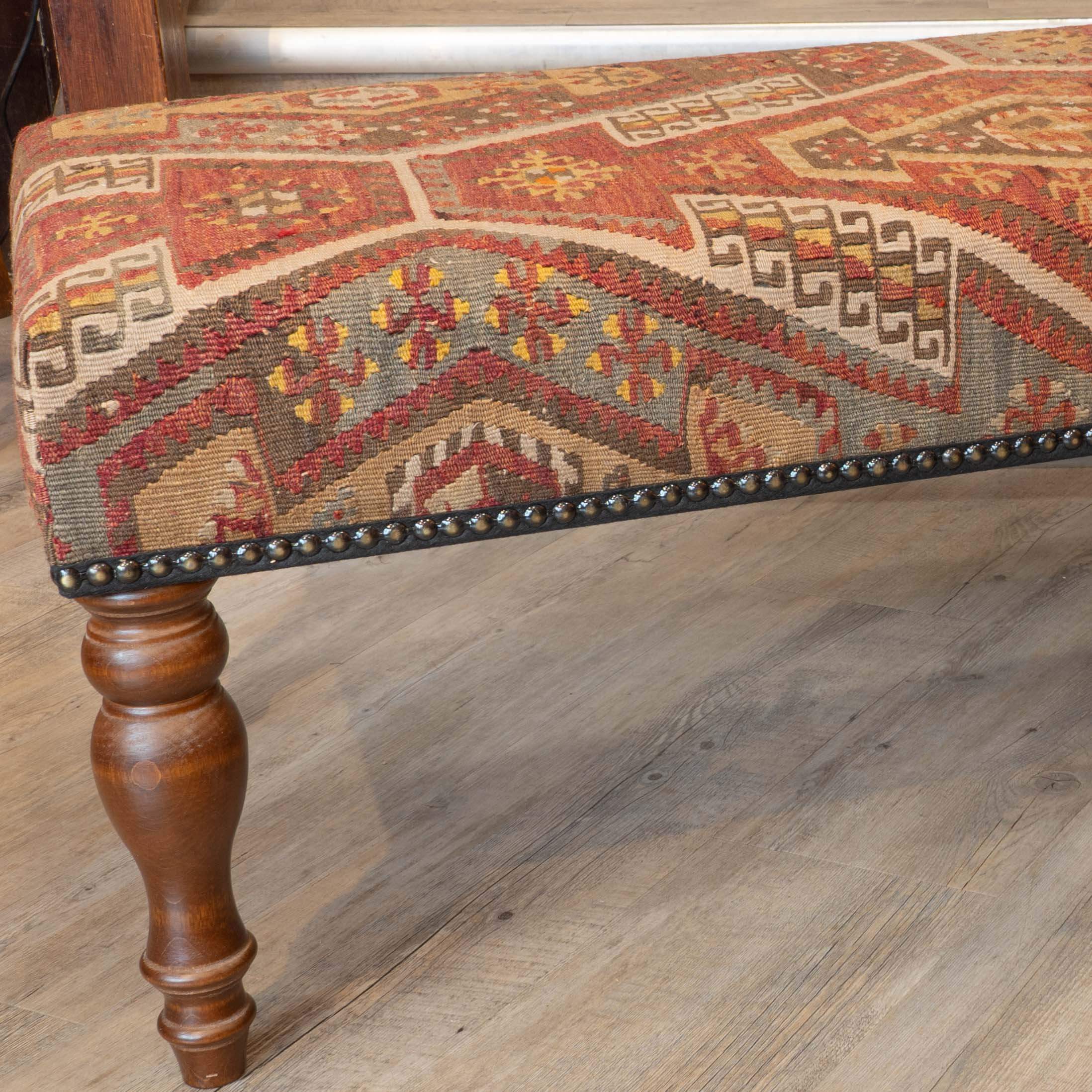 This long bench is another great, unique furnishing piece, as the fabric is old, repurposed Turkish floor Kilim. Although the kilim is old, it will remain a serviceable, valued item for many years. Moreover, the old kilim looks much better over time; the colours are much softer, and age, in this instance, is kind.