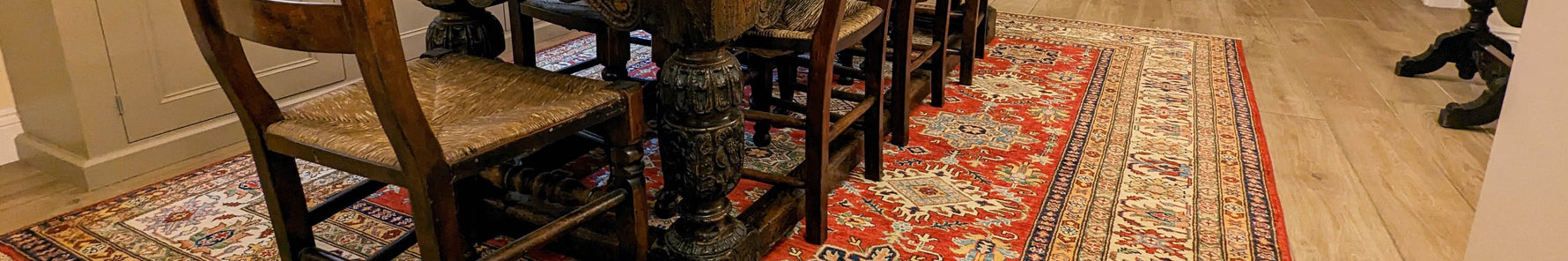 The design's sharpness indicates the rug's quality, but looking at the back reveals how finely knotted it is. Of course, the finer the knotting, the more work involved and the higher the price. This quality Afghan Kazak rug is of great value for money....- £1,185.75