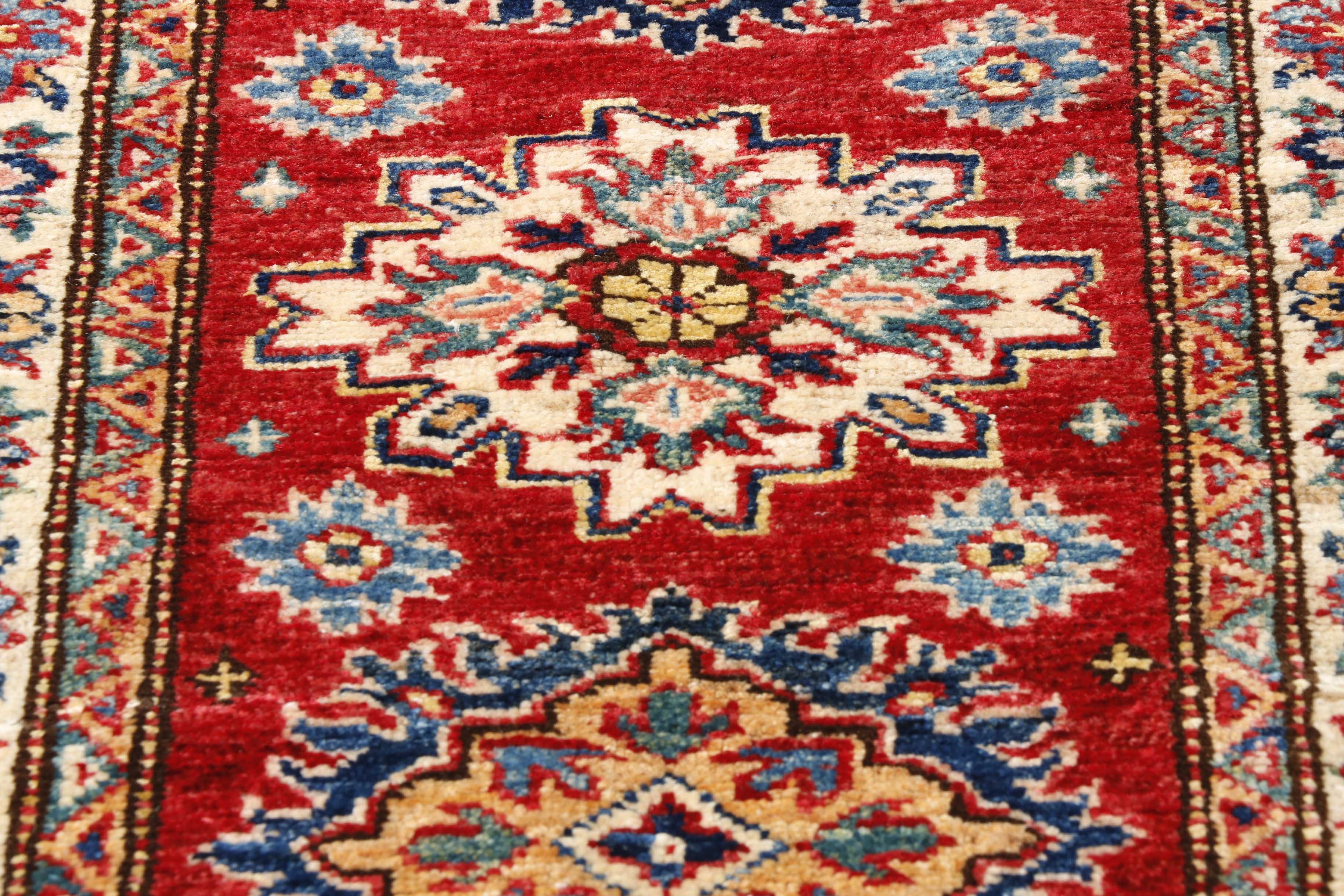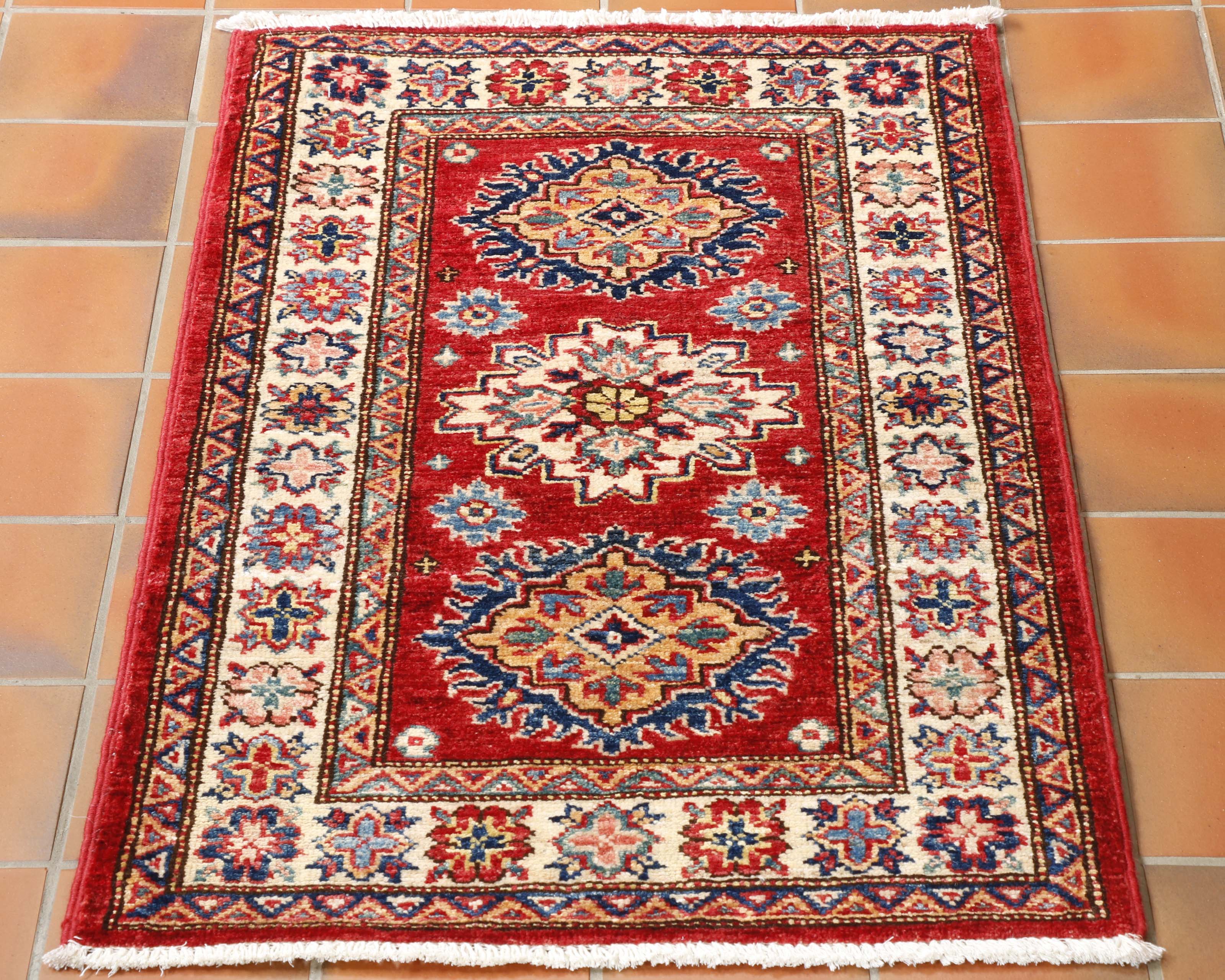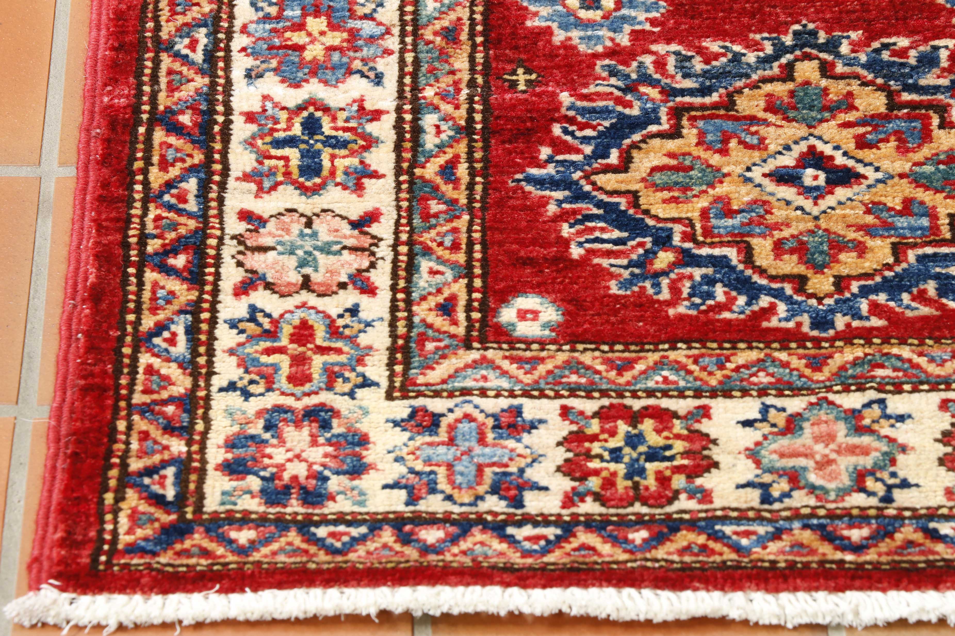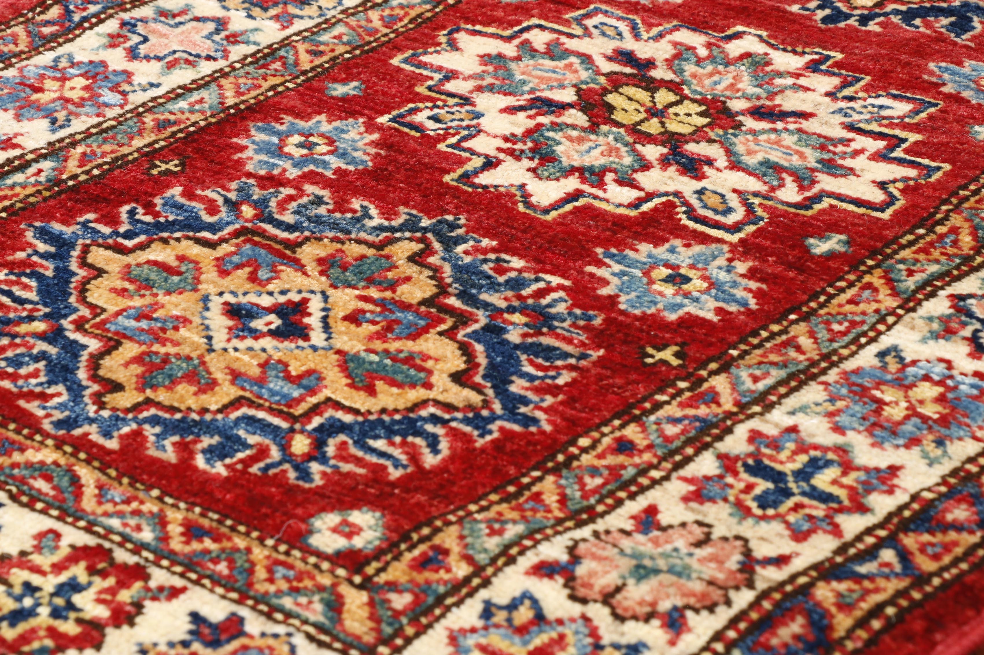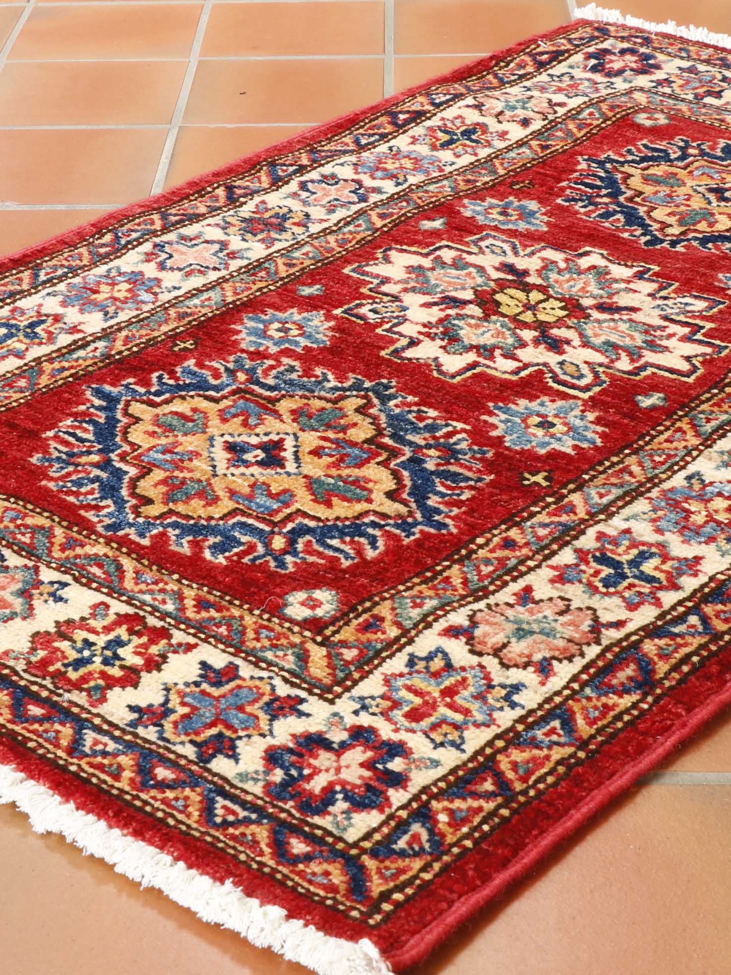Although Kazaks are hand-knotted in Afghanistan, the design originates from the Caucasus. The short pile emphasises the sharpness of the pattern. Each piece is made using excellent Afghan wool, usually spun in Ghazni. The Afghan wool is generally slightly coarser and more curly than other wools and is perfect for carpet weaving. Afghan Kazak carpets are traditionally made with bold geometric designs in intense, vibrant colours such as rich reds, warm terracottas, and shades of blues with soft golds and creams.