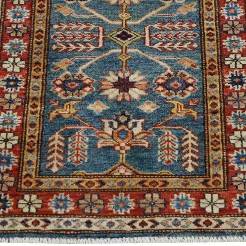 Although Kazaks are hand-knotted in Afghanistan, the design originates from the Caucasus. The short pile emphasises the sharpness of the pattern. Each piece is made using excellent Afghan wool, usually spun in Ghazni. The Afghan wool is generally slightly coarser and more curly than other wools and is perfect for carpet weaving. Afghan Kazak carpets are traditionally made with bold geometric designs in intense, vibrant colours such as rich reds, warm terracottas, and shades of blues with soft golds and creams.