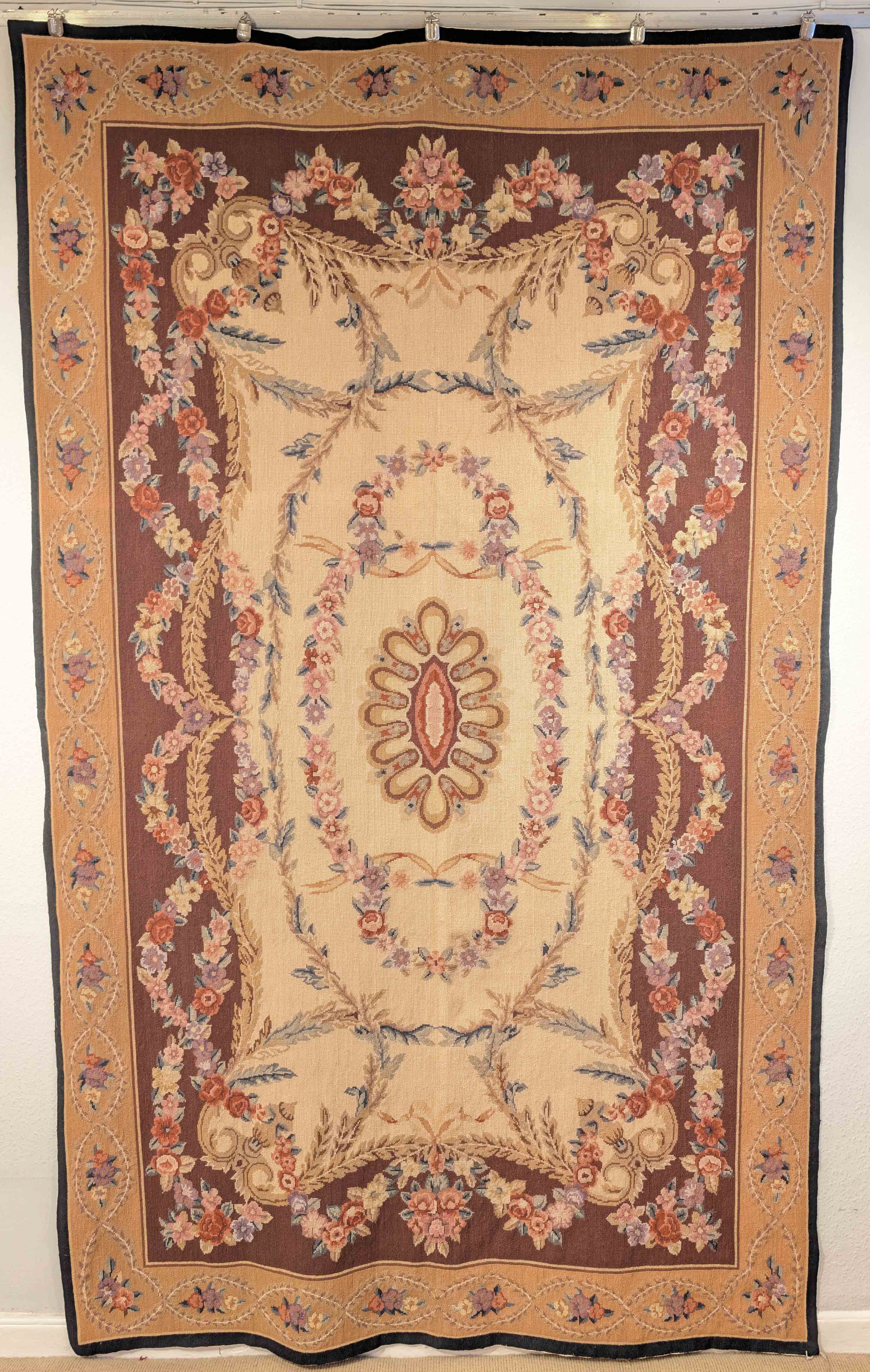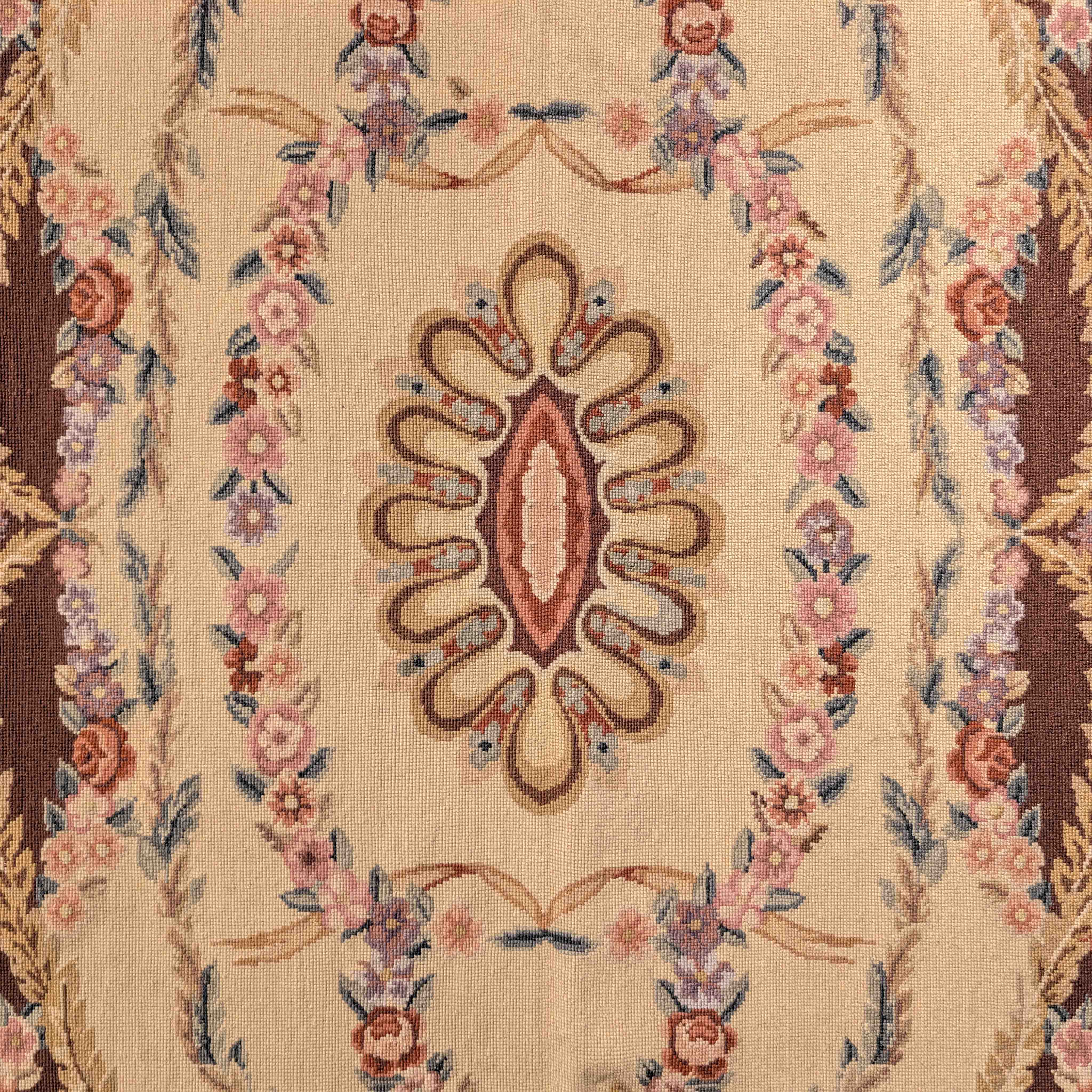 This needlepoint rug is the only piece we have. It has not been listed on our website before because it is unique. Sometimes Clare falls for something unusual, and this is one of them. It may suit an older-style property with beams, where it could be wall-hung. The needlework creates a beautiful, textured image in rich autumnal colours. It is handmade with wool stitched onto a cotton foundation. It is used as a floor rug. I recommend an antislip underlay.