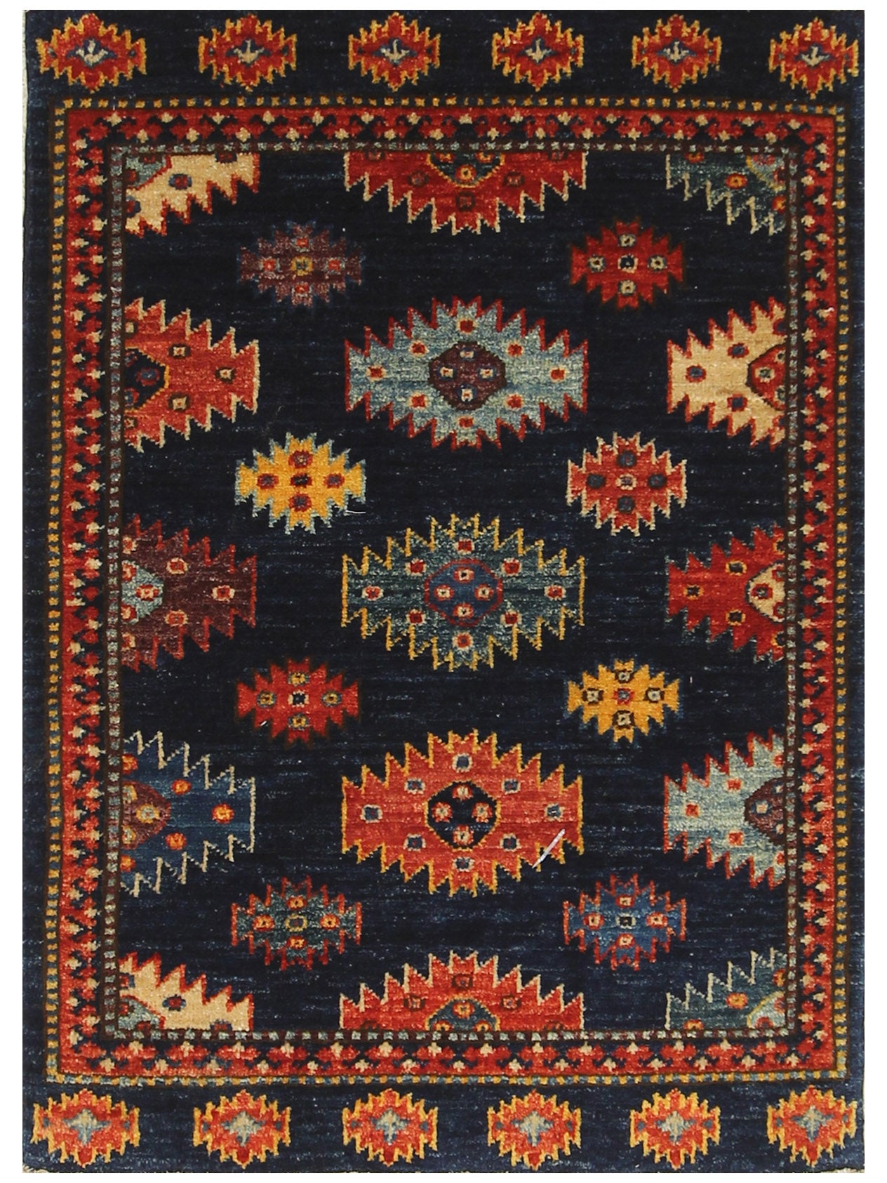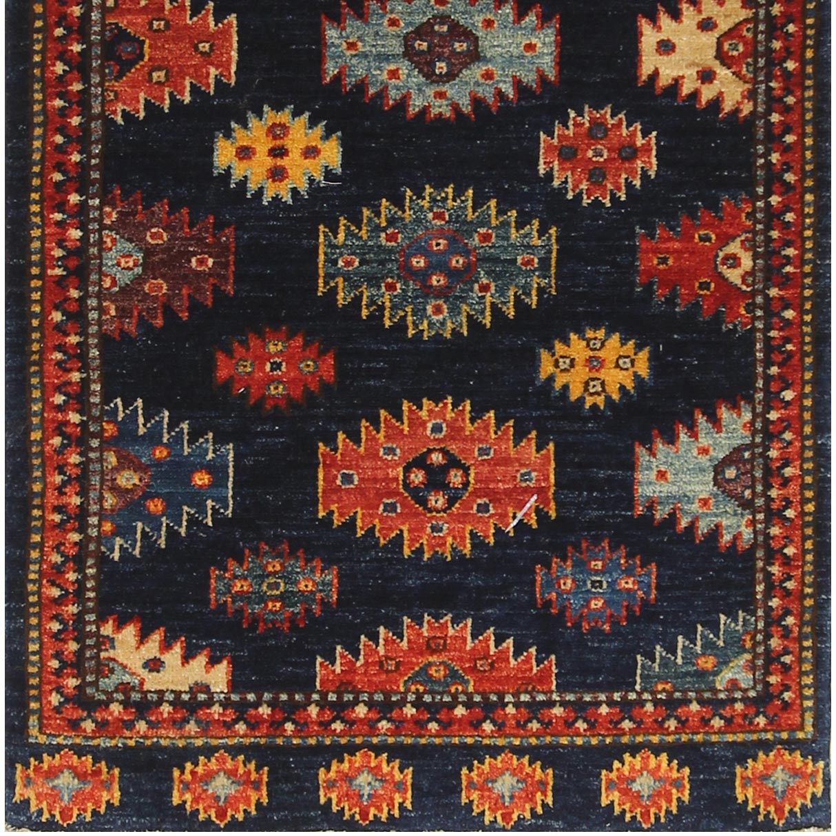 This handmade Afghan Ersari rug perfectly balances traditional craftsmanship and modern practicality. Crafted by artisan weavers in a cottage industry in Afghanistan, its Turkoman design features a navy background and vegetable-dyed, handspun wool. It's a statement piece and hardwearing, making it ideal for any home.