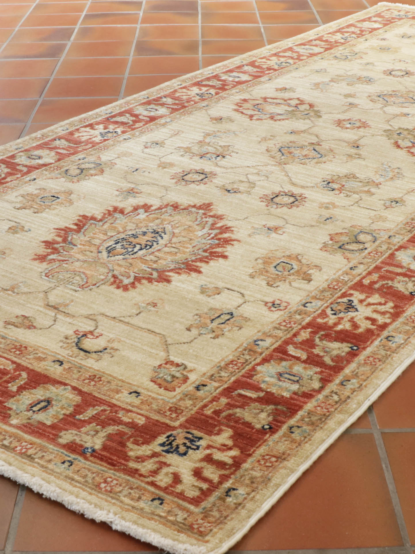 This extra fine handmade Afghan Ziegler is crafted with sophistication and exclusive detail. It has a vegetable-dyed hand-spun wool and cream background accented by a terracotta border. This traditional, handcrafted piece is skillfully woven in a cottage industry of northwest Afghanistan, making it a luxurious and practical choice ideal for adding an elegant touch to a hallway or landing. Its hardwearing composition and fine quality make it an ideal short runner.