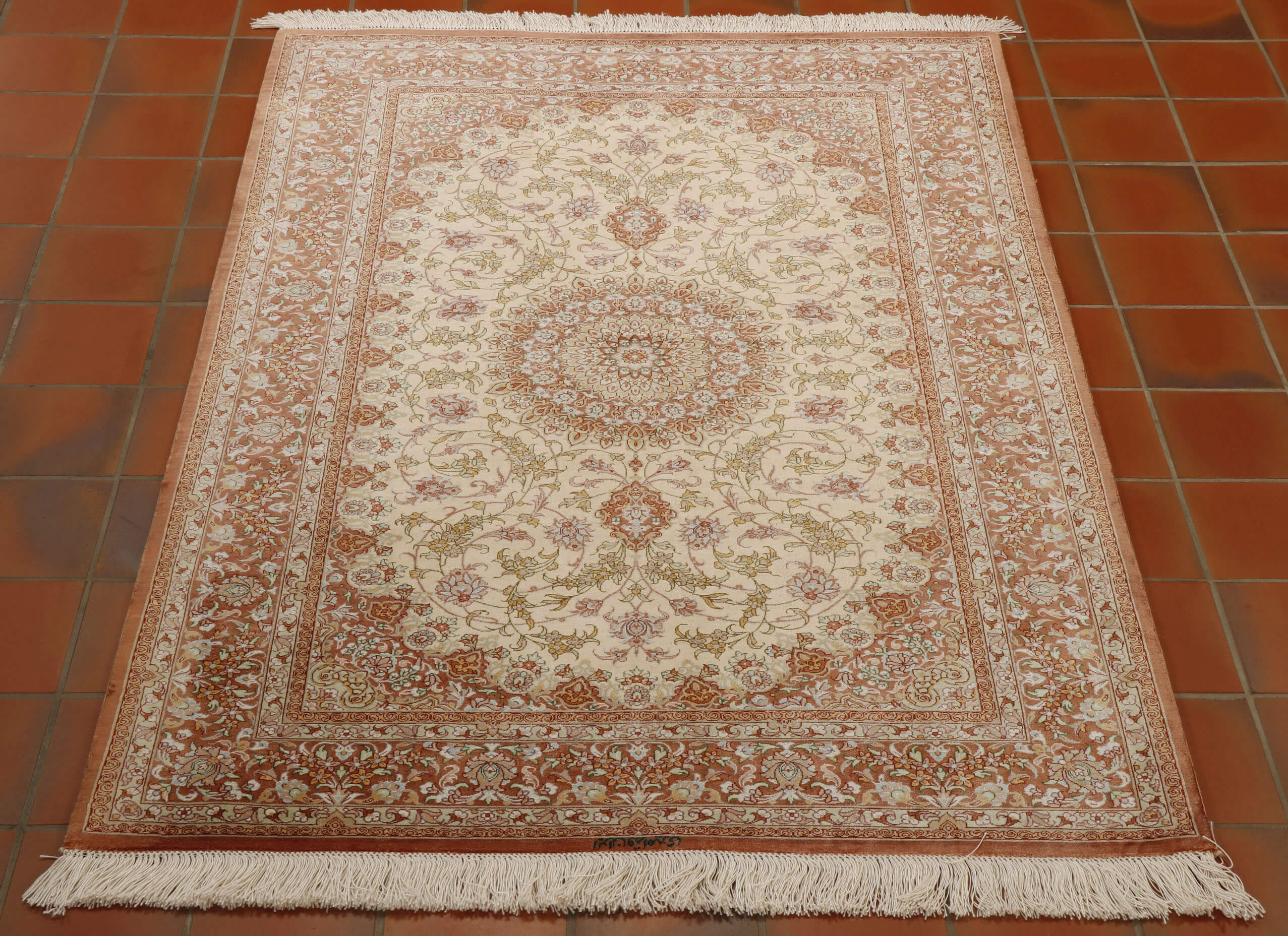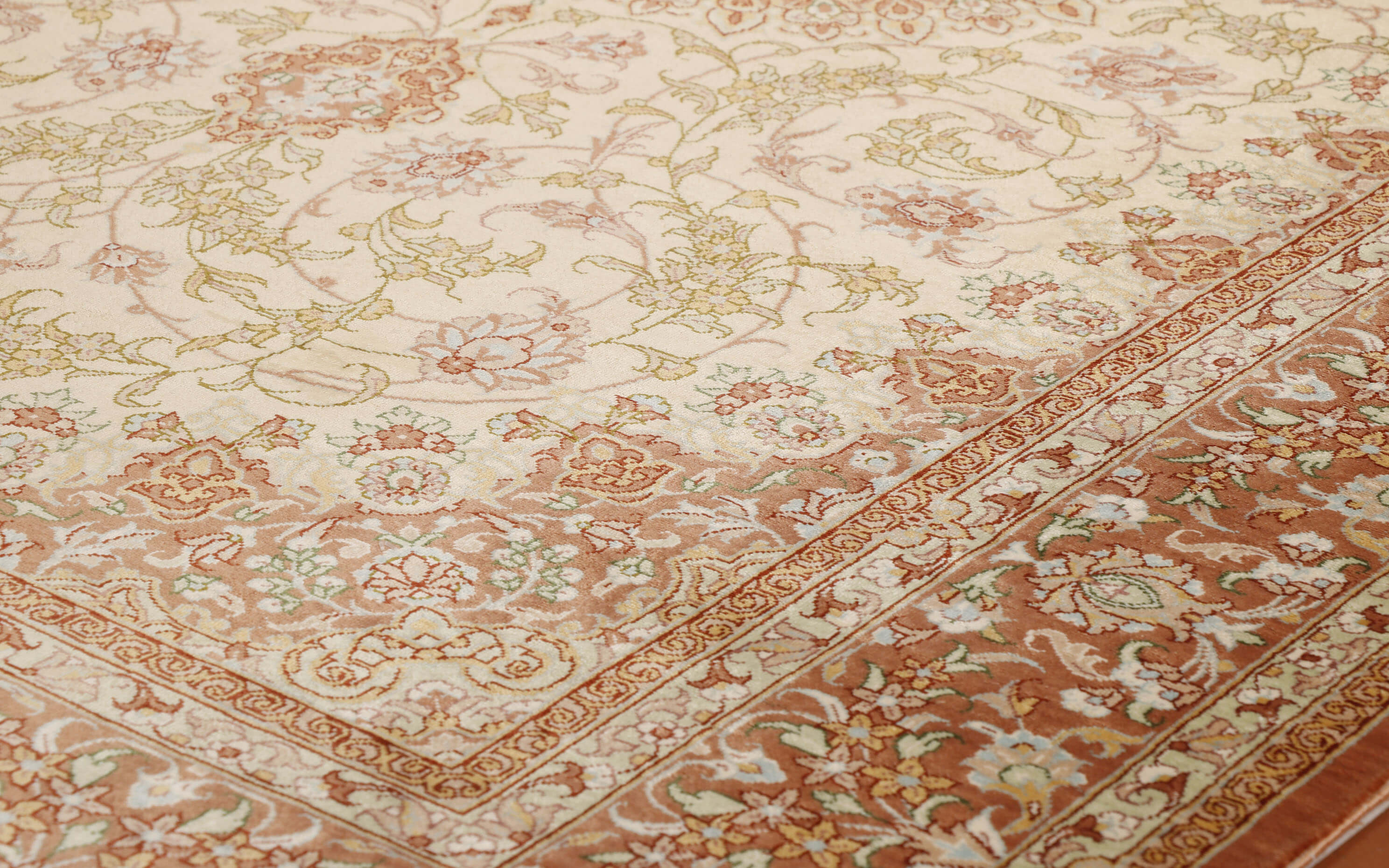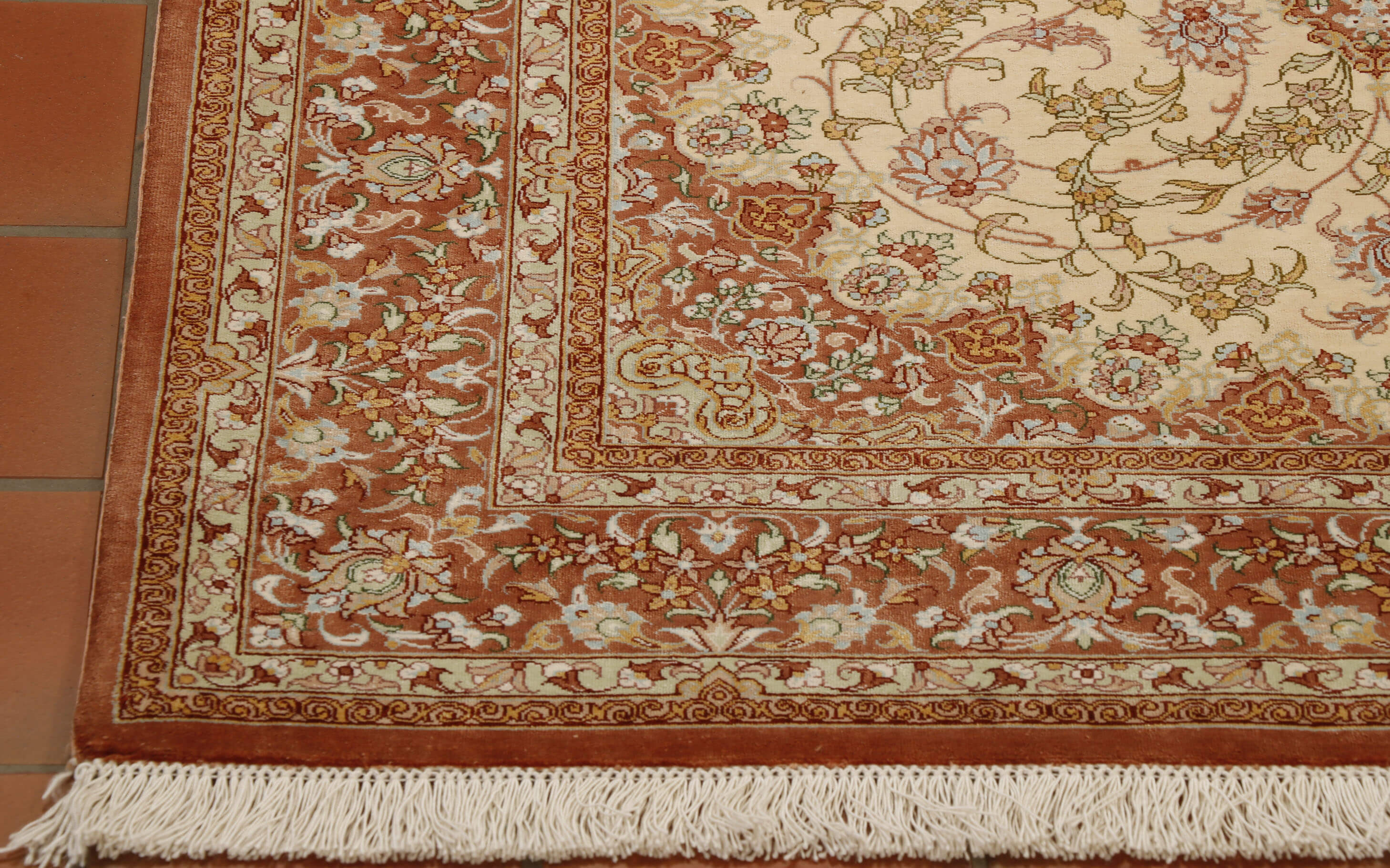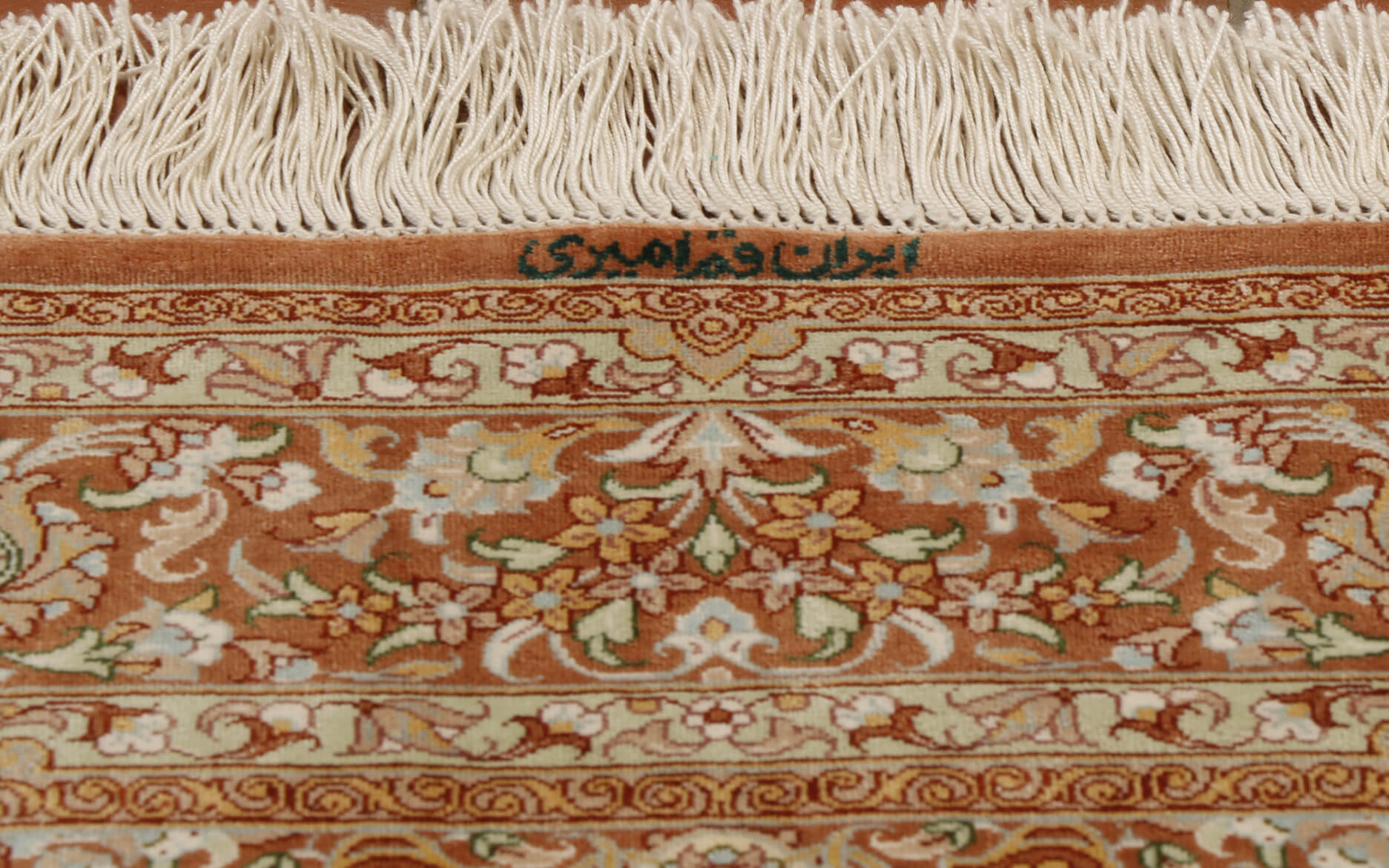 Persian Qum (Ghom) silk rugs are considered among the finest oriental rugs produced. They have been manufacturing rugs and carpets in Qum since the late 1800s. The intricate designs must be worked out on graph paper before weaving commences. The knot count on silk rugs can range from 200 to 1000 knots per square inch. As the silk ply is thin, the rug takes much longer to grow, and weaving should be limited to 8 hours per day to avoid eye strain. This piece has the master weaver's signature woven into the end border.