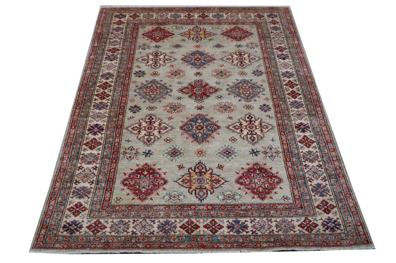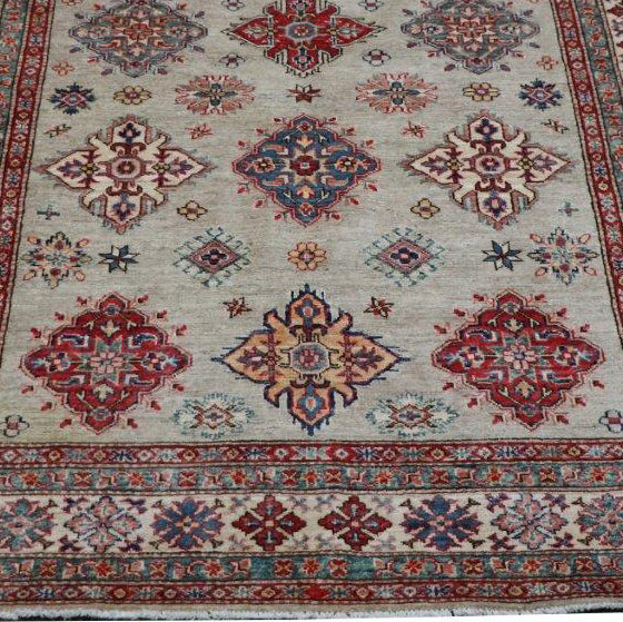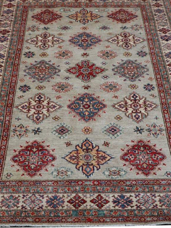 Although Kazaks are hand-knotted in Afghanistan, the design originates from the Caucasus. The short pile emphasises the sharpness of the pattern. Each piece is made using excellent Afghan wool, usually spun in Ghazni. The Afghan wool is generally slightly coarser and more curly than other wools and is perfect for carpet weaving. Afghan Kazak carpets are traditionally made with bold geometric designs in intense, vibrant colours such as rich reds, warm terracottas, and shades of blues with soft golds and creams.