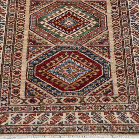 You can buy this handmade carpet before it arrives in our Tewkesbury showroom. As the rug has not yet been received into our stock, it has yet to be properly photographed; the images are not as good as our normal images. Once the rug has been transferred from our warehouse, we will rephotograph it.  Please click the hyperlinks below in gold if you want additional information. Although Kazaks are hand-knotted in Afghanistan, the design originates from the Caucasus. The short pile emphasises the sharpness of the pattern. Each piece is made using excellent Afghan wool, usually spun in Ghazni. The Afghan wool is...