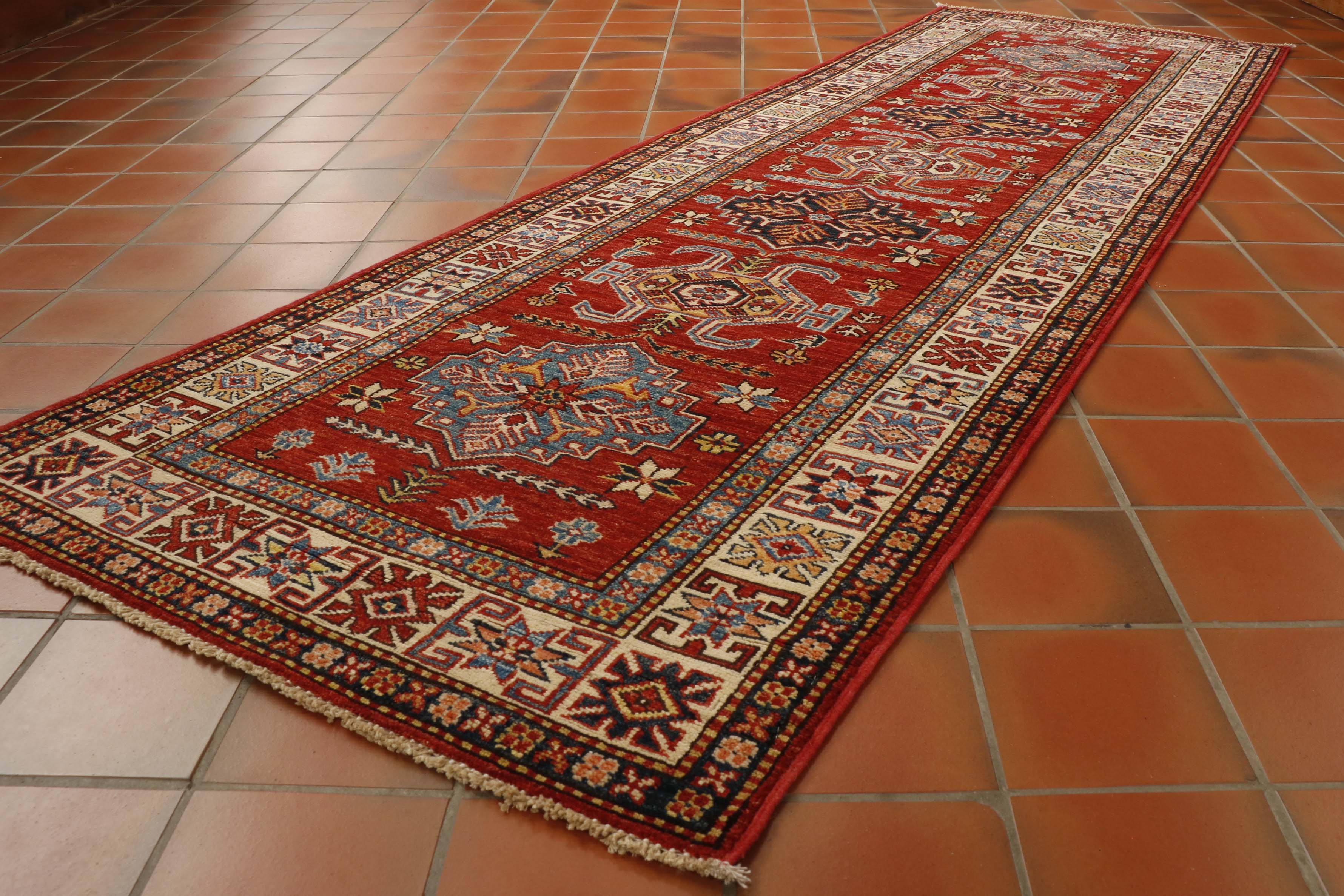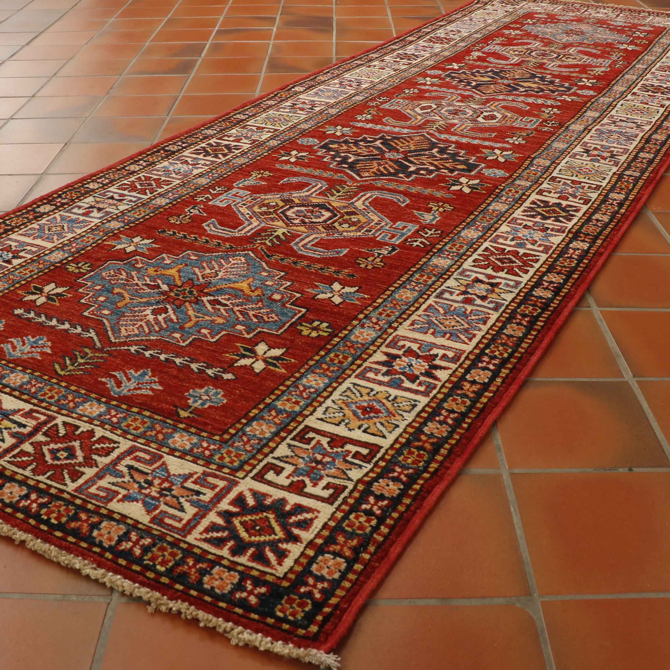 A new handmade runner knotted with vegetable-dyed wool using old designs in classic Kazak colours. The middle ground is an intense red with multiple medallions along the length using shades of blue and gold. The outer border is ivory. The piece is of fine quality, finished with a short pile and barely visible fringe.