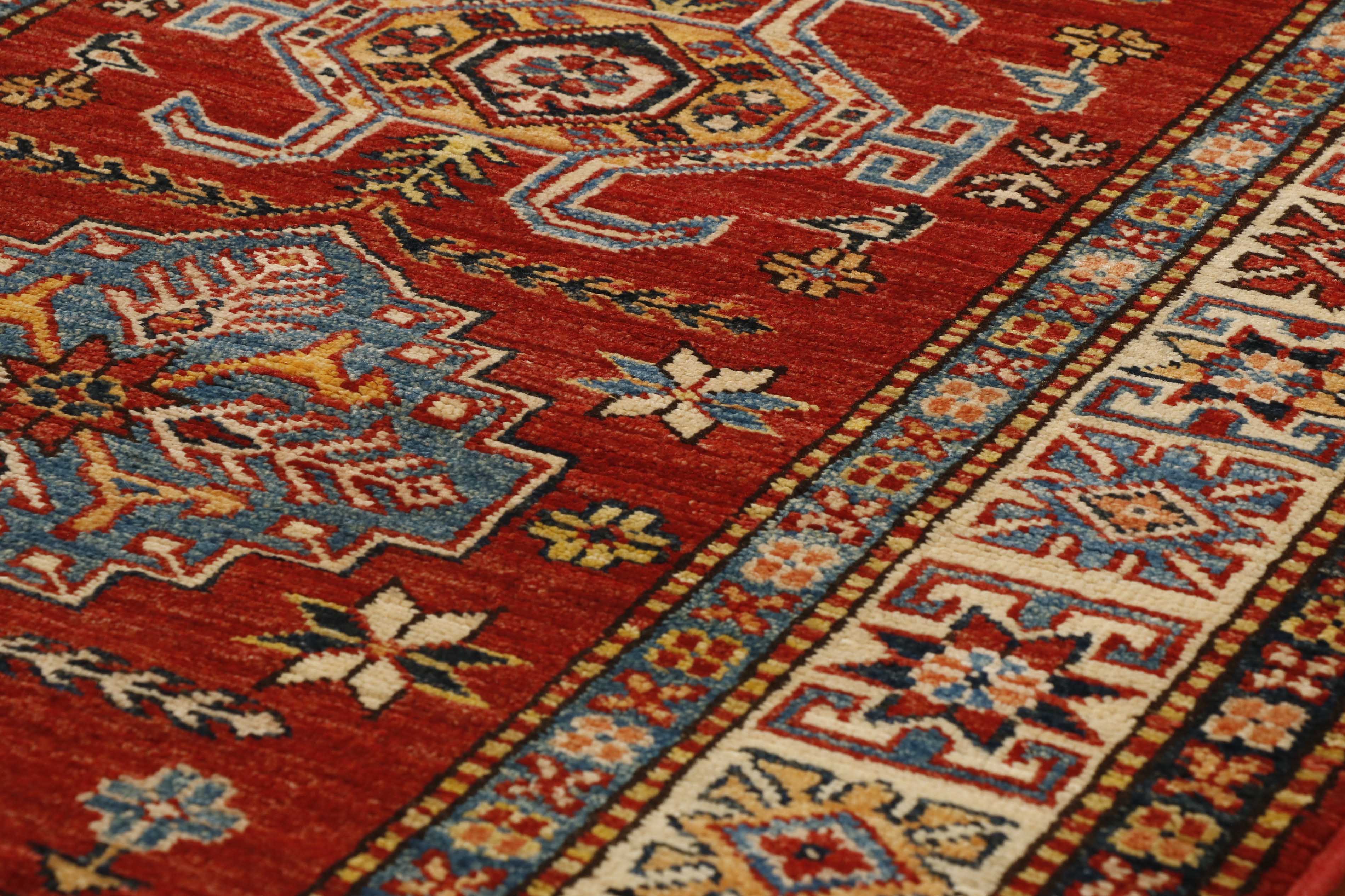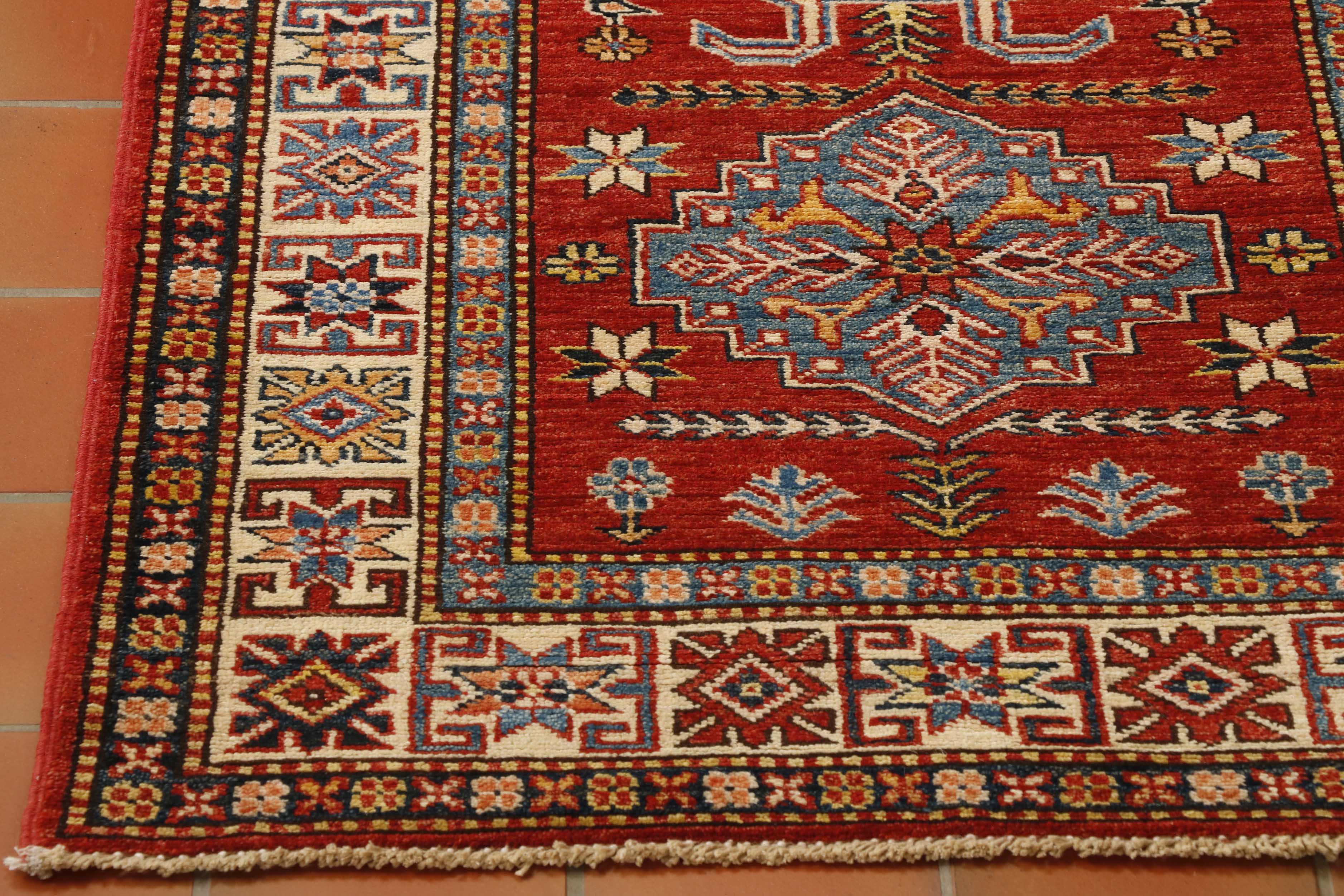 Although Kazaks are hand-knotted in Afghanistan, the design originates from the Caucasus. The short pile emphasises the sharpness of the pattern. Each piece is made using excellent Afghan wool, usually spun in Ghazni. The Afghan wool is generally slightly coarser and more curly than other wools and is perfect for carpet weaving. Afghan Kazak carpets are traditionally made with bold geometric designs in intense, vibrant colours such as rich reds, warm terracottas, and shades of blues with soft golds and creams.