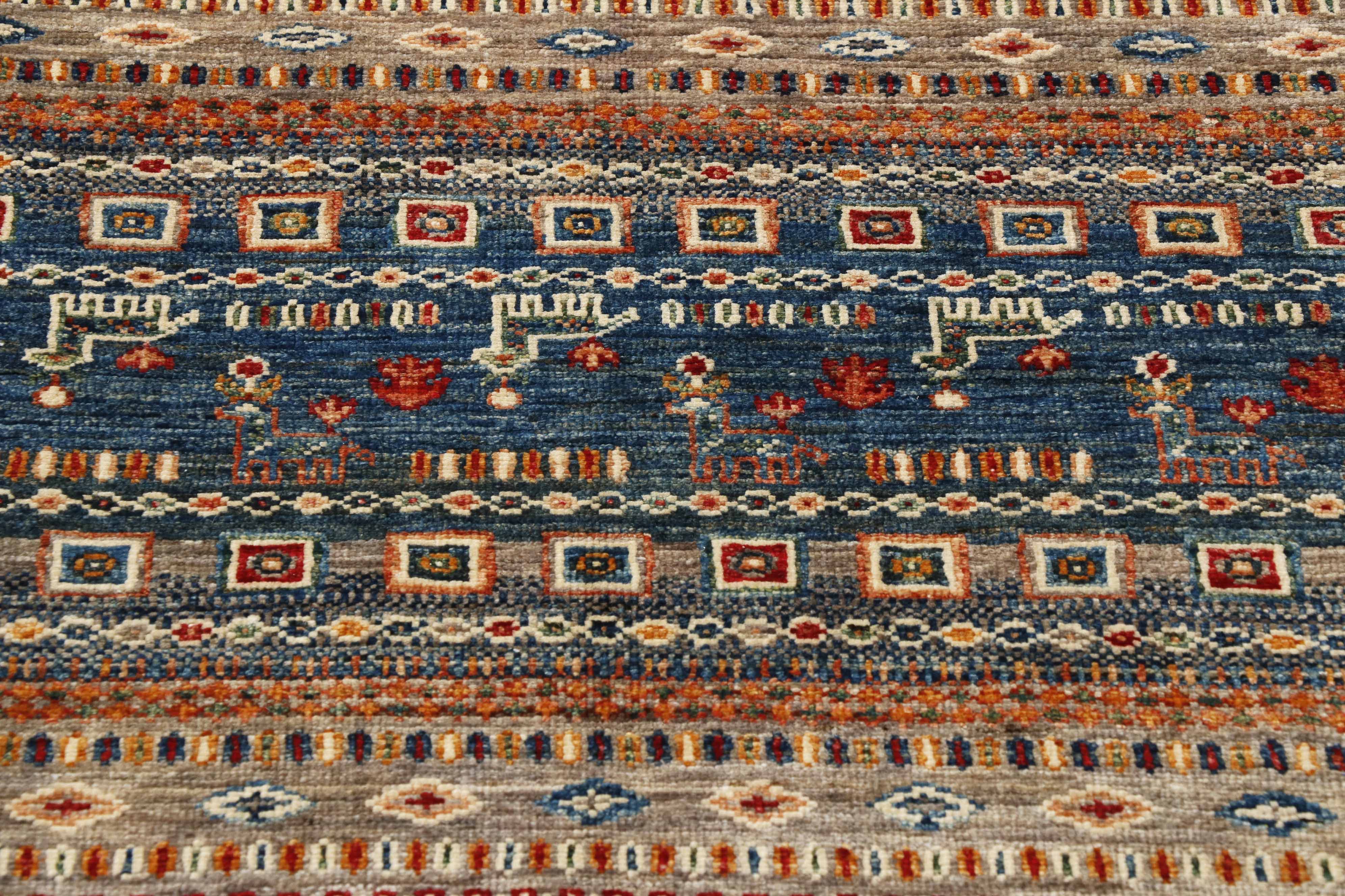 The carpets are still hand-knotted, and the wool is coloured with vegetable dye. The Loribaft rug designs can be reminiscent of Gabbeh designs, although the Loribaft pieces are finer and more tightly knotted. The colours of the Loribaft rugs and carpets are similar in many ways to those used in our Samarkand collections, and they are possibly more vibrant. The main distinction is that the patterns are playful, with a vibrant colour palette and simple design, with stylised animals, plants, trees or characters with block colour often mimicking an ombre effect. Some of the Loribaft pieces do not have fringes, so they are finished with a plain kilim end or binding, which is secured to prevent fraying. Other rugs are produced, like the Samarkand carpets, with an unusual bobbin wind on the warps.