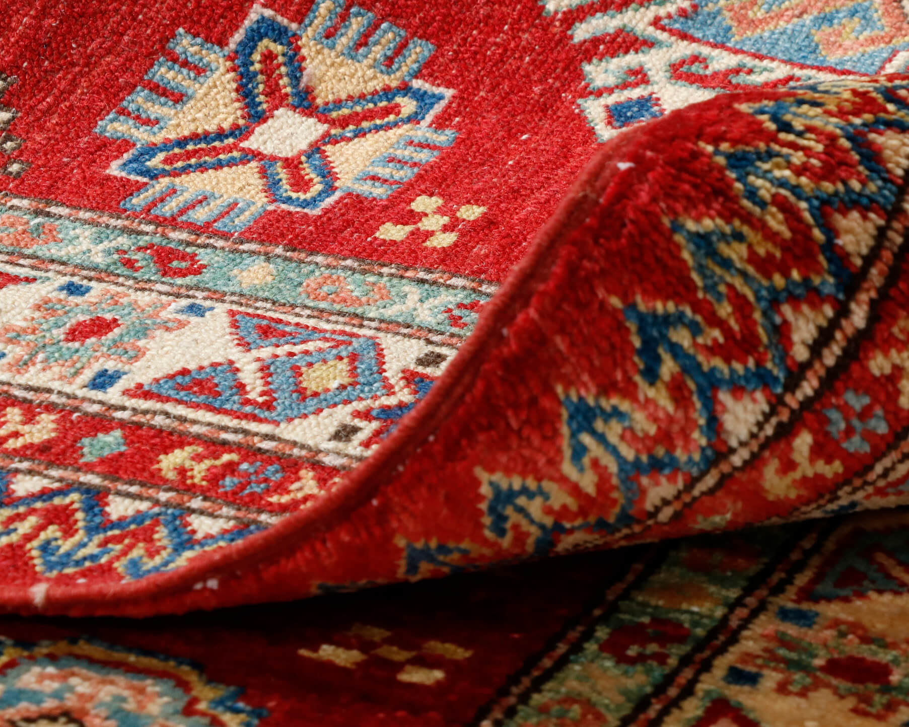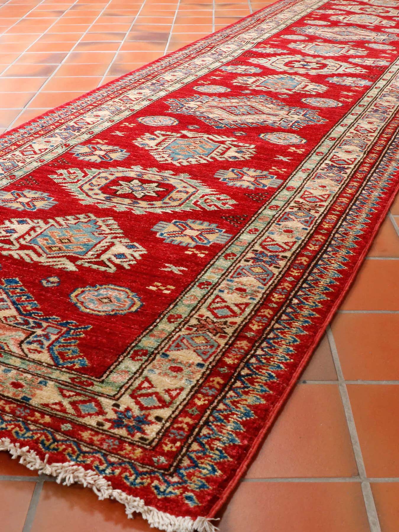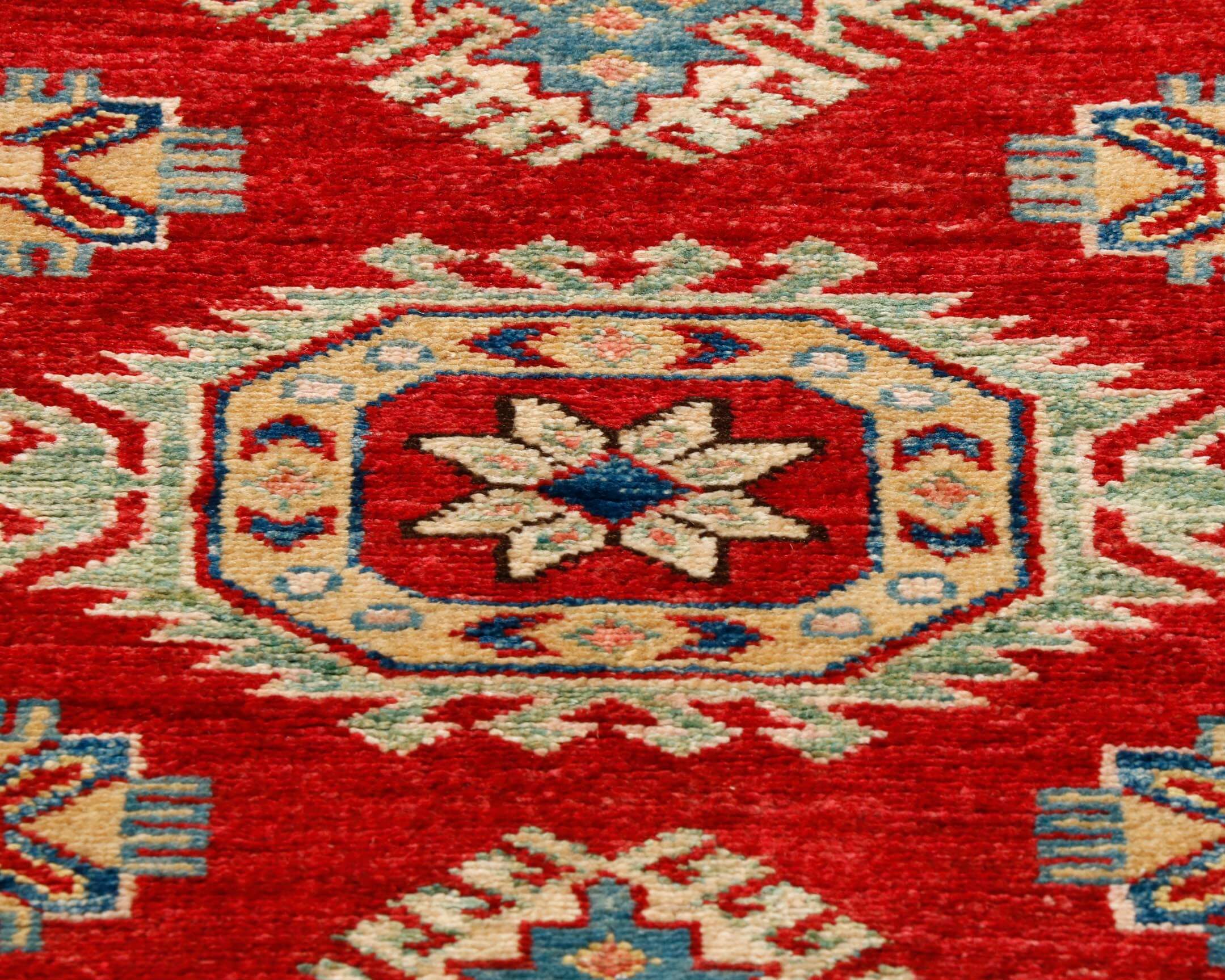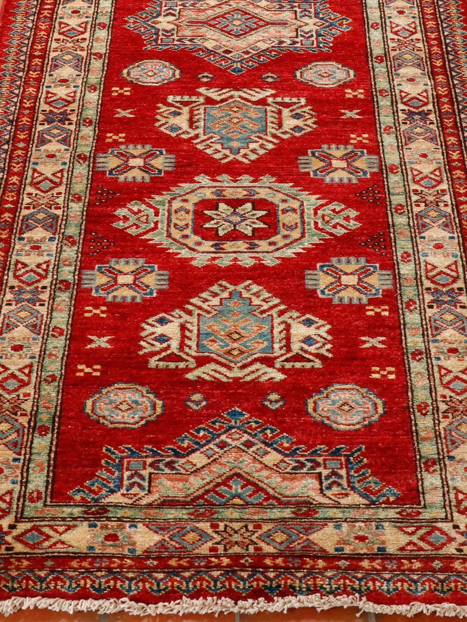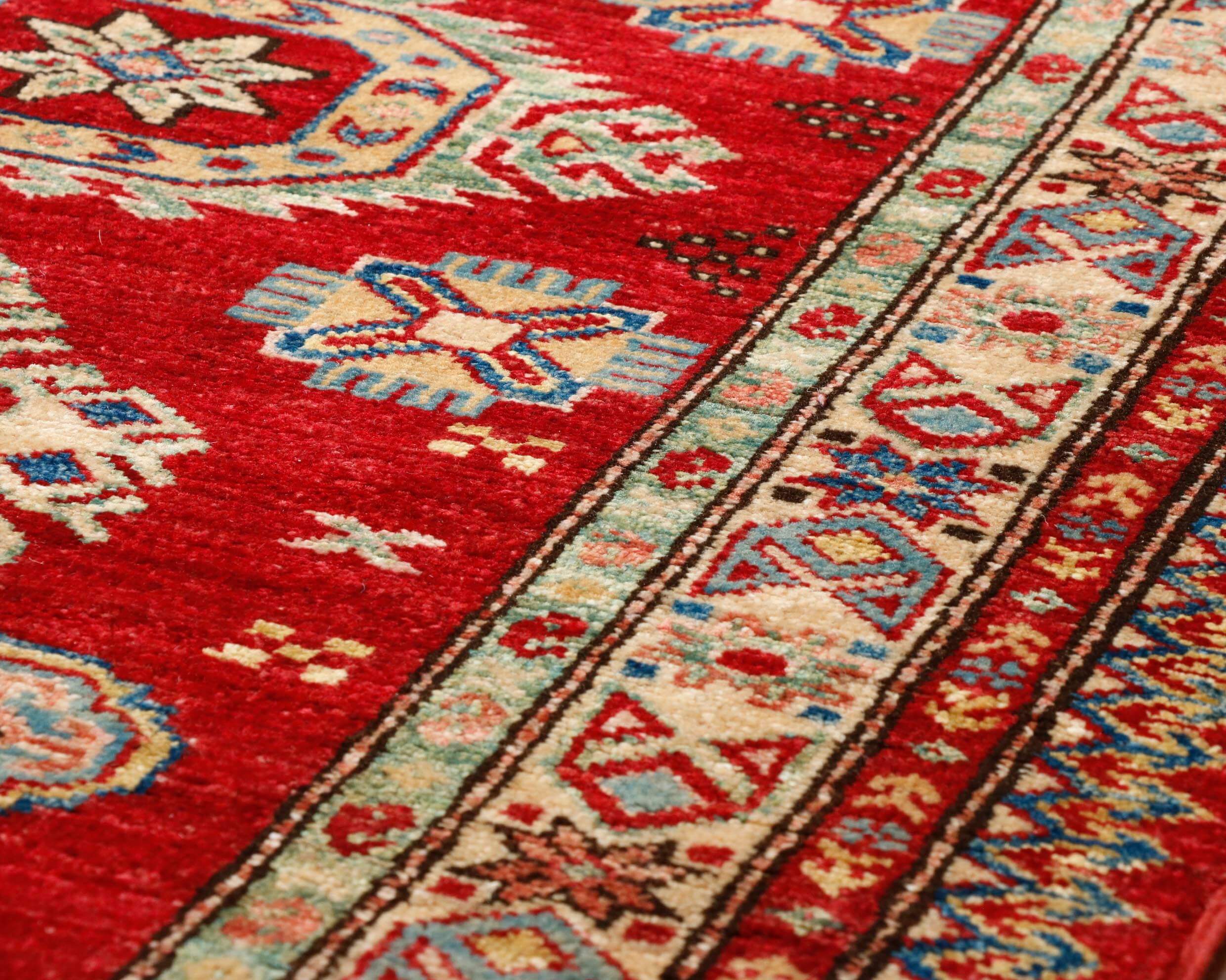 Although Kazaks are traditionally hand-knotted in Afghanistan, the design originates from the Caucasus. The short pile emphasises the design's sharpness. Each piece is made from Afghan wool, often spun in Ghazni. Afghan wool is generally slightly coarser and more curly than other wools, making it excellent for carpet weaving. Afghan Kazak carpets are typically made with bold geometric designs in strong, vibrant colours, such as rich reds, warm terracotta, shades of blue, and soft golds and creams.