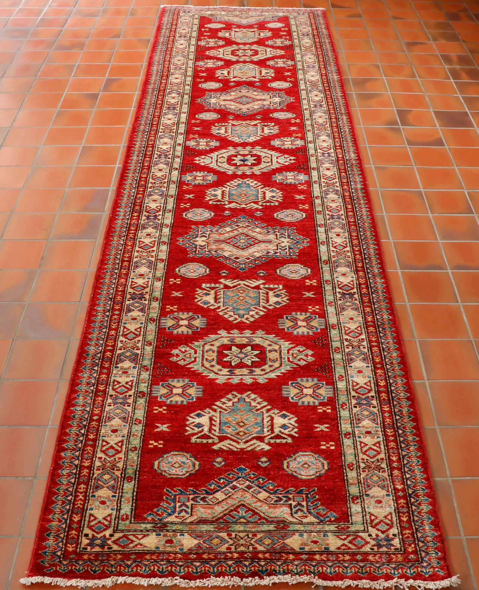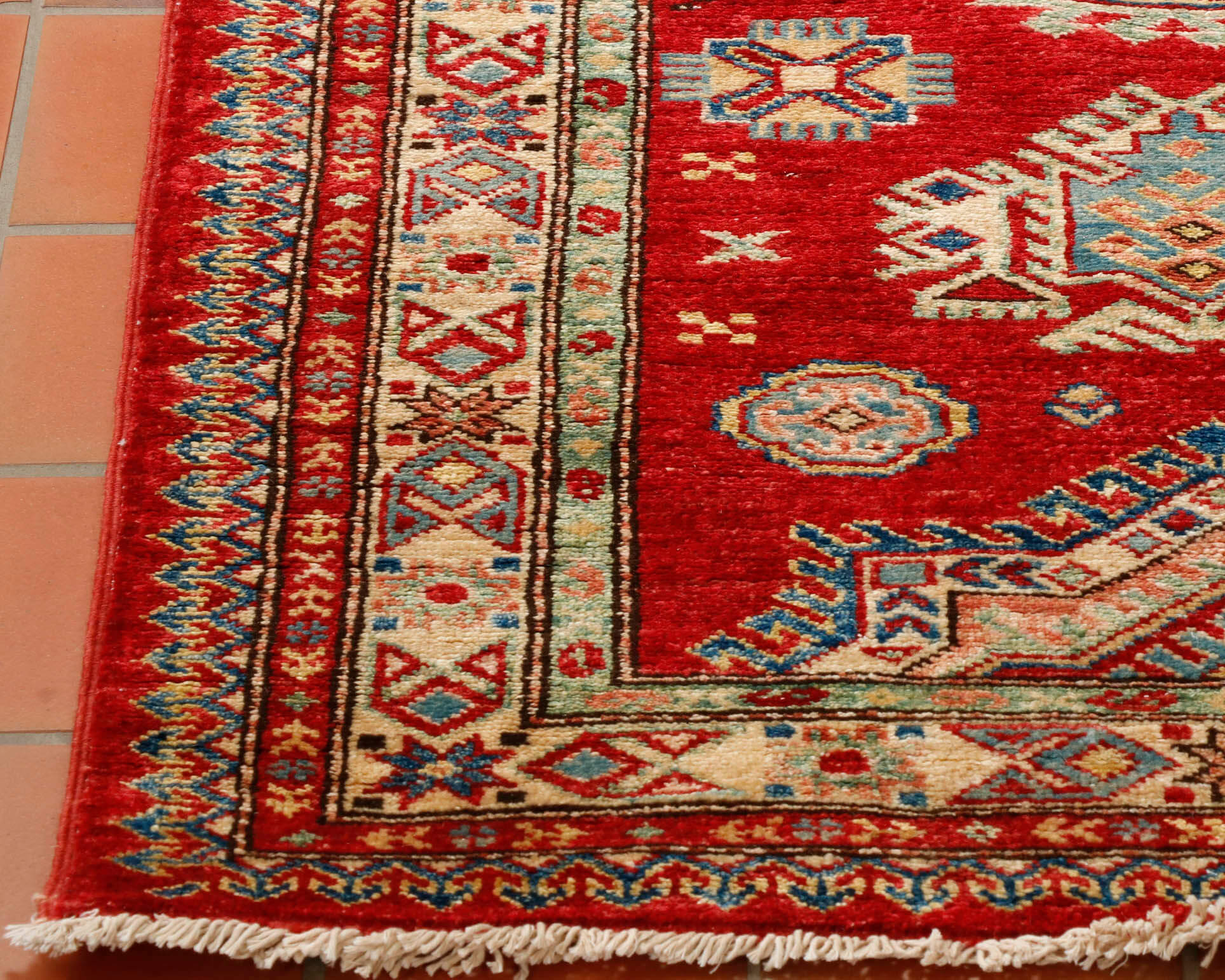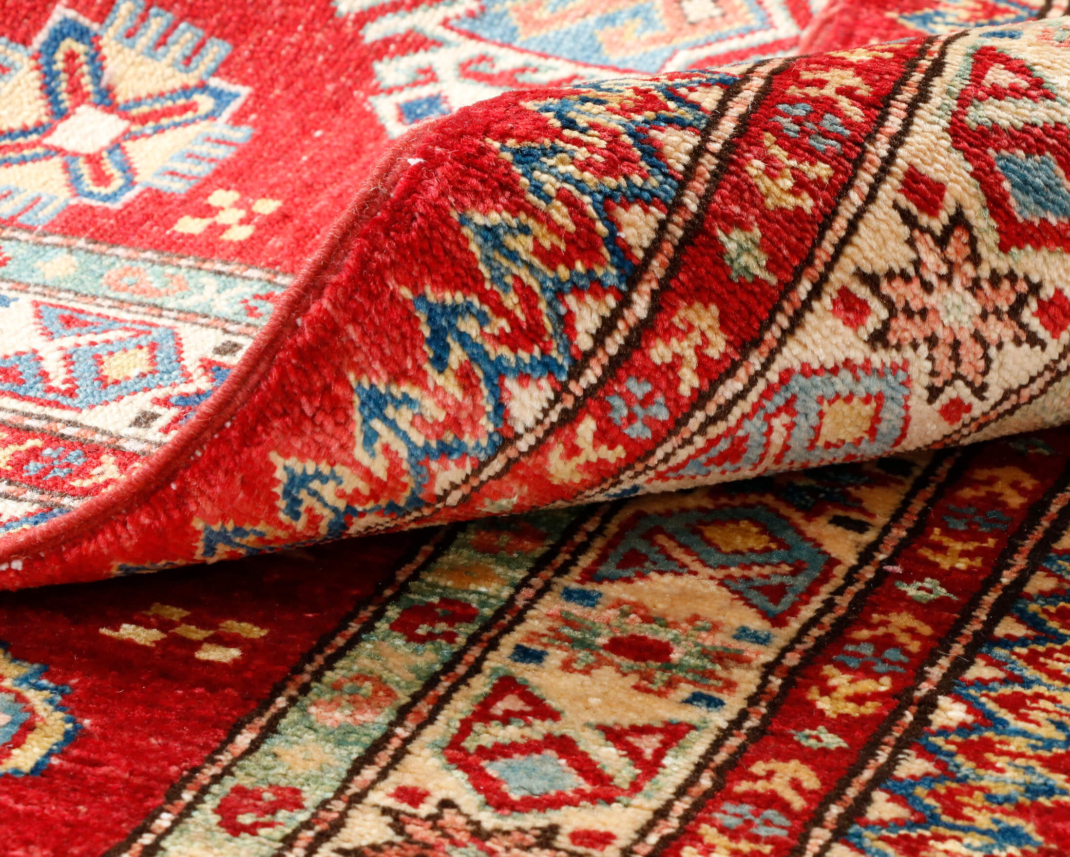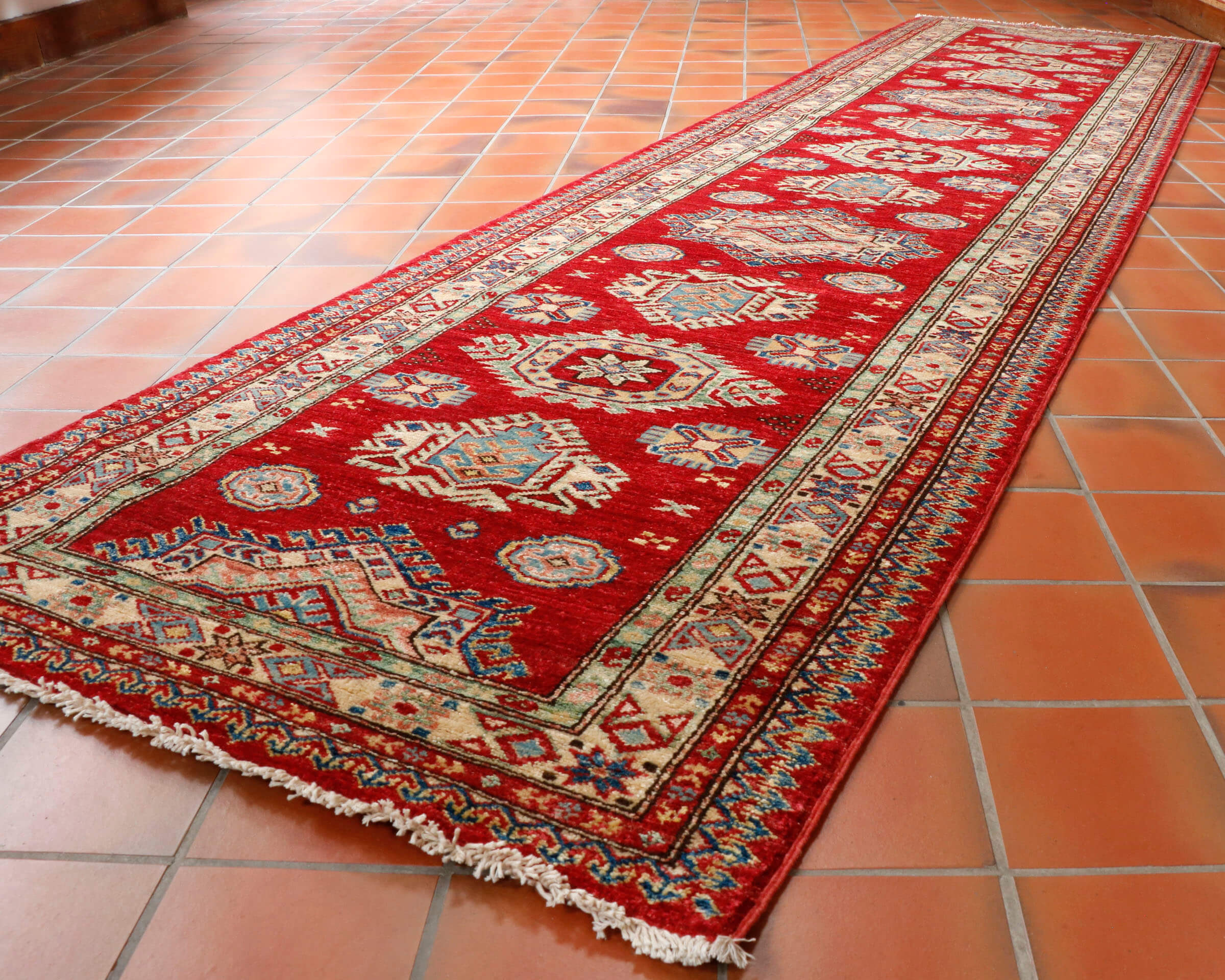 Although Kazaks are traditionally hand-knotted in Afghanistan, the design originates from the Caucasus. The short pile emphasises the design's sharpness. Each piece is made from Afghan wool, often spun in Ghazni. Afghan wool is generally slightly coarser and more curly than other wools, making it excellent for carpet weaving. Afghan Kazak carpets are typically made with bold geometric designs in strong, vibrant colours, such as rich reds, warm terracotta, shades of blue, and soft golds and creams.