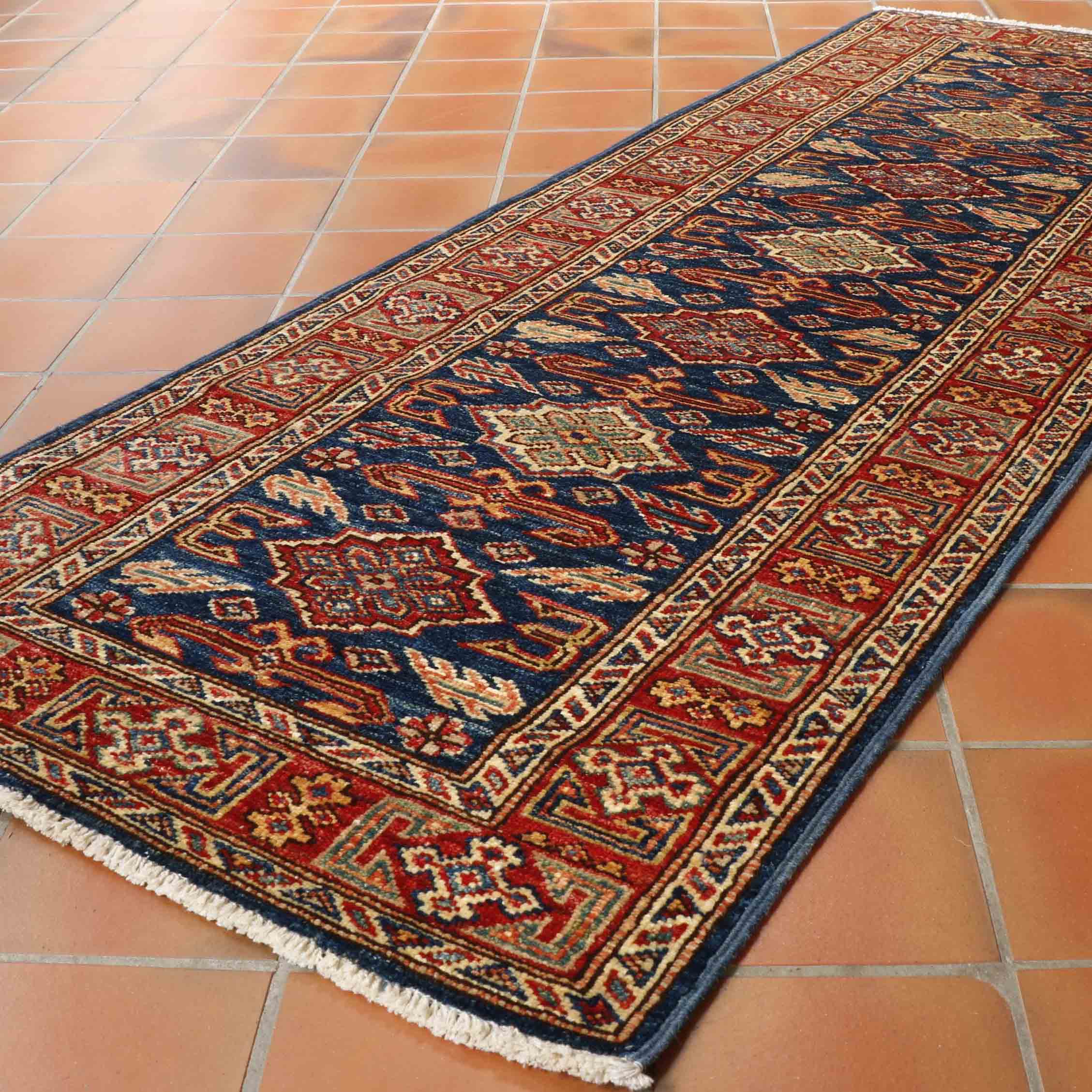 A handmade runner like this fine Afghan Kazak can transform your hallway, corridor, or landing. This piece's colouring is very rich, and the dark blue background is certainly very practical. Moreover, this runner is of fine quality and therefore suitable for heavy traffic.