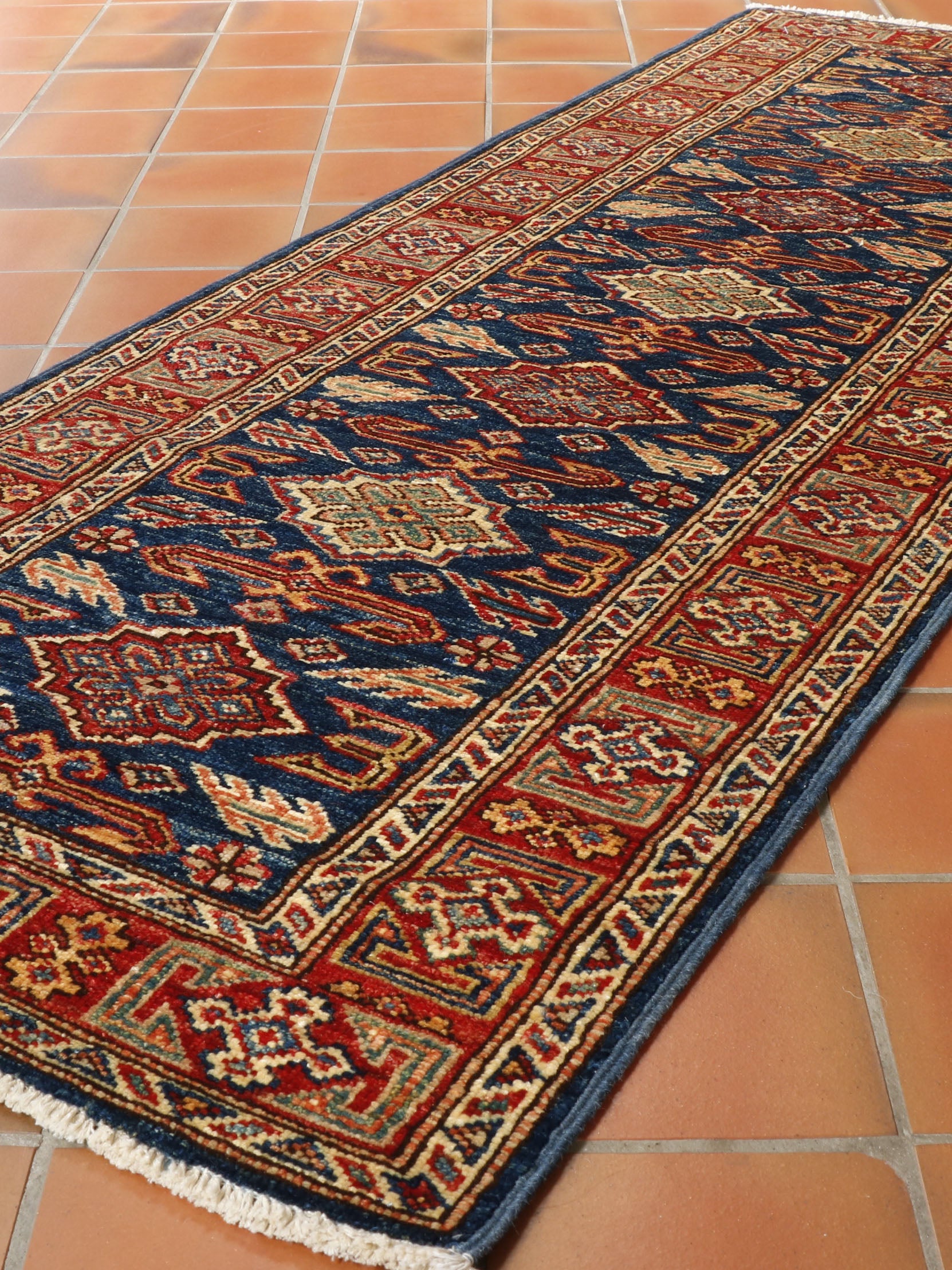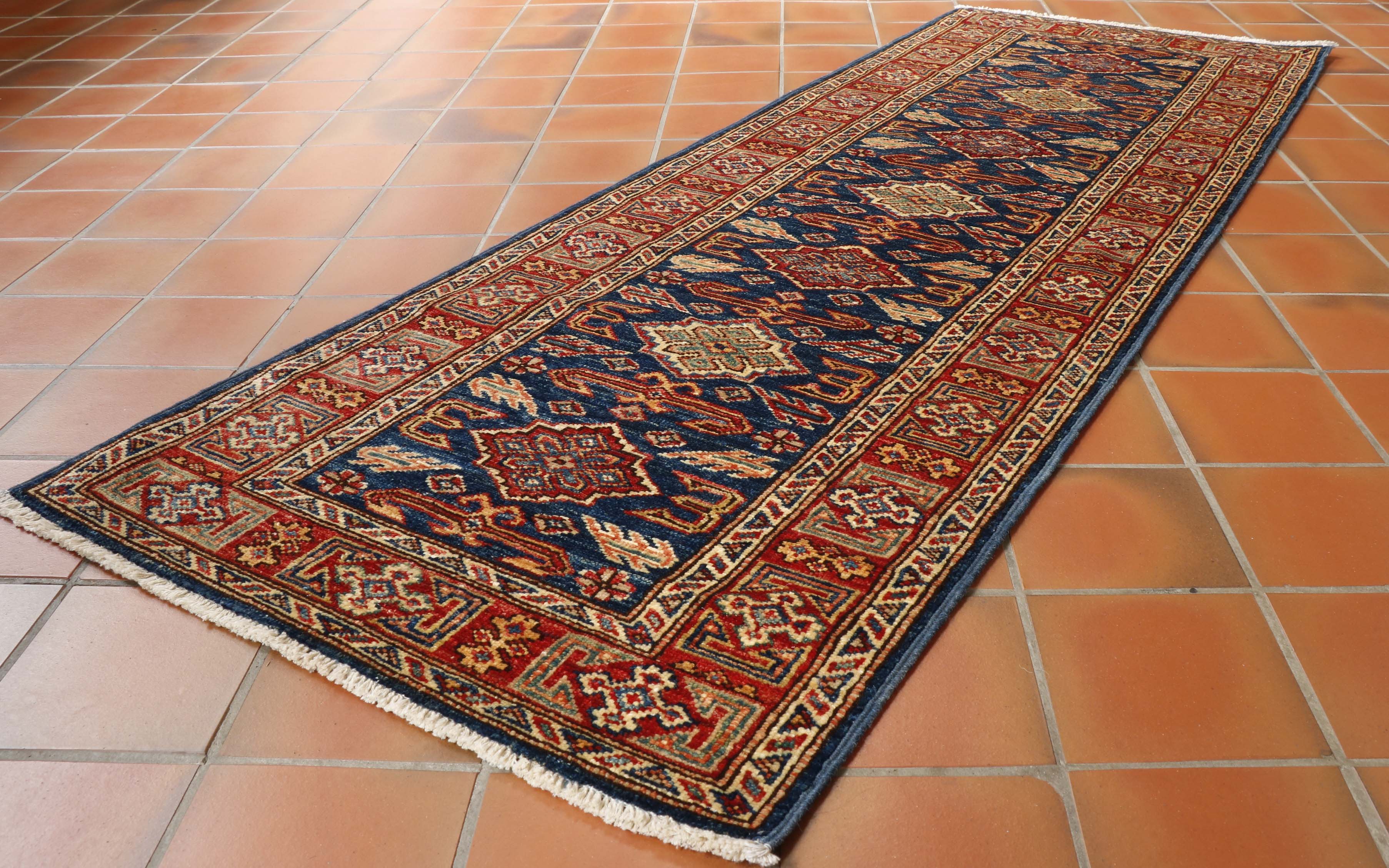 A handmade runner like this fine Afghan Kazak can transform your hallway, corridor, or landing. This piece's colouring is very rich, and the dark blue background is certainly very practical. Moreover, this runner is of fine quality and therefore suitable for heavy traffic. Please click the hyperlinks below in gold if you want additional information. Although Kazaks are hand-knotted in Afghanistan, the design originates from the Caucasus. The short pile emphasises the sharpness of the pattern. Each piece is made using excellent Afghan wool, usually spun in Ghazni. The Afghan wool is generally slightly coarser and more curly than other wools and is...