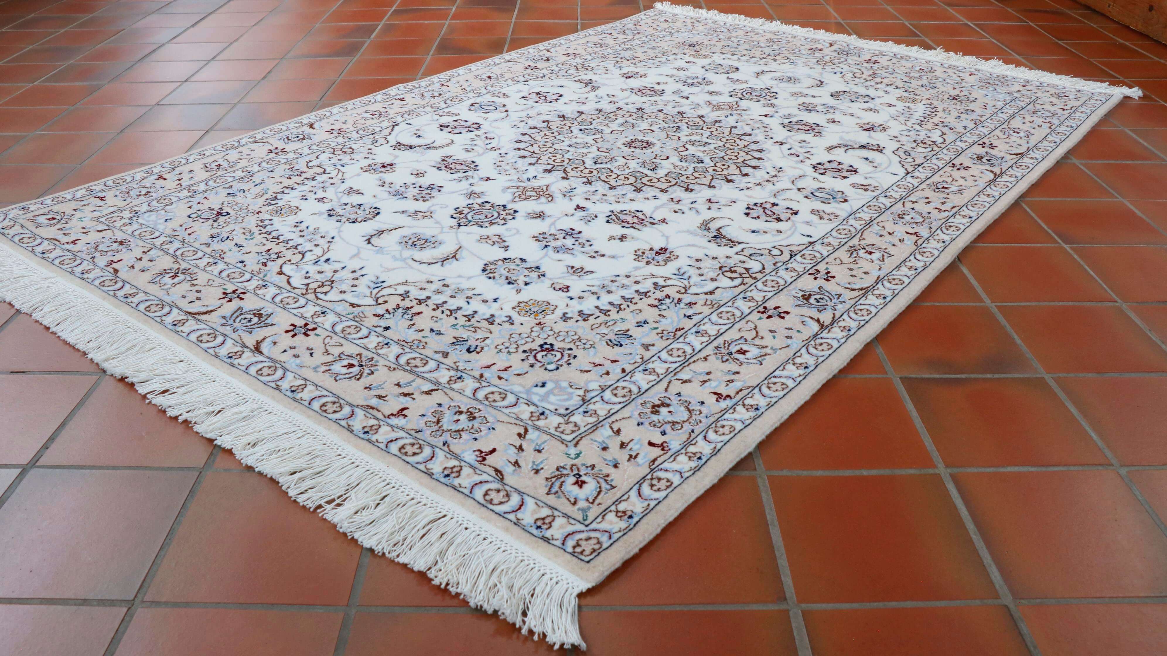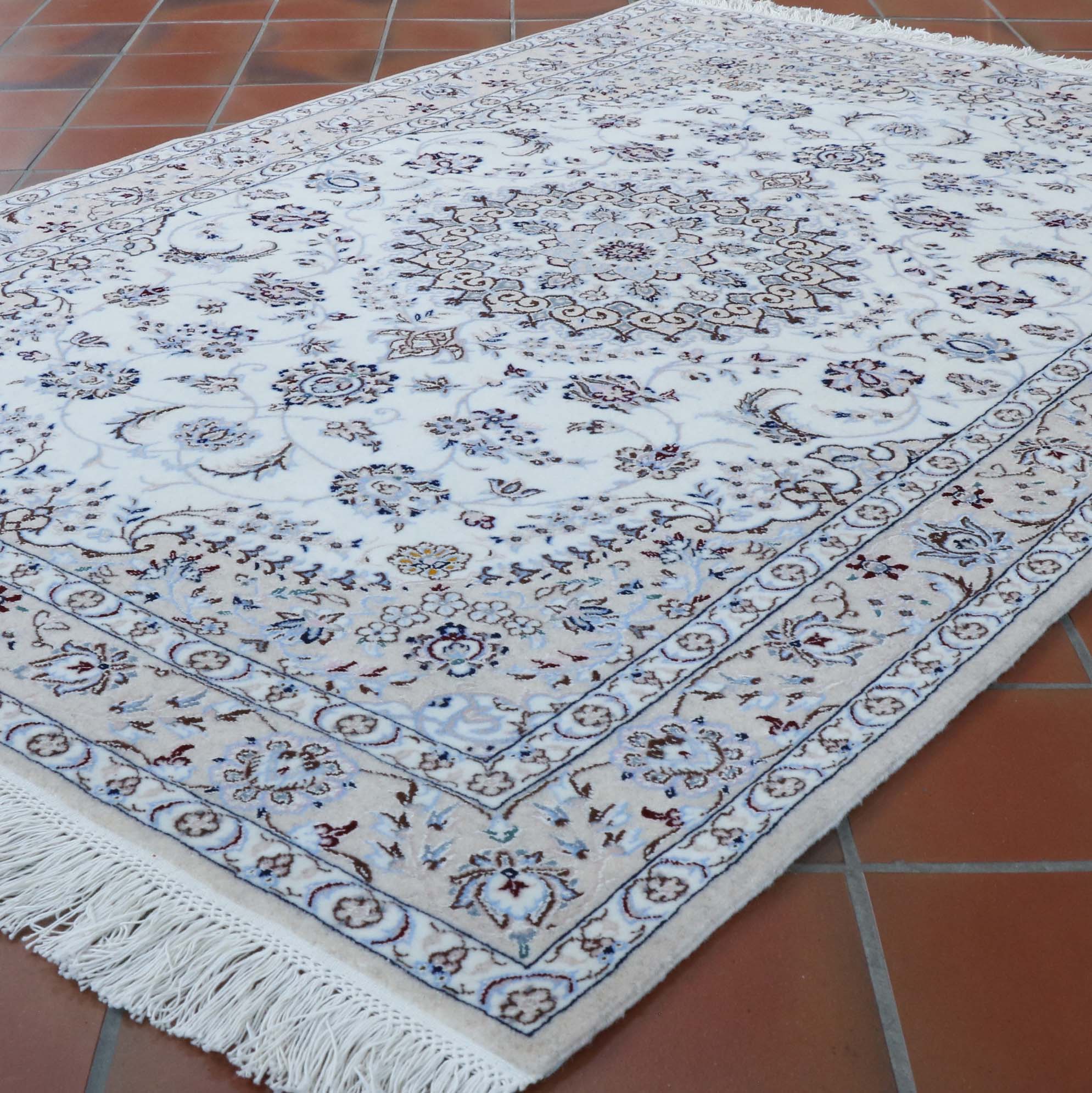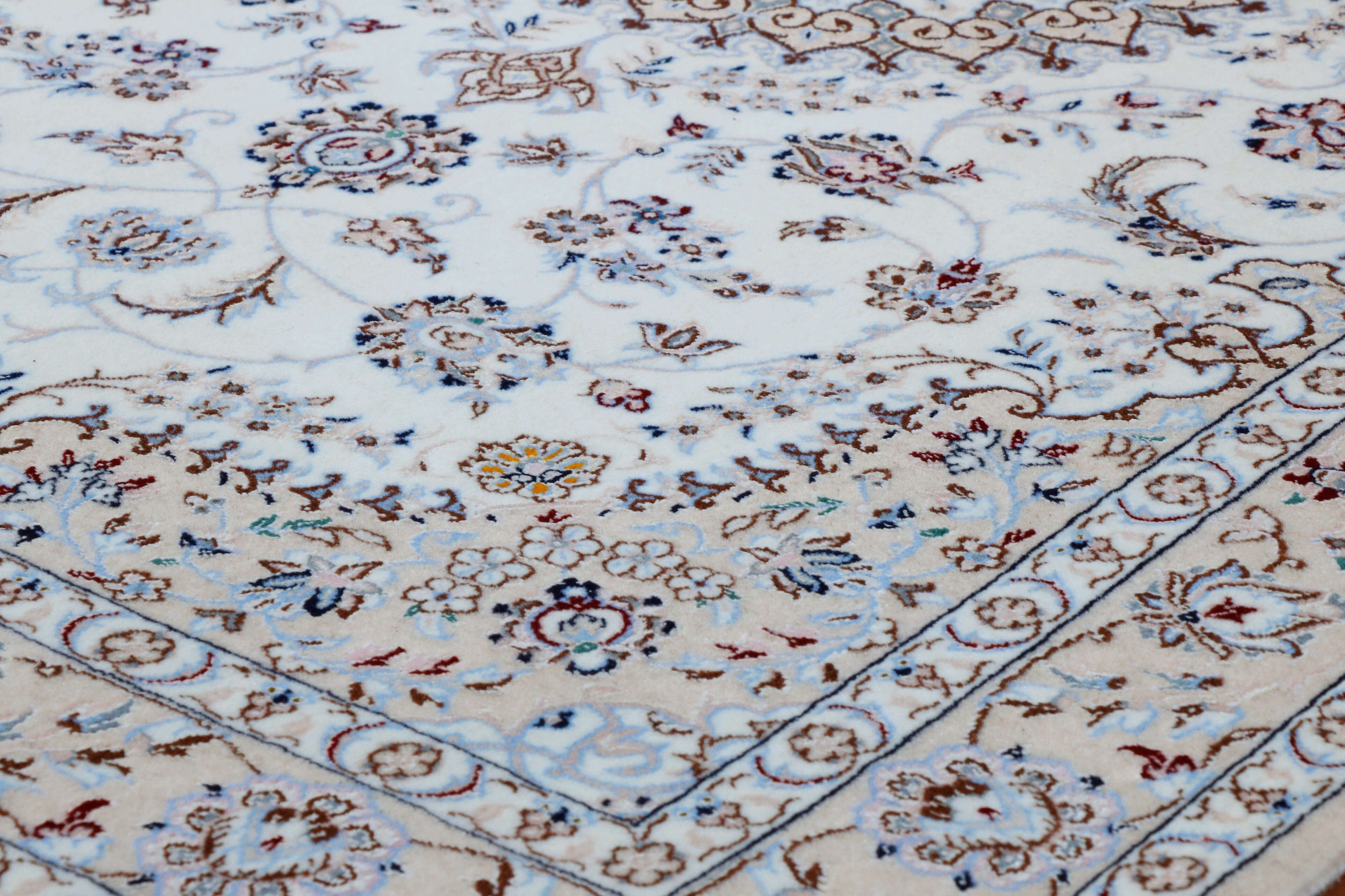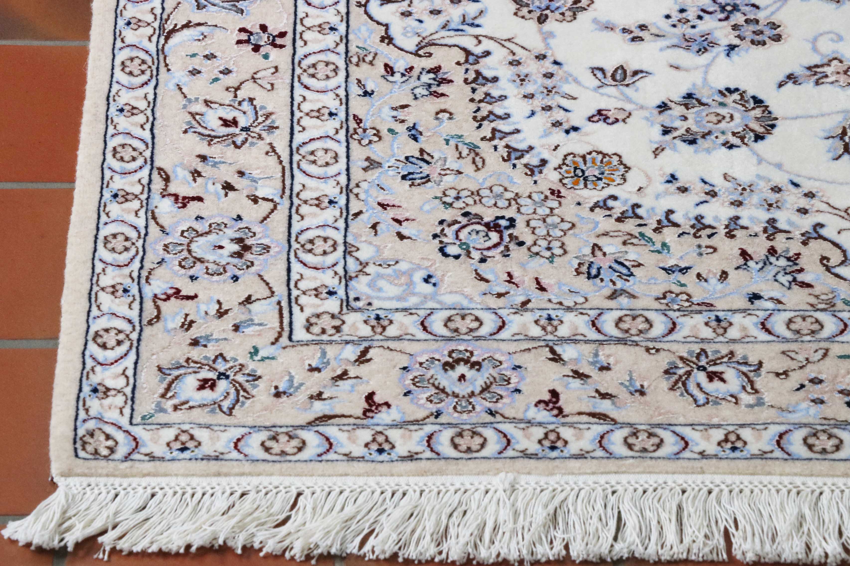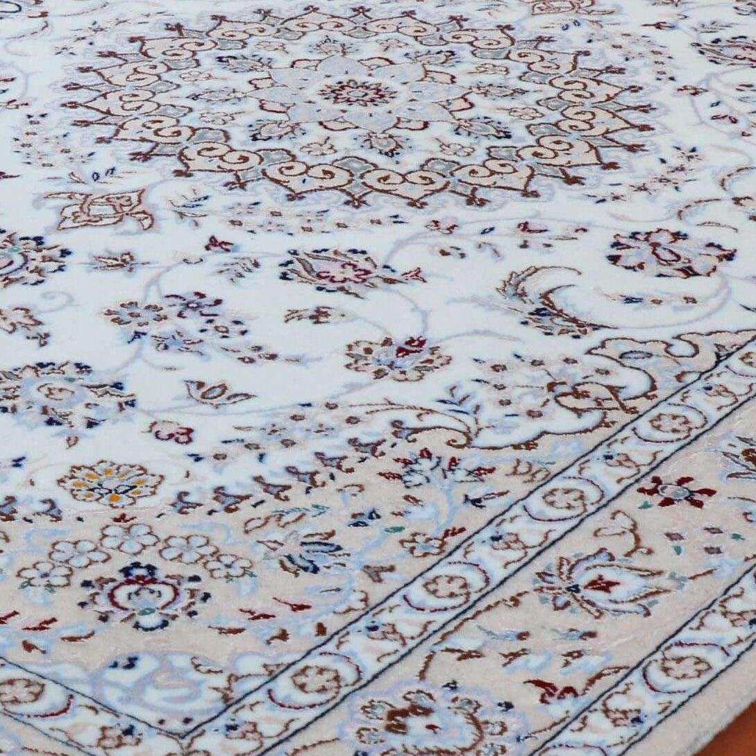 Crafted with skill and finesse, this exquisite handmade Persian Nain rug brings traditional elegance to any room with its classic style. It features an ornate central medallion and intricate details in muted blues, ivory, and ruby red, all expertly woven into a wool pile on a cotton foundation. Transcending time and trends, this timeless rug is a luxurious addition to any home.  Please click the hyperlinks in gold if you are interested in additional information. Nain is west of the Great Salt Lake, Dasht-e Kavir, 140km east of Isfahan. The town has approximately 25,000 inhabitants. It experiences hot summers and cold winters,...