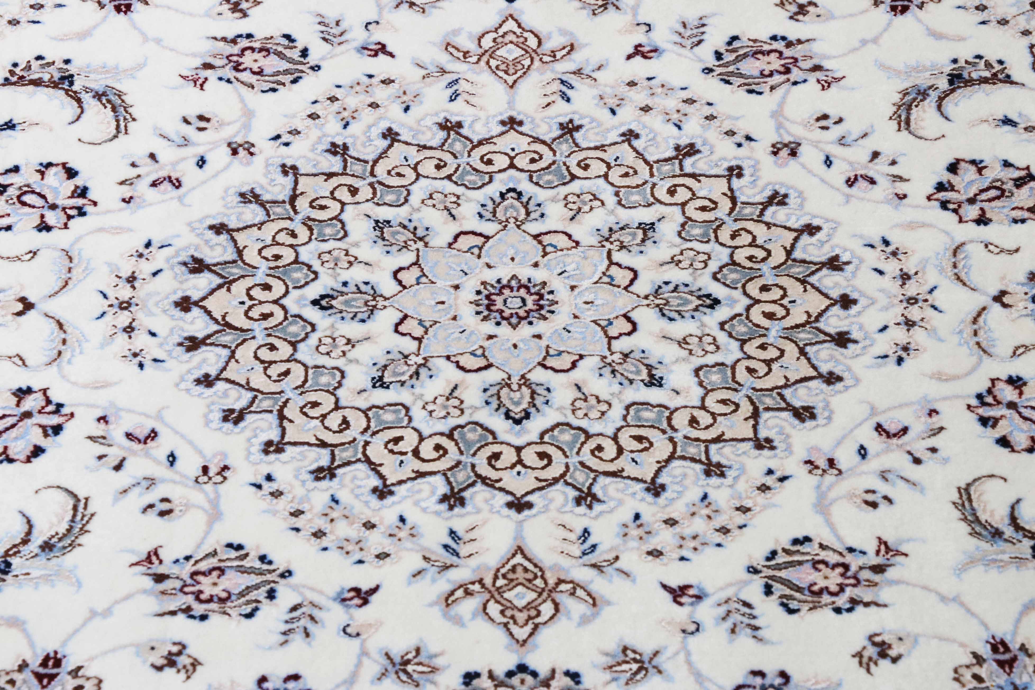 Crafted with skill and finesse, this exquisite handmade Persian Nain rug brings traditional elegance to any room with its classic style. It features an ornate central medallion and intricate details in muted blues, ivory, and ruby red, all expertly woven into a wool pile on a cotton foundation. Transcending time and trends, this timeless rug is a luxurious addition to any home.