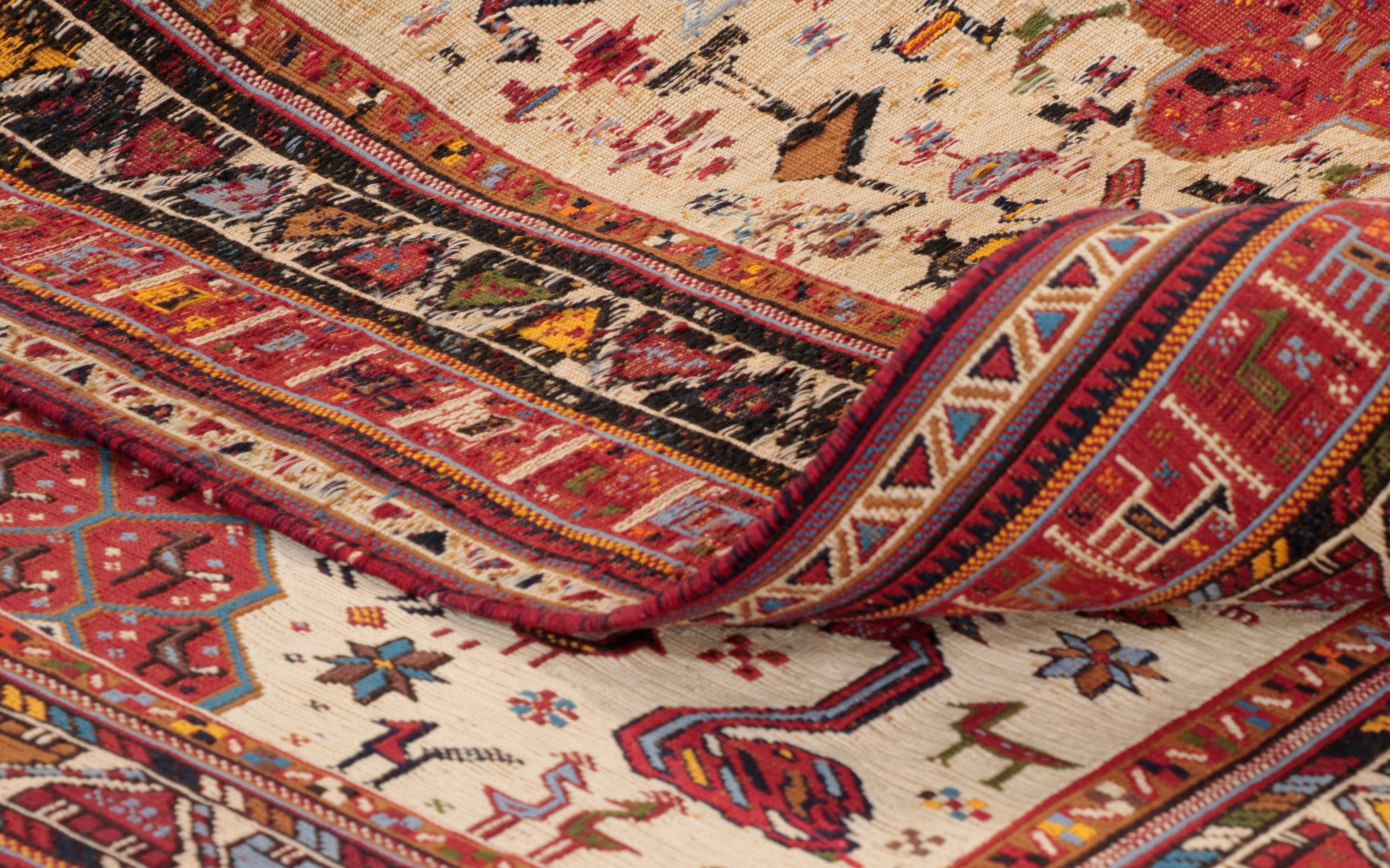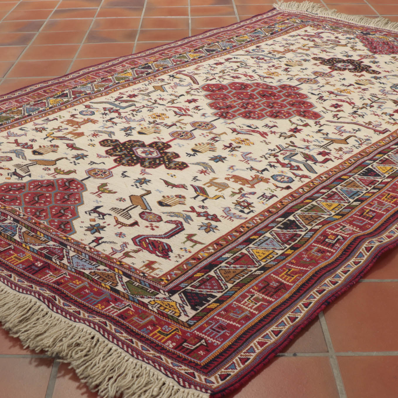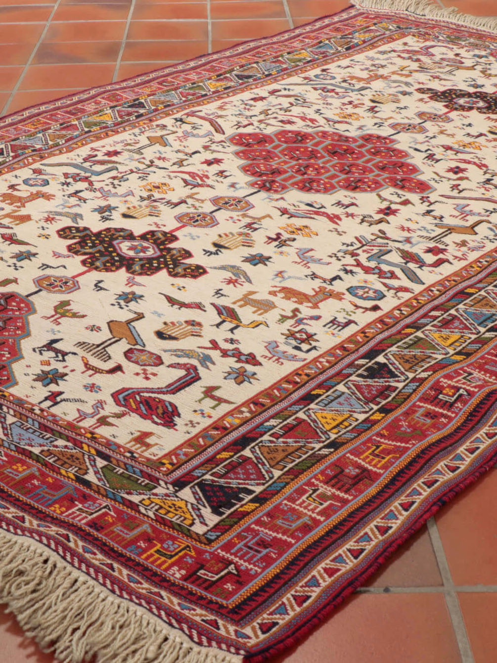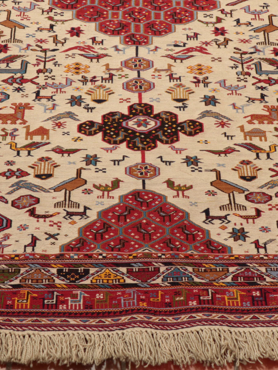 It is rare to find such a beautiful piece of this quality in such lovely colourings, and with so much character; they are very scarce. The artistry is outstanding, with so many birds and animals depicted. The background is cream, and the borders are red with touches of dark blue, gold, and light blue.