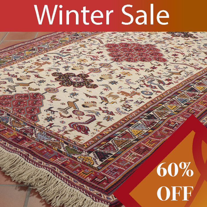 This attractive Persian Suzani rug features an embroidery stitch that creates a flat weave. It is hard to imagine how long it would take to produce a handmade piece of this quality. Suzani is derived from the Persian word "suzan," meaning "needle." This piece is full of character, with its stylised peacocks, goats, camels, fish, swans, and other curious animals. There are 121 goats on the border alone.